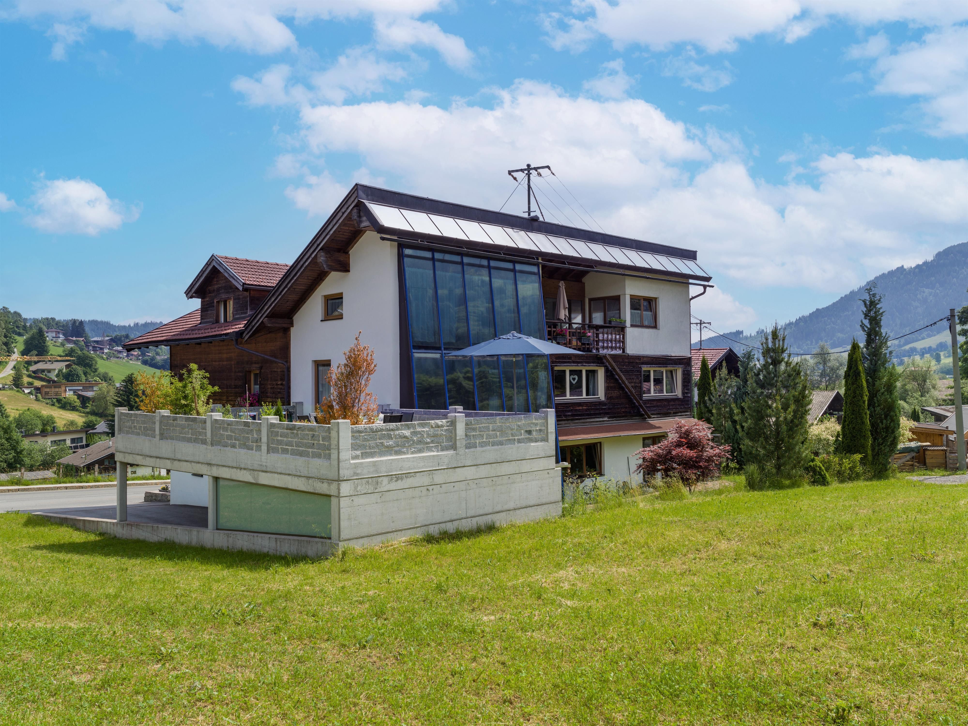 Eigene Terrasse 50 m², Balkon, Carport, Skiraum, E-Laden, eigener Eingang. Wohneinheit auf 2 Etagen.
