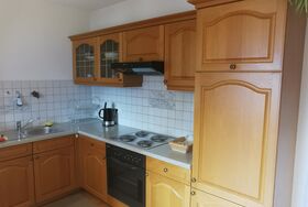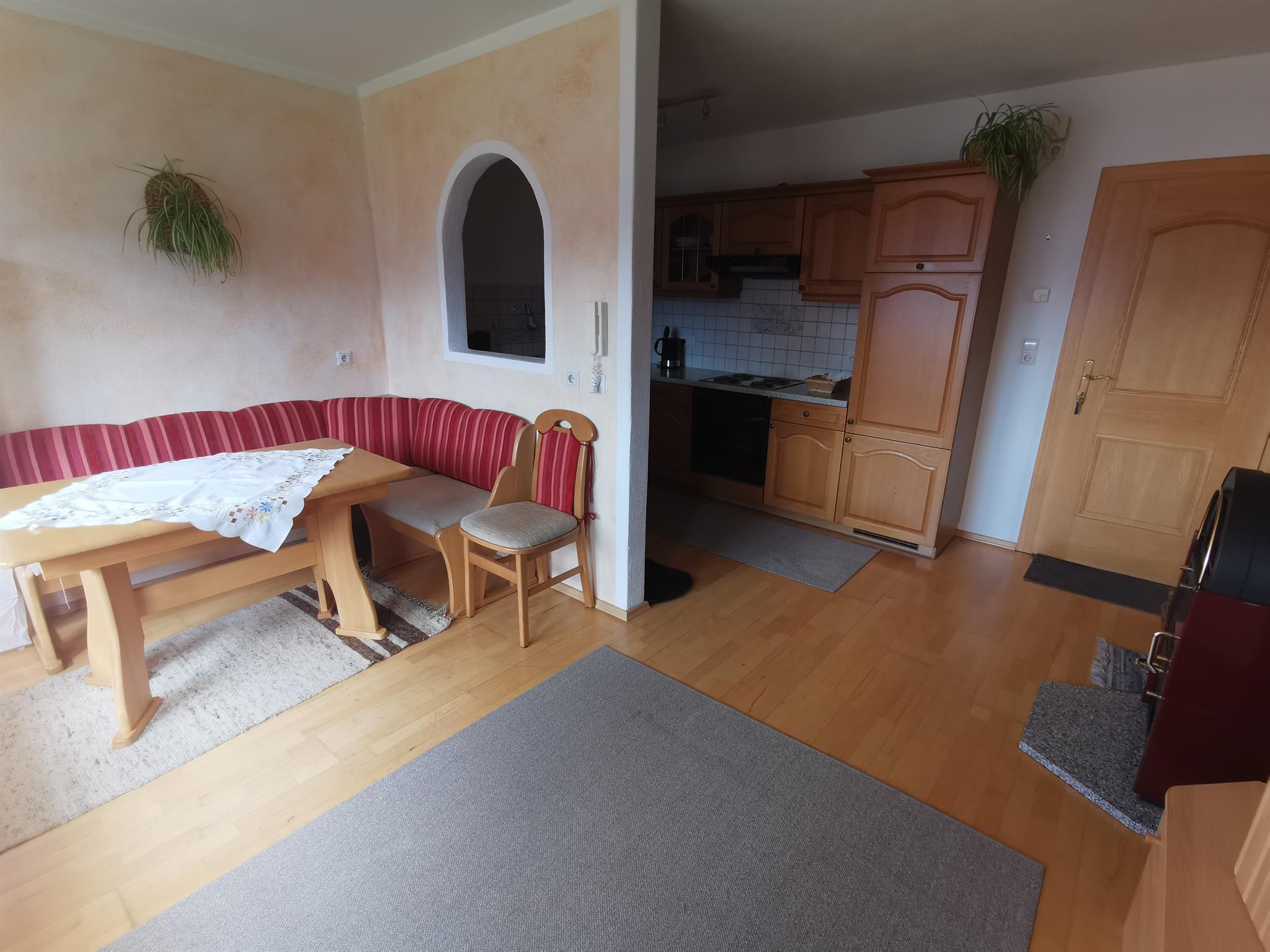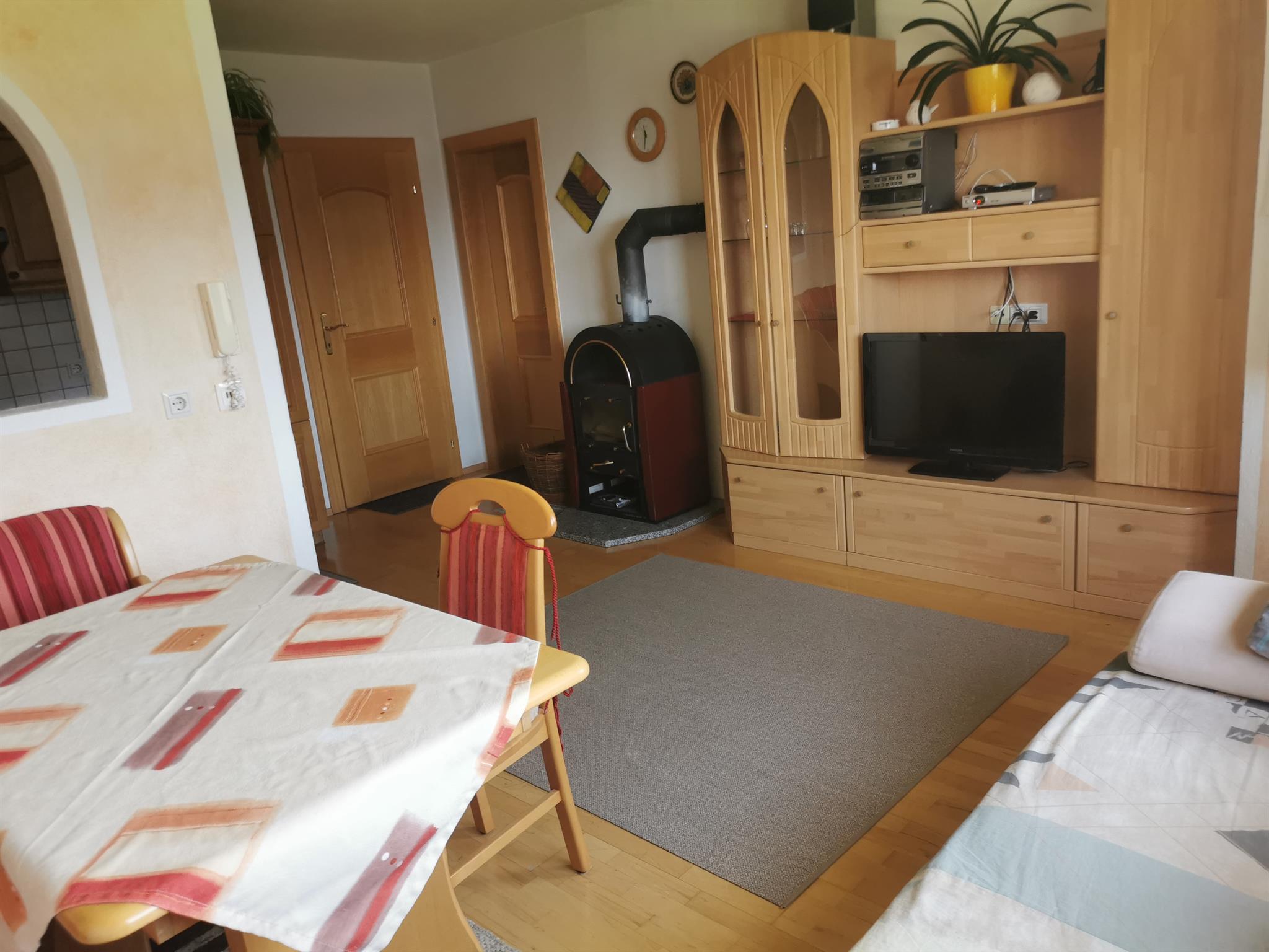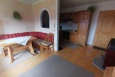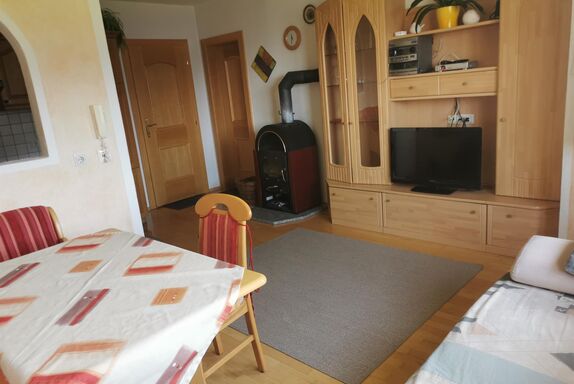 Unser Kuschelappartement ist ideal für zwei Personen. Die Ferienwohnung liegt im 1. Stock mit Balkon (Süd und Westseite). Es stehen Balkonstühle und Sonnenschirm bereit. Sie bietet einen Wohnraum mit Kochnische, Doppelzimmer (Bettwäsche vorhanden) sowie Dusche (Handtücher liegen bereit) und WC. Die Kochnische beinhaltet Koch- und Küchengeschirr, Gläser, Herd mit Backofen und vier Herdplatten, Kühlschrank, Kaffeemaschine, Wasserkocher und Eierkocher. Der Wohnraumteil ist mit einem Esstisch, Couch und Wohnwand eingerichtet (SAT-TV und Radio mit CD vorhanden). Der kleine Schwedenofen bereitet so manches wohlige Gefühl (Holz wird zur Verfügung gestellt).