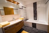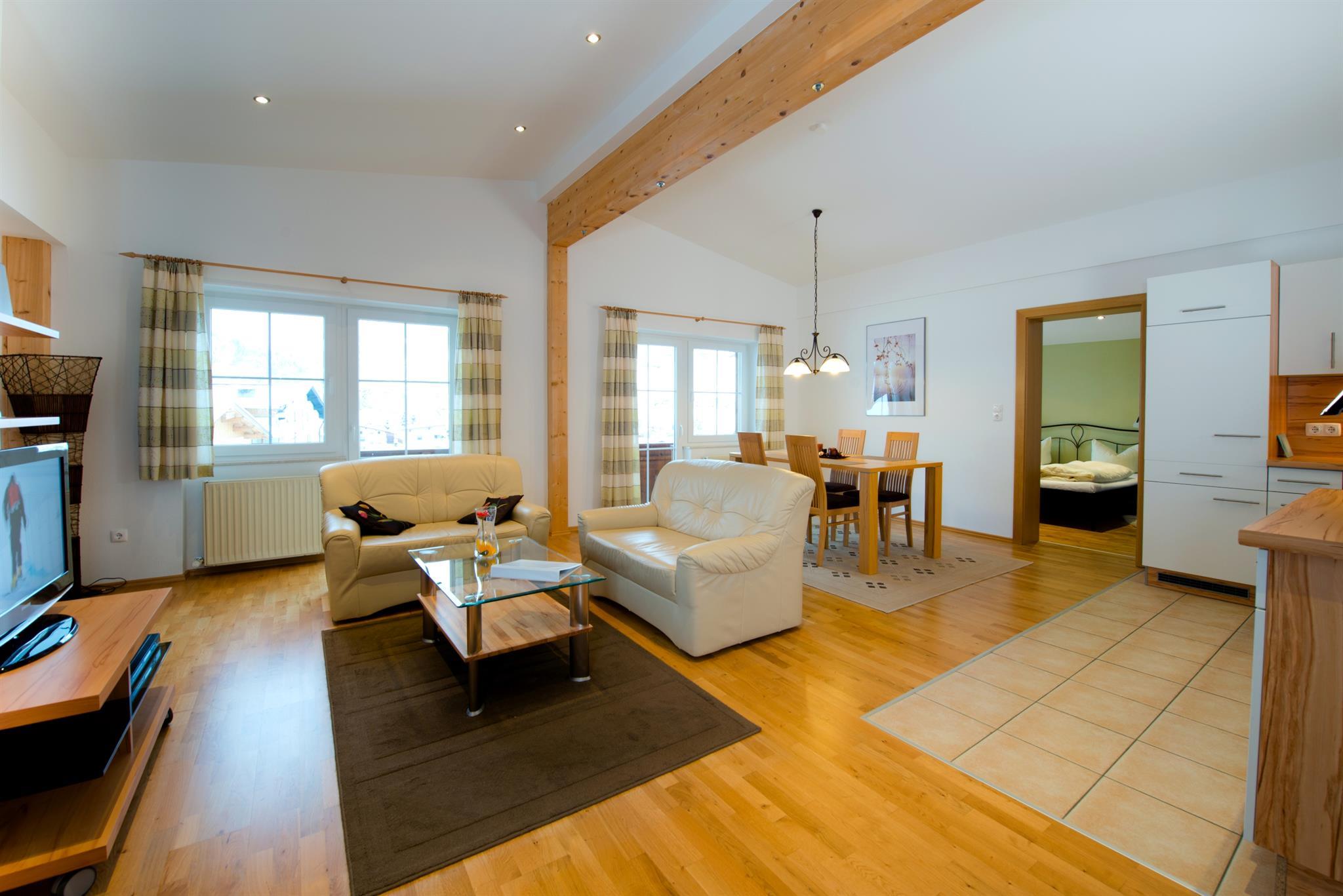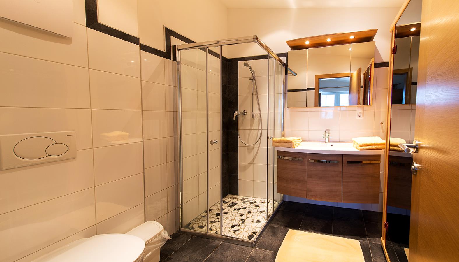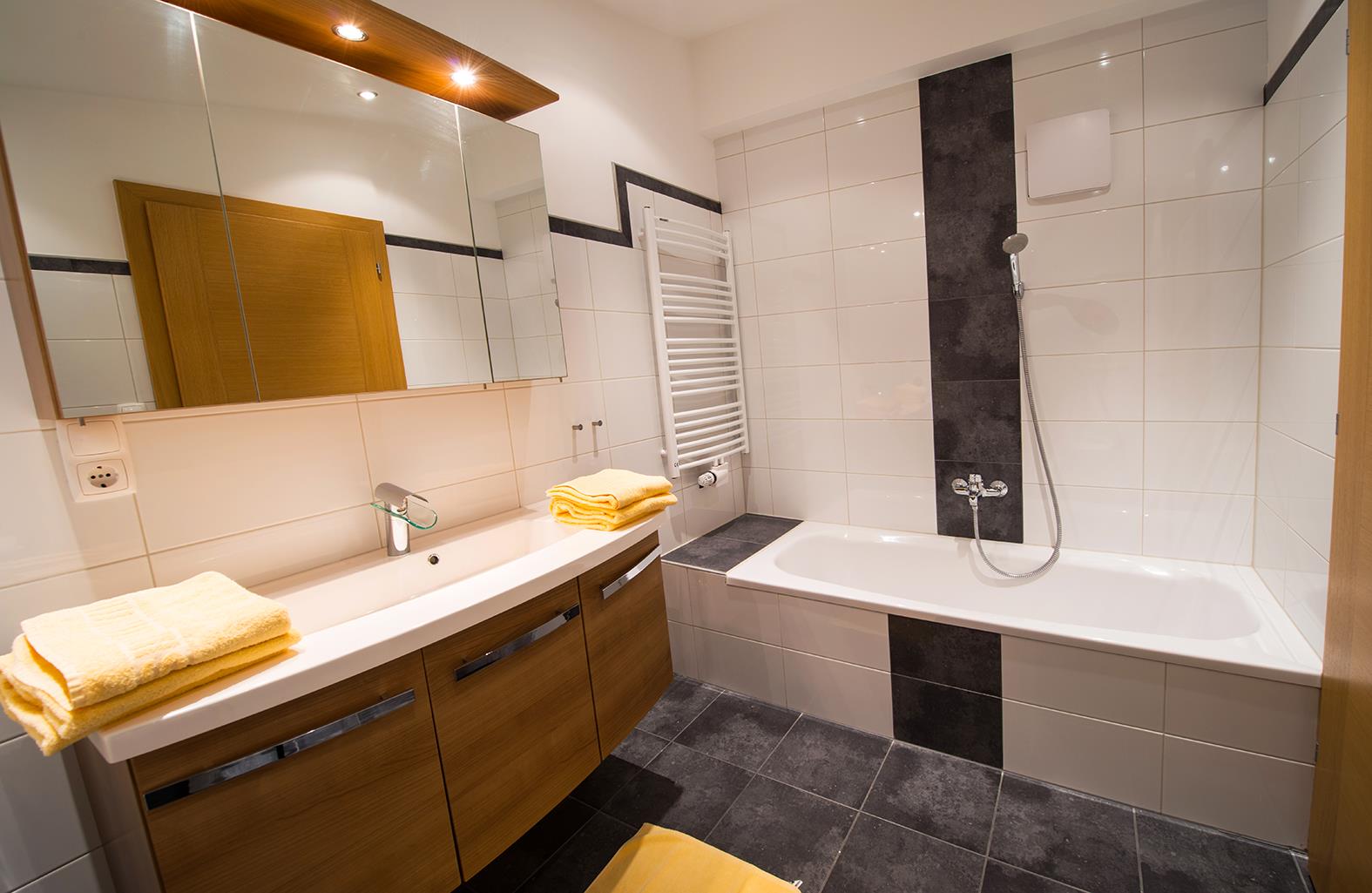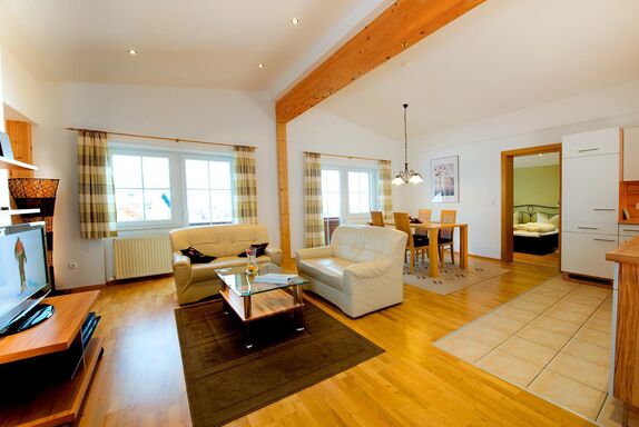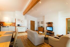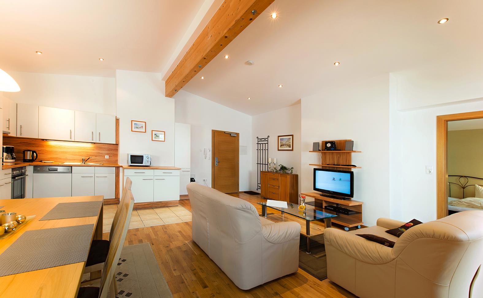 Apartment mit 2 Schlafzimmern, 2 Bädern (Dusche/WC, Badewanne/WC), privater Physioterm-Wellnesskabine, privatem Balkon mit herrlicher Aussicht großzügiger Wohnraum mit Sitzecke, Flachbildschirm, DVD-Player, Stereoanlage, kostenloses WLAN komplett ausgestattete Küche mit Geschirrspüler, Kühlschrank mit Gefrierfach, Elektroherd mit Backofen, Mikrowelle, Kaffeemaschine, Wasserkocher, Toaster zusätzliches SAT-TV in einem Schlafzimmer Waschmaschine, Bügelbrett, Bügeleisen in jedem Apartment Eichenparkettboden für angenehmes Wohnklima