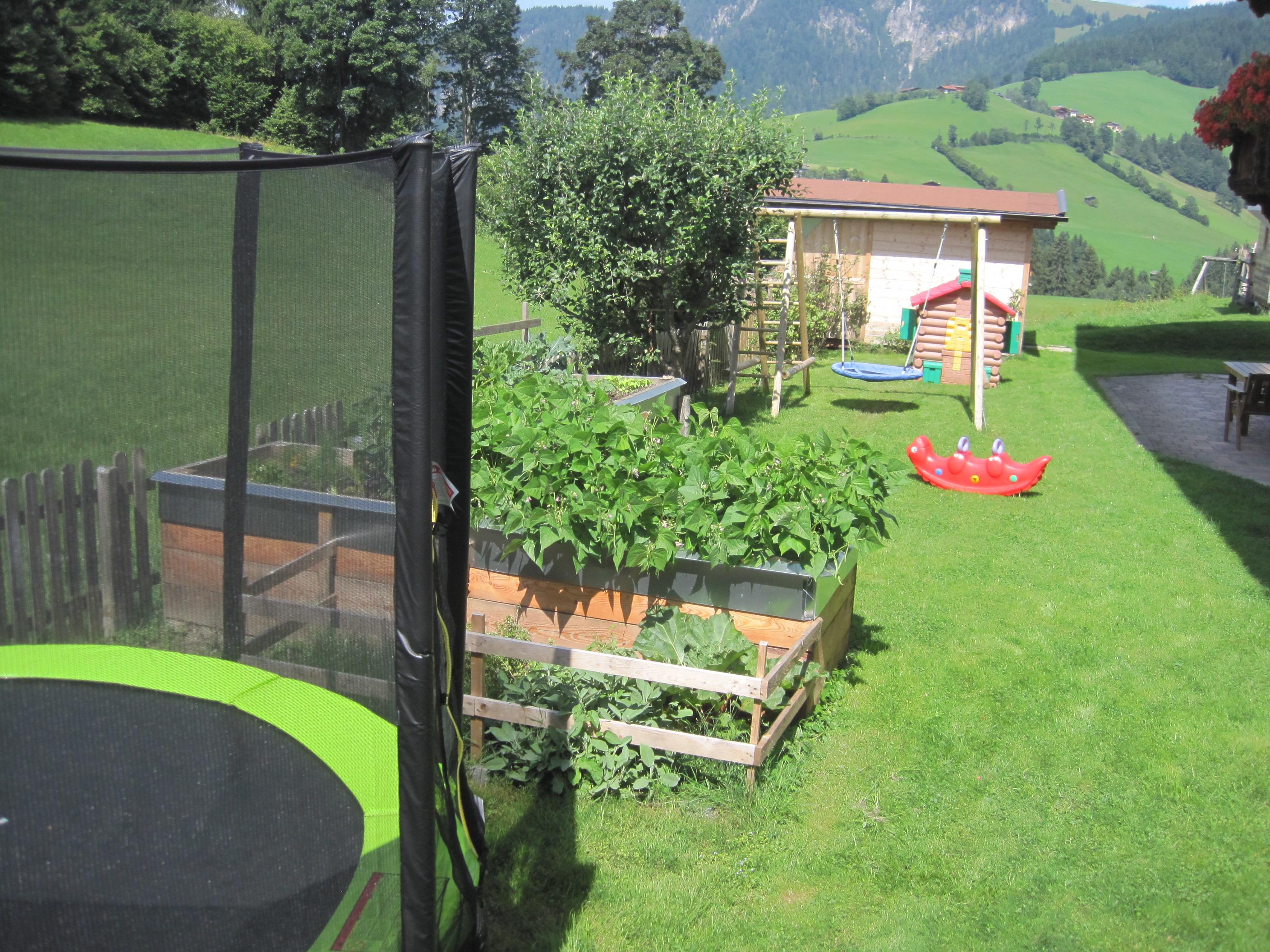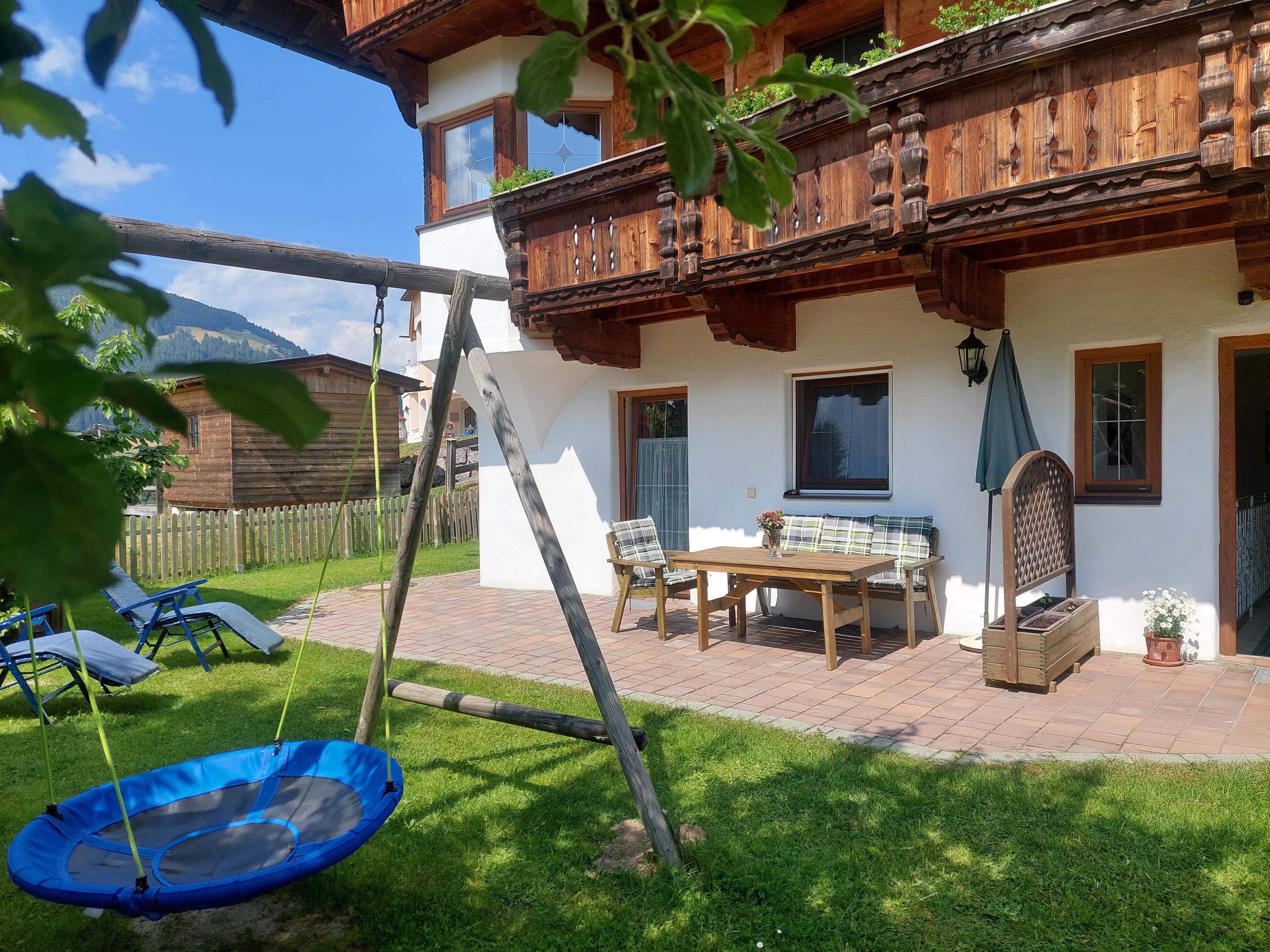 Die gemütlichen Terrassen mit Liegewiese laden zum Entspannen ein und für die Kinder haben wir einen schönen Spielplatz.