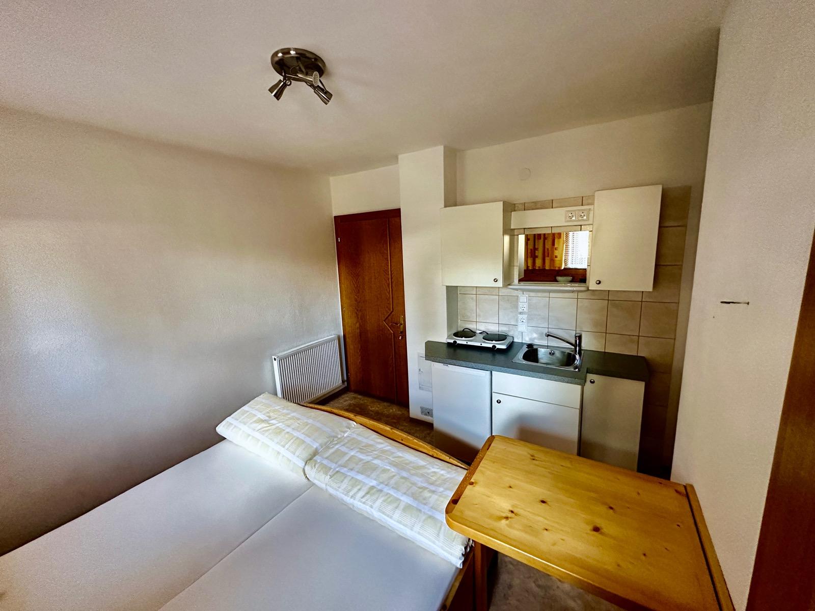 Studioappartement mit kleiner Küchenzeile. (2 Herdplatten, Kühlschrank, Kaffeemaschine)