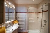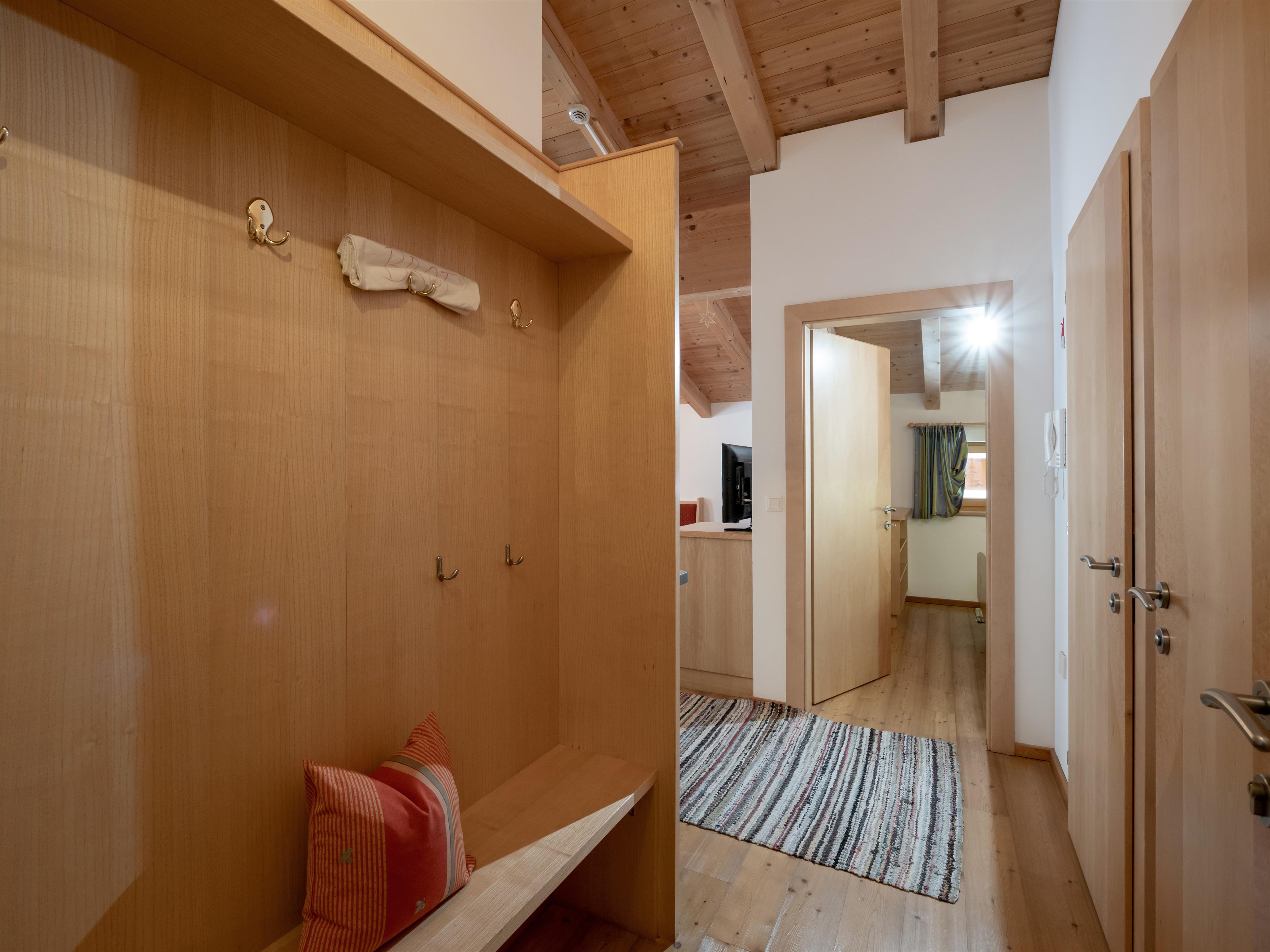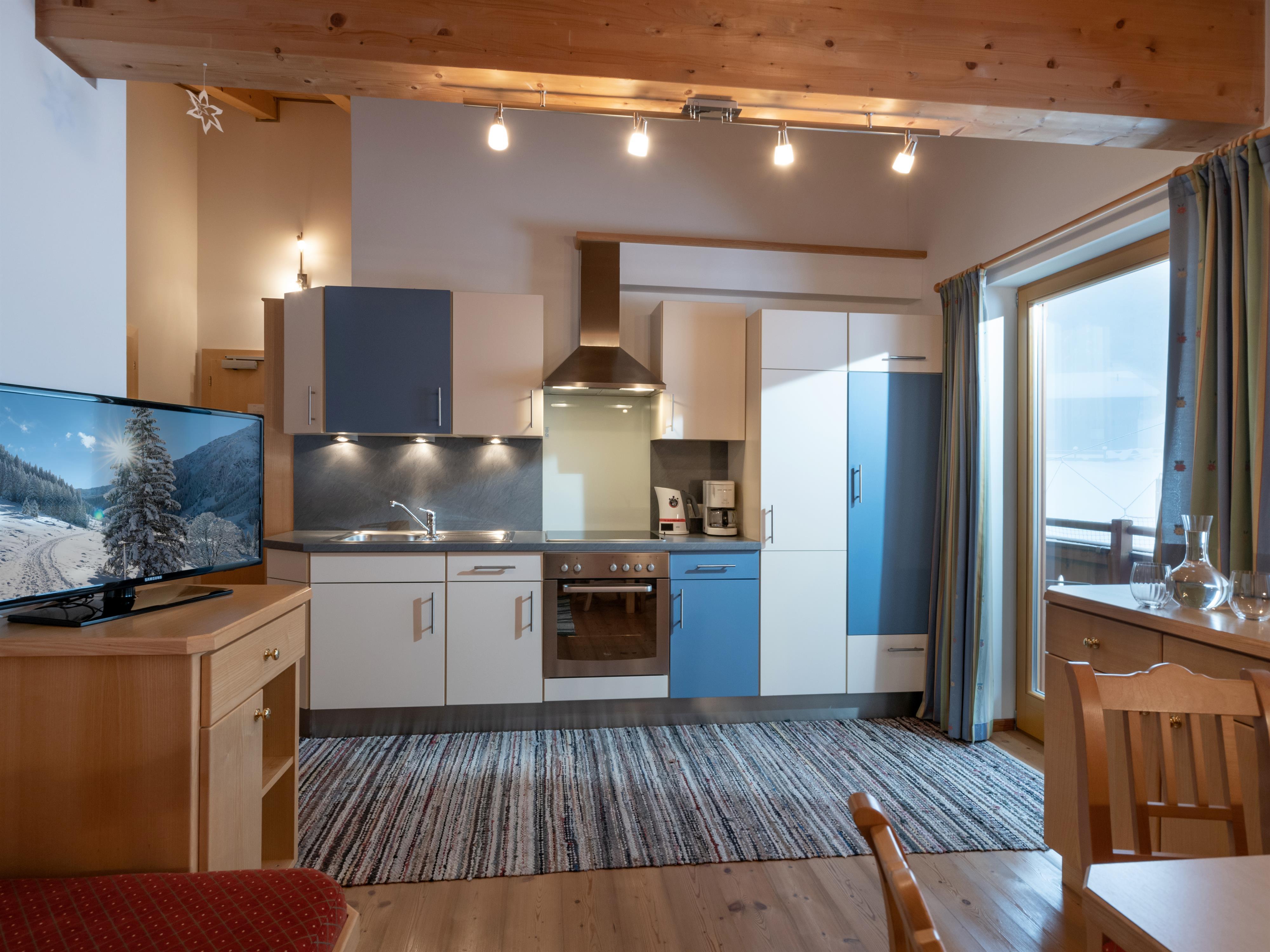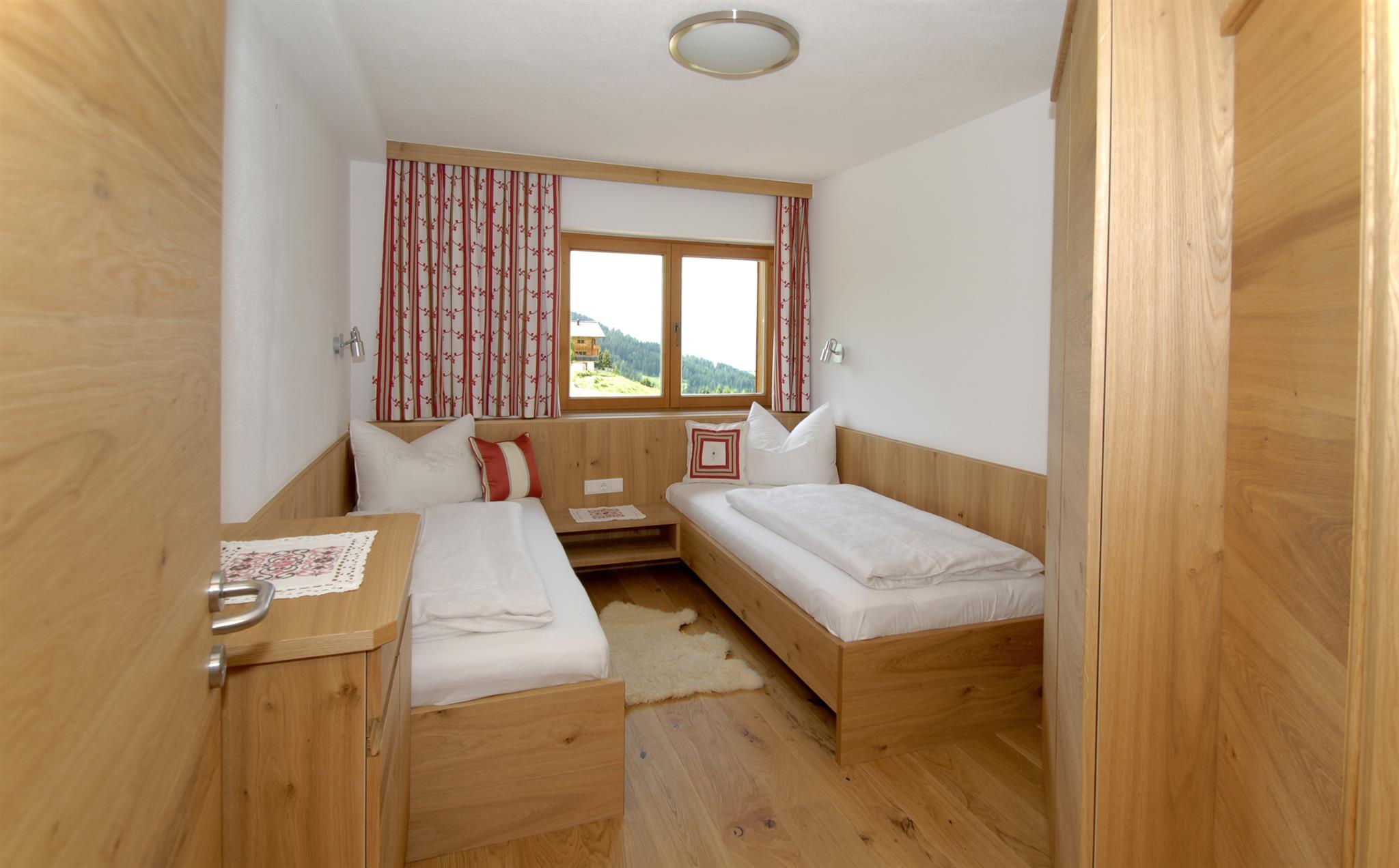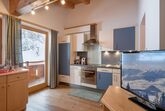 Schlafzimmer in Zirbenholz-Ausführung, Balkon gegen Süden mit Blick zur Gondel, Wohnküche komplett ausgestattet, alles Holzböden, Kachelofen, Bad mit Dusche und WC, Handtücher und Bettwäsche vorhanden.