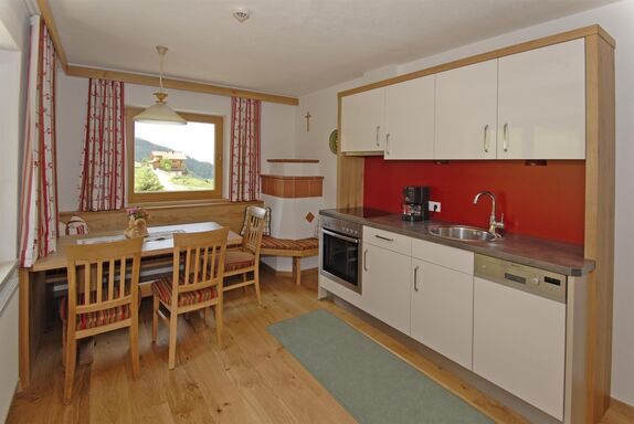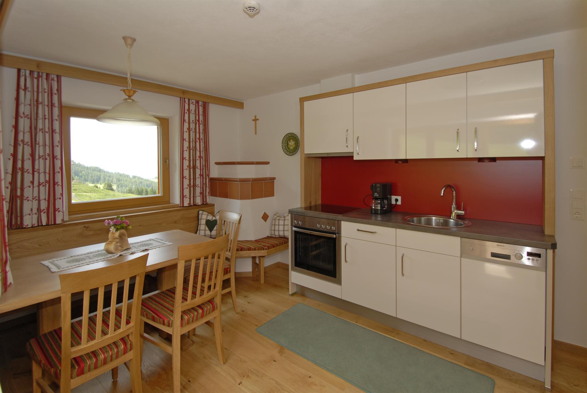 2 Schlafzimmer in Zirbenholz-Ausführung. Wohnküche komplett ausgestattet, Kachelofen, alles Holzböden.