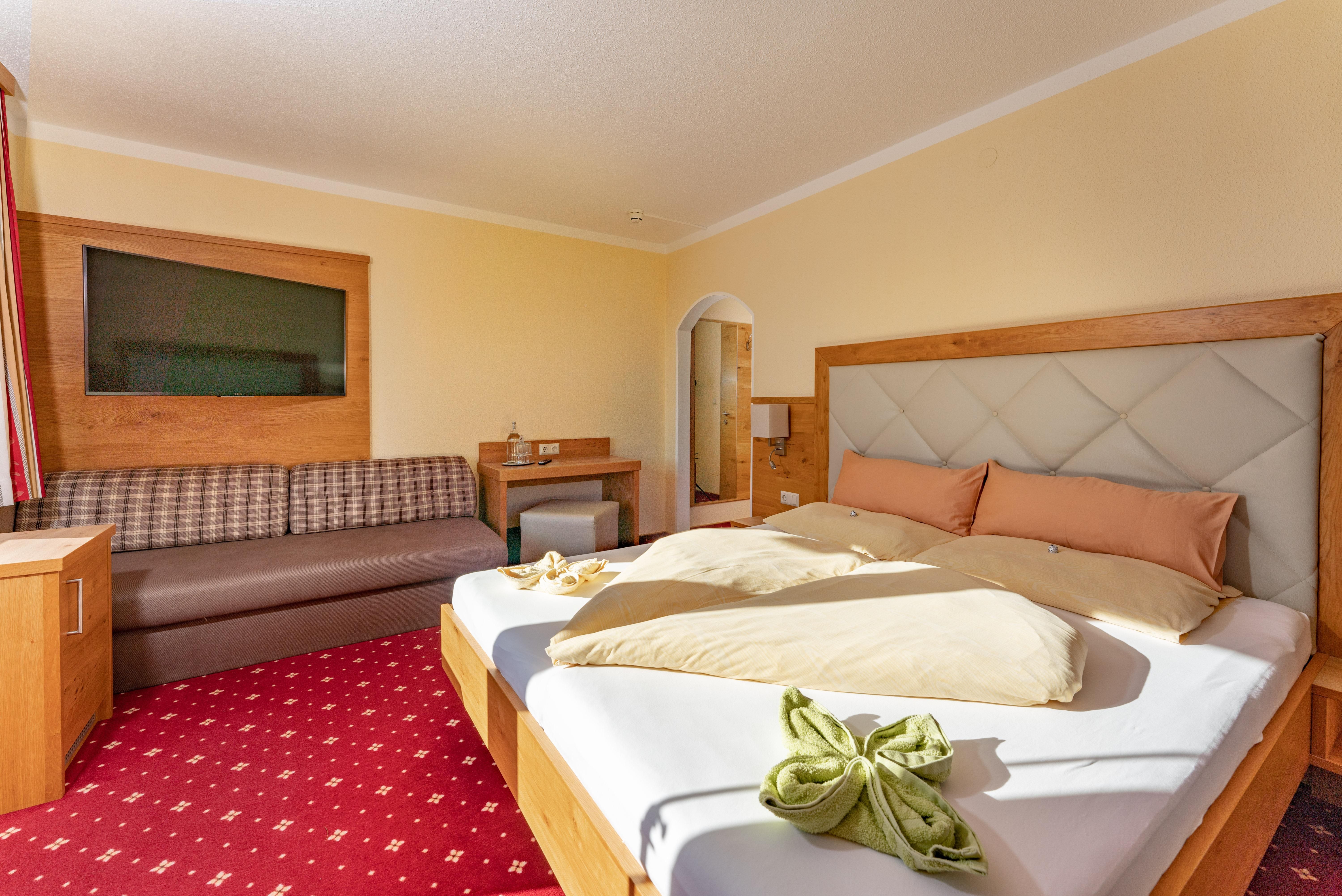 Ländlich eingerichtete Doppelzimmer mit Zustellbett, Dusche/WC, Balkon, Kühlschrank, Zimmersafe, Kabel-TV, Fön und Radio.