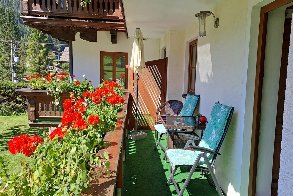Über den Gang gelangen Sie nach draußen auf die Terrasse mit herrlichem Blick auf die Berge und die saftig grünen Wiesen rund um das Haus.