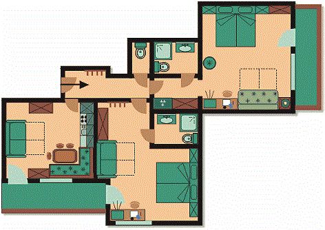 Appartement Bergkönig! Sehr geräumiges und gut ausgestattetes Appartement mit Vorraum, Küche, zwei Schlafräumen (jeweils mit Dusche/WC) und Balkon.