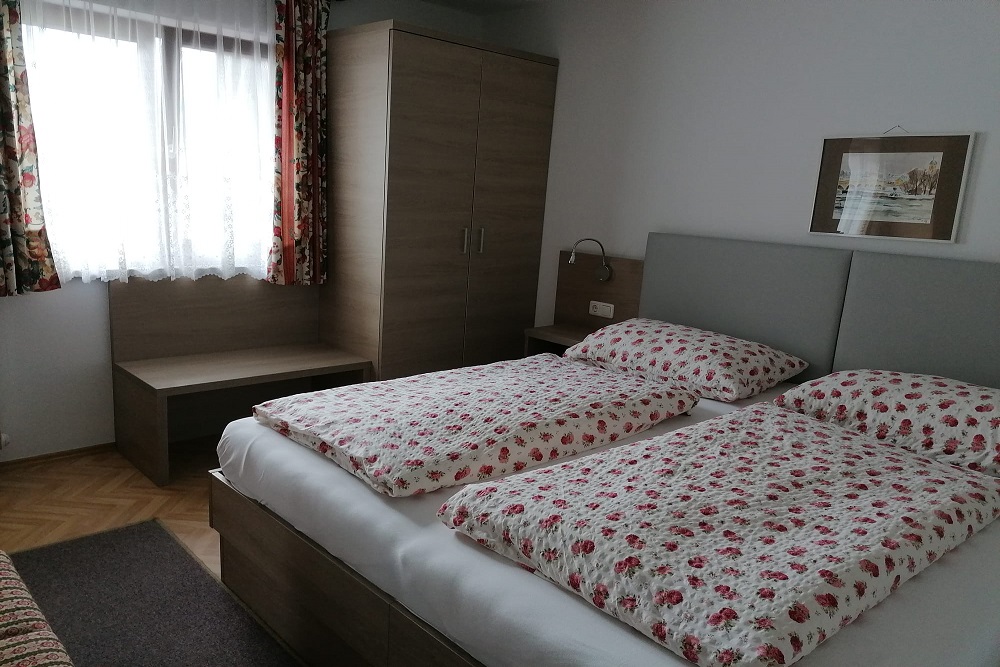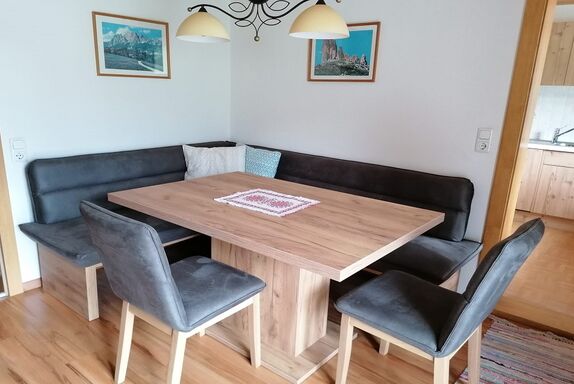 Unsere Ferienwohnung befindet sich im 1. Stock und bieten euch einen Balkon mit wunderschönen Blick auf den Gosaukamm an. Das Schlafzimmer ist mit einem Doppelbett ausgestattet und im Wohnbereich befindet sich eine Schlafcouch. Eine Essecke und voll ausgestattete Küche erwartet euch in unserer Ferienwohnung. Dusche und WC sind nicht voneinander getrennt. Ein SAT-TV und kostenlosen W-Lan steht unseren Gästen zur Verfügung. Auf Anfrage könnt ihr gerne Brötchen bestellen oder euch für das Frühstücksbuffet anmelden.