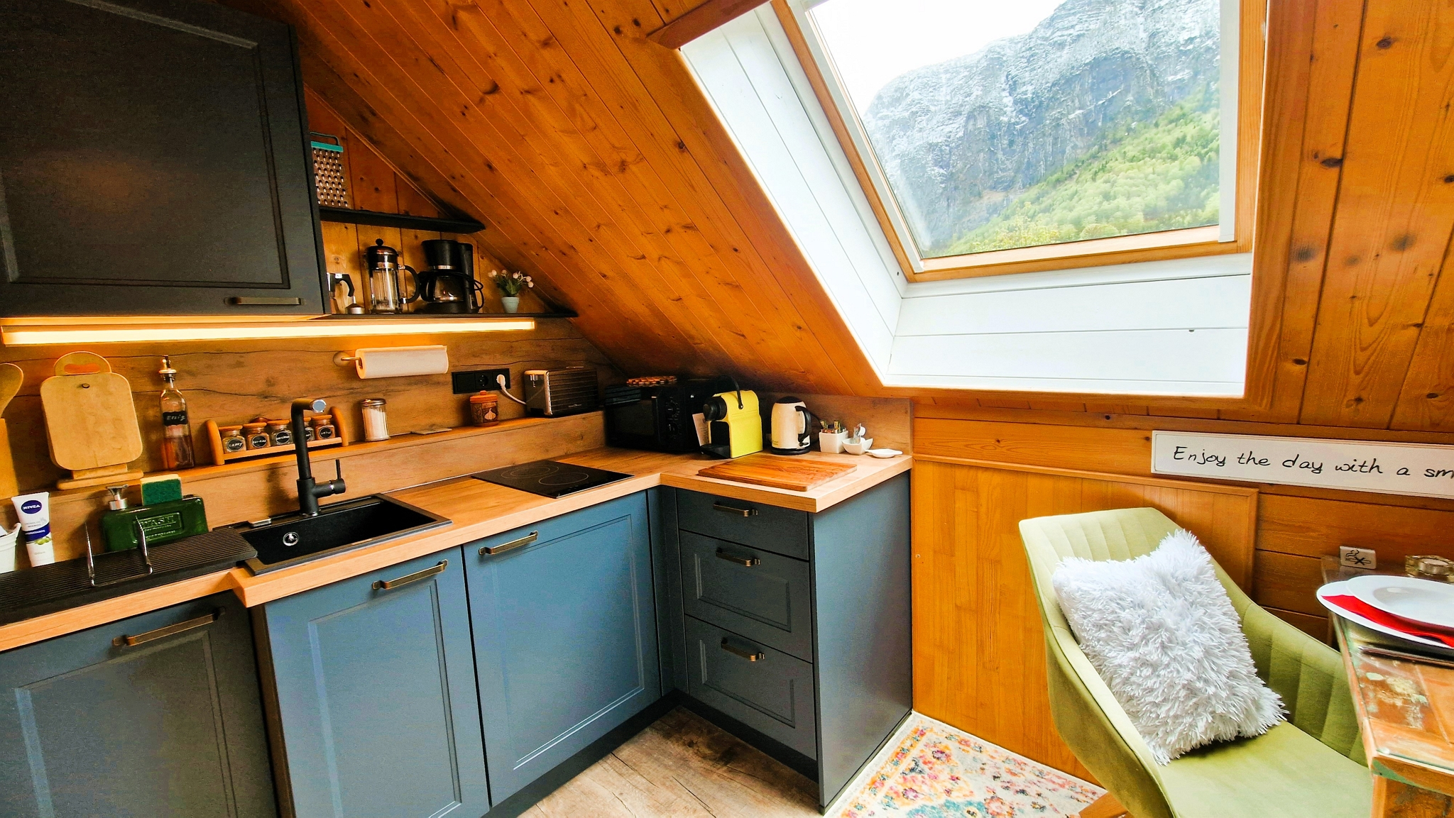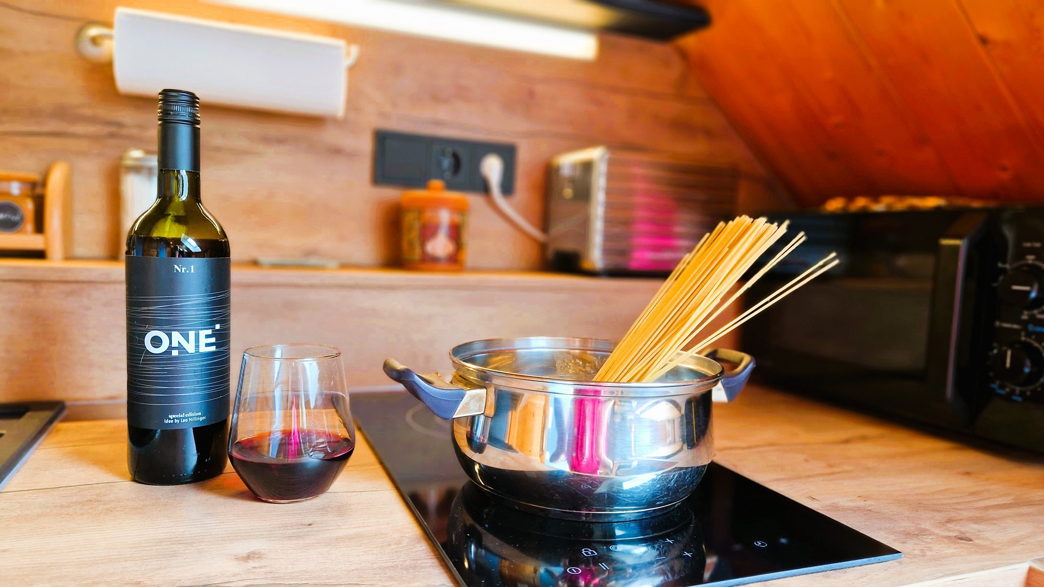 - Küchenzeile mit Spüle, Kühlschrank, Mikrowelle mit integriertem Ofen, Herd, Toaster, Kaffeemaschine etc