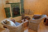 Wohnzimmer mit Doppel Bettsofa, Kaminofen, SAT TV, DVD-Stereo Player