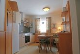 Küche mit gemütlicher Sitzecke, mit Kochherd, Backofen, Mikrowellenherd, Wasserkocher, Toaster, Kaffeemaschine, Geschirr, Besteck, Geschirrspüler ausgestattet