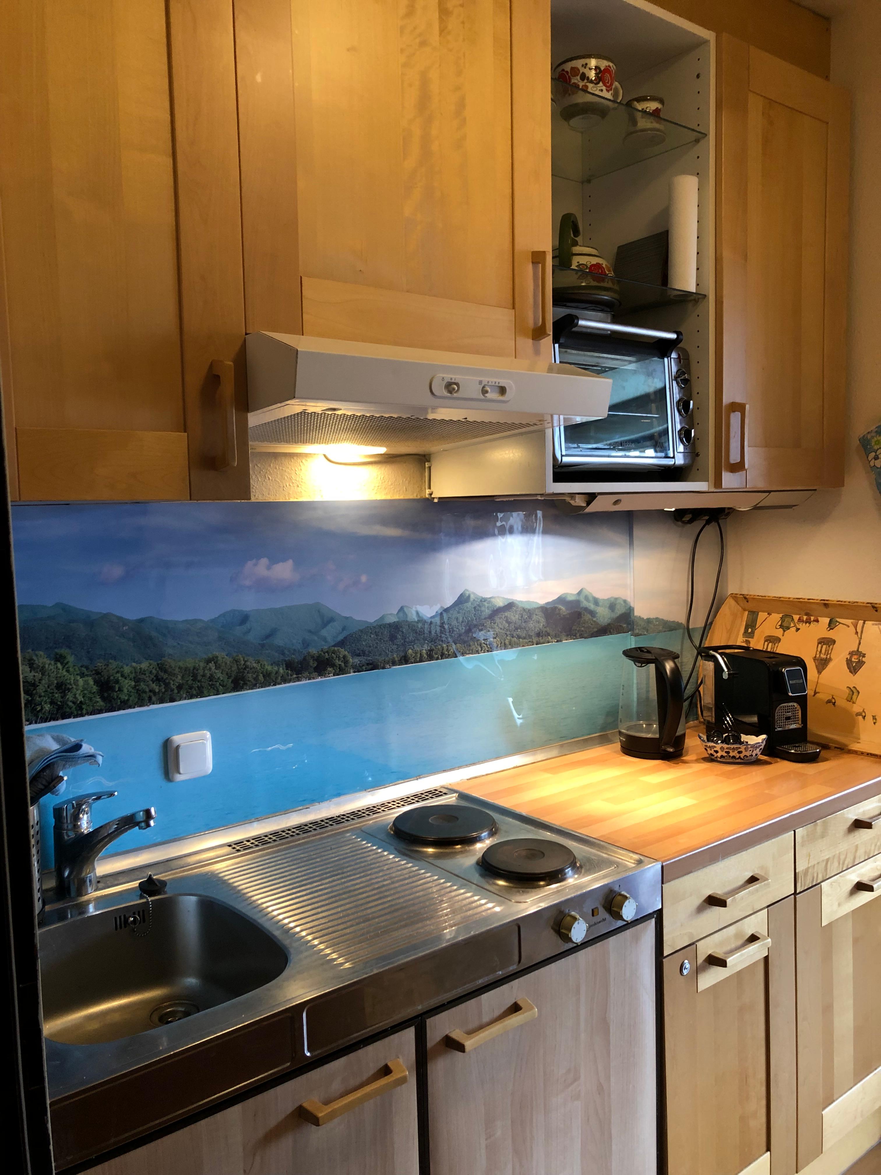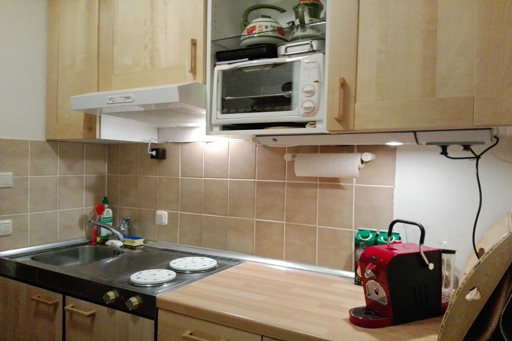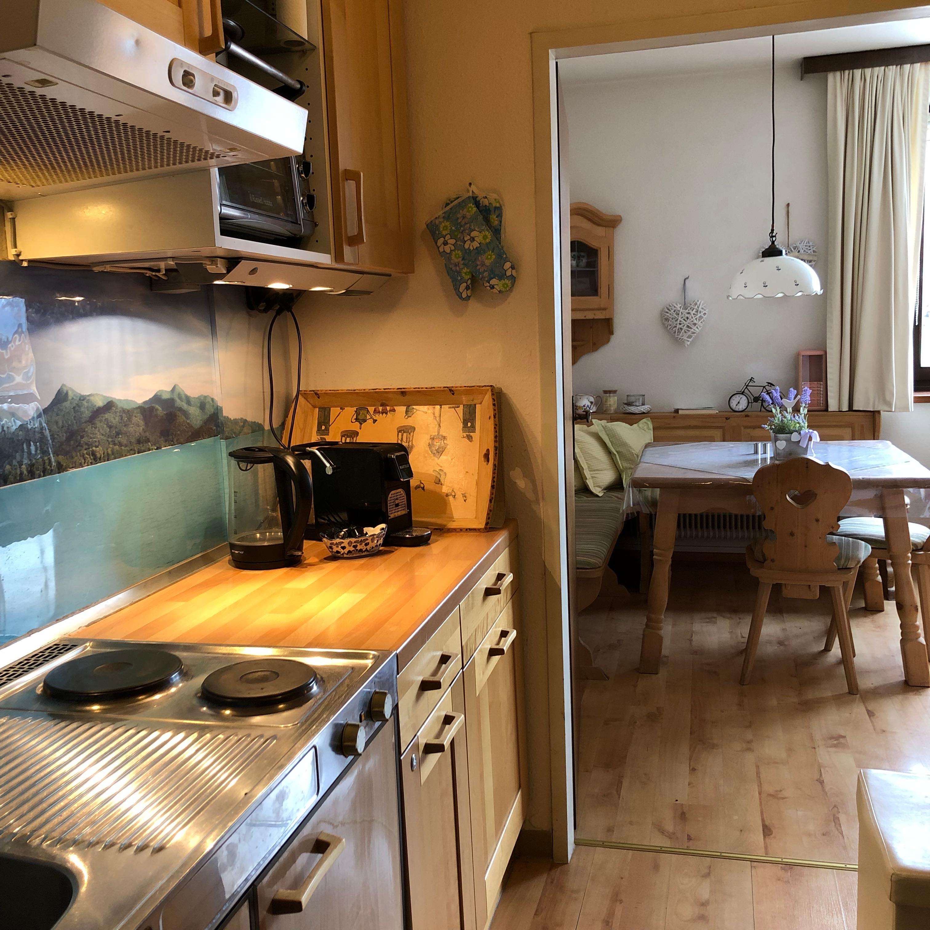 -voll ausgestattete Küche mit Kaffeemaschine, Toaster, Eierkocher, Wasserkocher und Gewürzen...