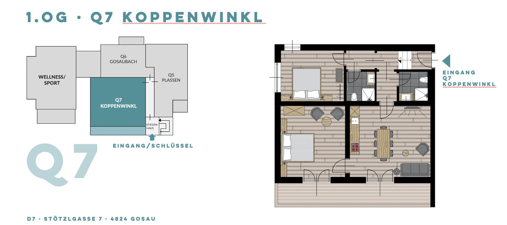 Mit großartigem Gosaukamm-Blick ist das Koppenwinkel eines der Glanzpunkte des Dachstein7. Ein großer Esstisch mit Bergblick bietet viel Platz für gemeinsame Stunden. Die Zimmerraufteilung ist ideal für 2 Paare. Aber auch Familien können sich hier ausbreiten und wohlfühlen.
