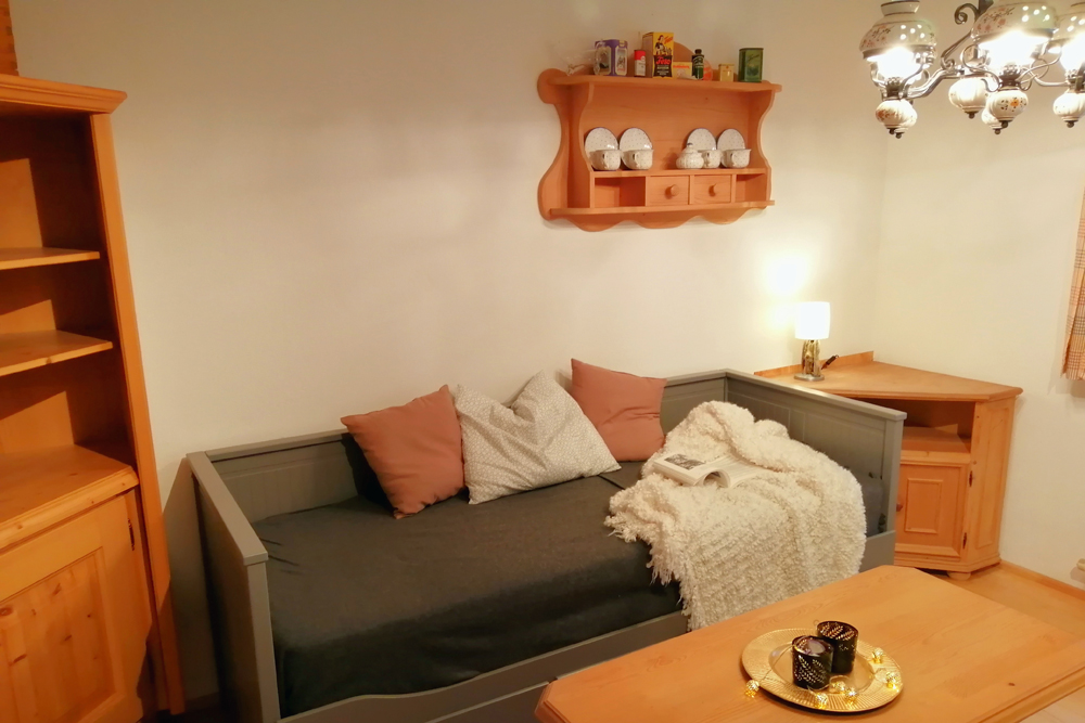 Die Unterkunft verfügt neben Bad mit Dusche und seperatem WC über ein gemütliches Wohnzimmer mit einer Schlafcouch, eine Veranda und einem Schlafzimmer mit Bergblick.