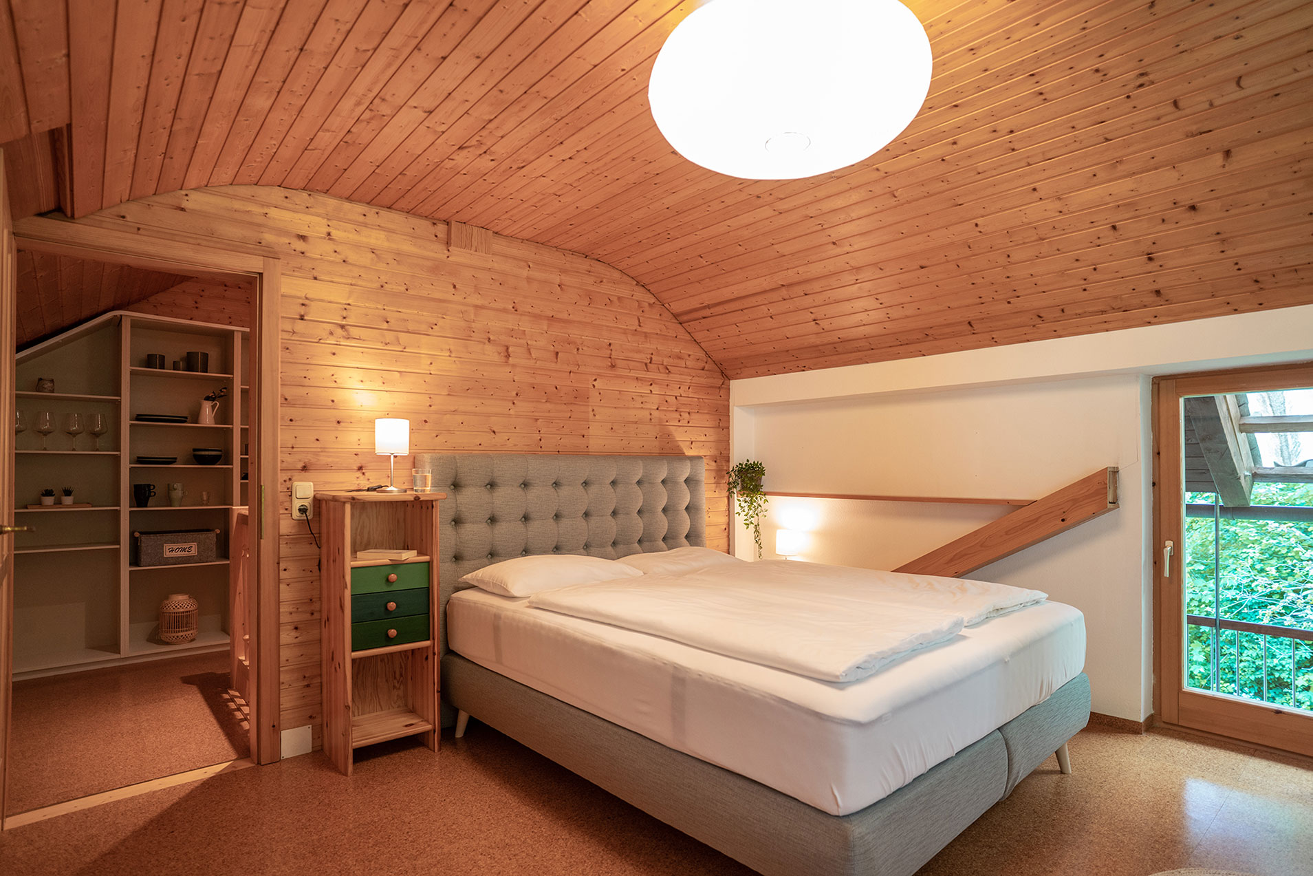 Über zwei Stockwerke in den Berg geschmiegt, empfängt Sie die Maisonette mit einem Bad, in dem Sie tanzen können. Für dieses Apartment sollten Sie sportlich sein, den das Bad liegt ein Stockwerk tiefer. Das Schlafzimmer geht zum Berg und bietet einen typischen Miniaturbalkon gen Süden. Das Wohnzimmer ist mit kleinem Kühlschrank, einer Nespresso-Kaffeemaschine und Teekessel ausgestattet, sodass Sie auf ihrem Traumbalkon frühstücken können. Vom Sofa schauen Sie gen See oder durch das Dachfenster auf die Bergkulisse, die Hallstatt umrahmt.