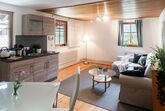 Das Studio Apartment ist das größte der drei Einheiten. Vom Bad, Schlafzimmer und Wohnzimmer schauen Sie über den See. Der Balkon zeigt nach Süden und Osten. Der Wintergarten ist zum Berg hin ausgerichtet. In der Kitchenette können Sie sich ein Frühstück zubereiten.
