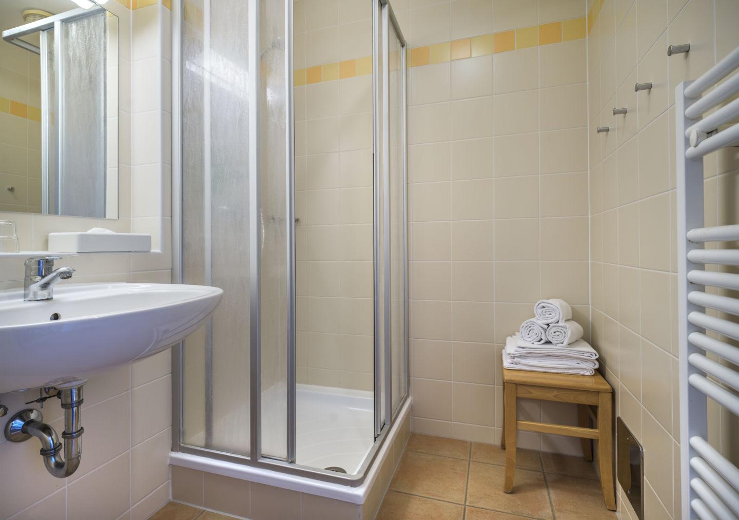 Helle und freundliche Zimmer mit flexiblen Bettensystemen (Doppel-, Einzel-, Sofa-, und Etagenbetten), funktionelle Einrichtung aus natürlichen und regionalen Rohstoffen. Badezimmer mit Dusche/WC