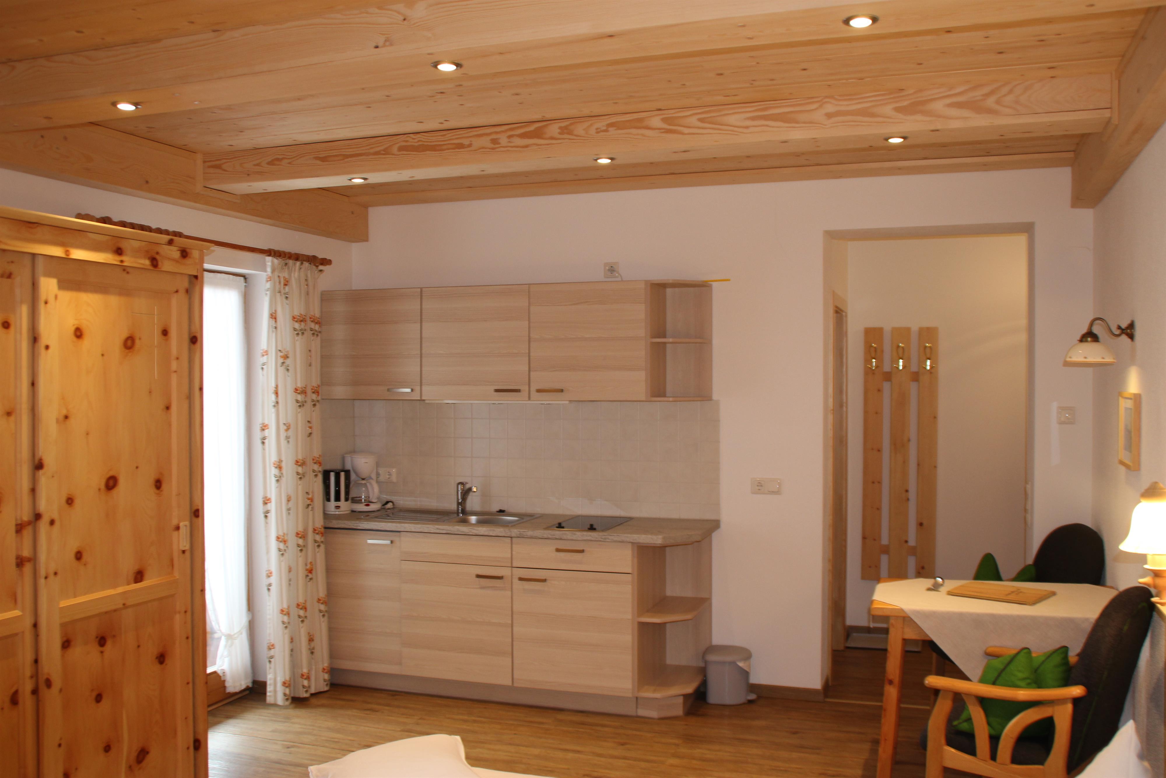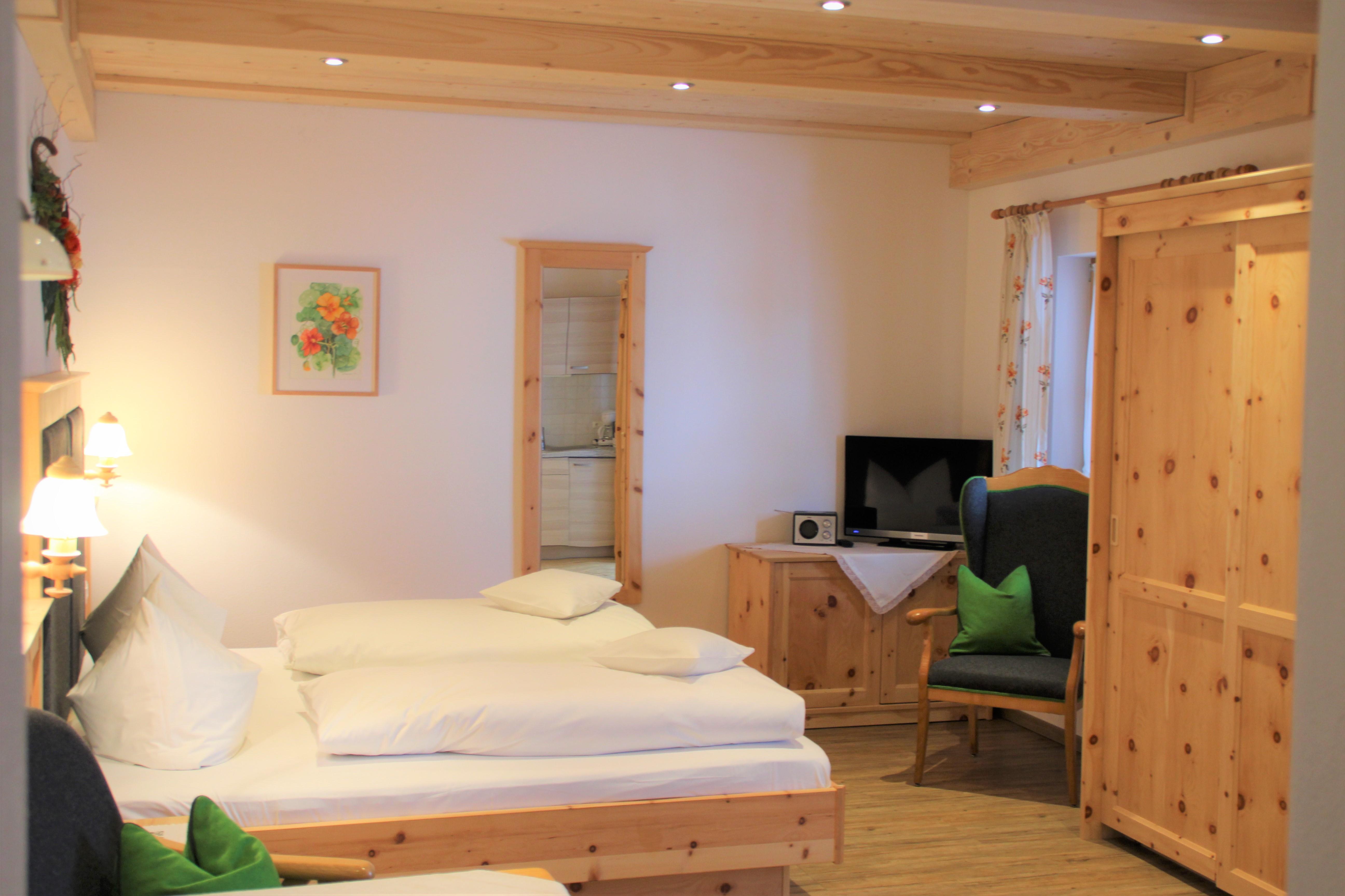 Gemütliches 4-Sterne-Doppelzimmer im bäuerlichem Landhausstil in Zirbe eingerichtet mit Küchenzeile/ DU/WC/Sat-TV/ Balkon mit Garten- und Bergblick.