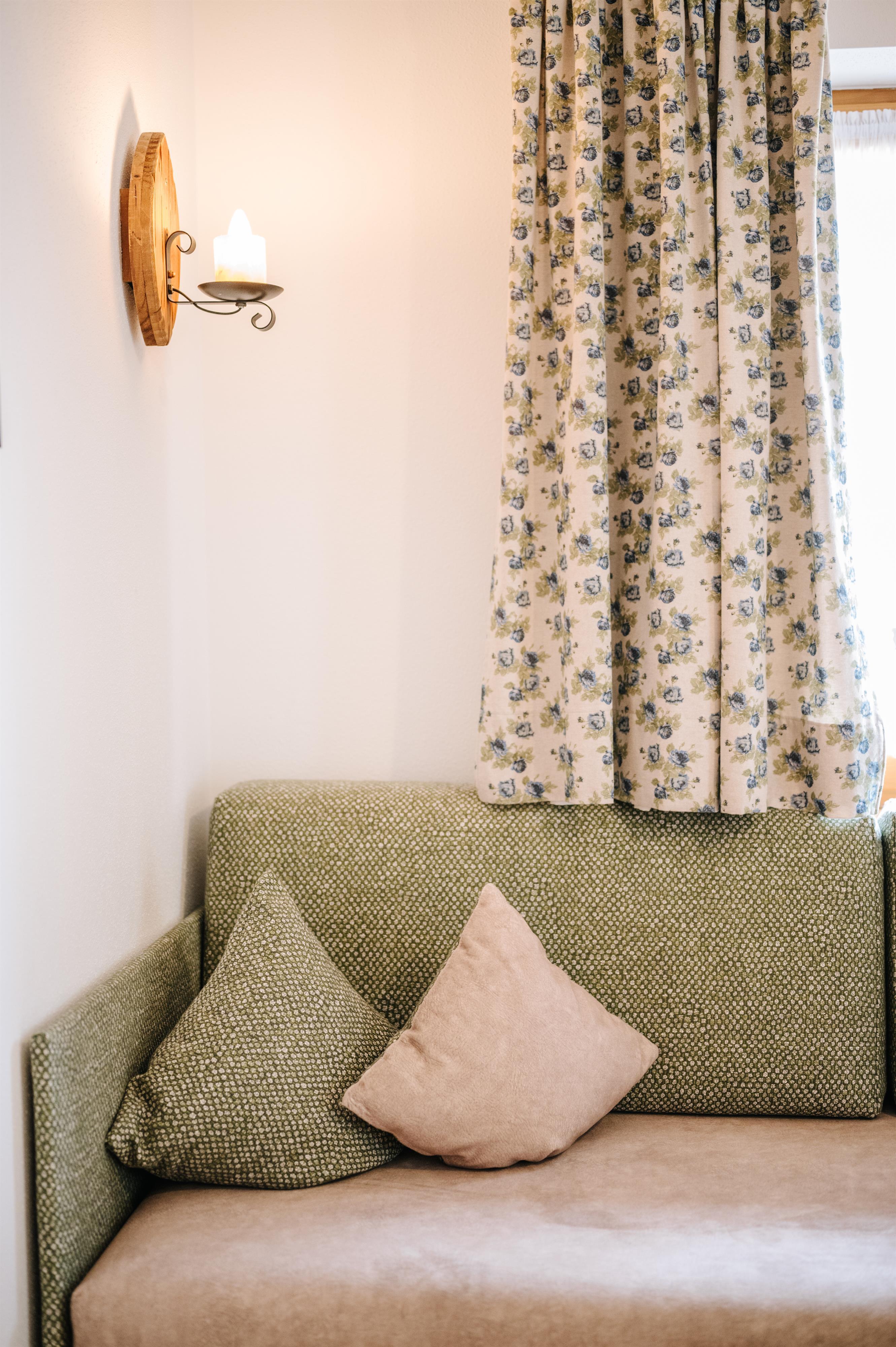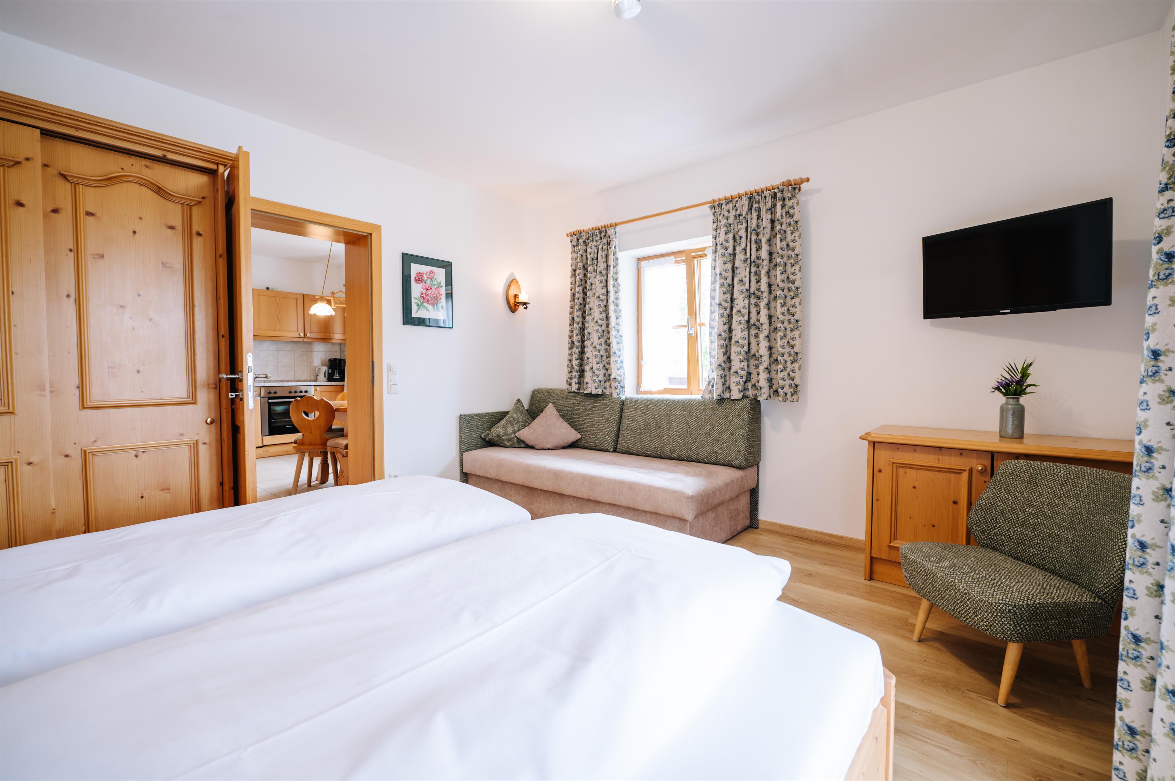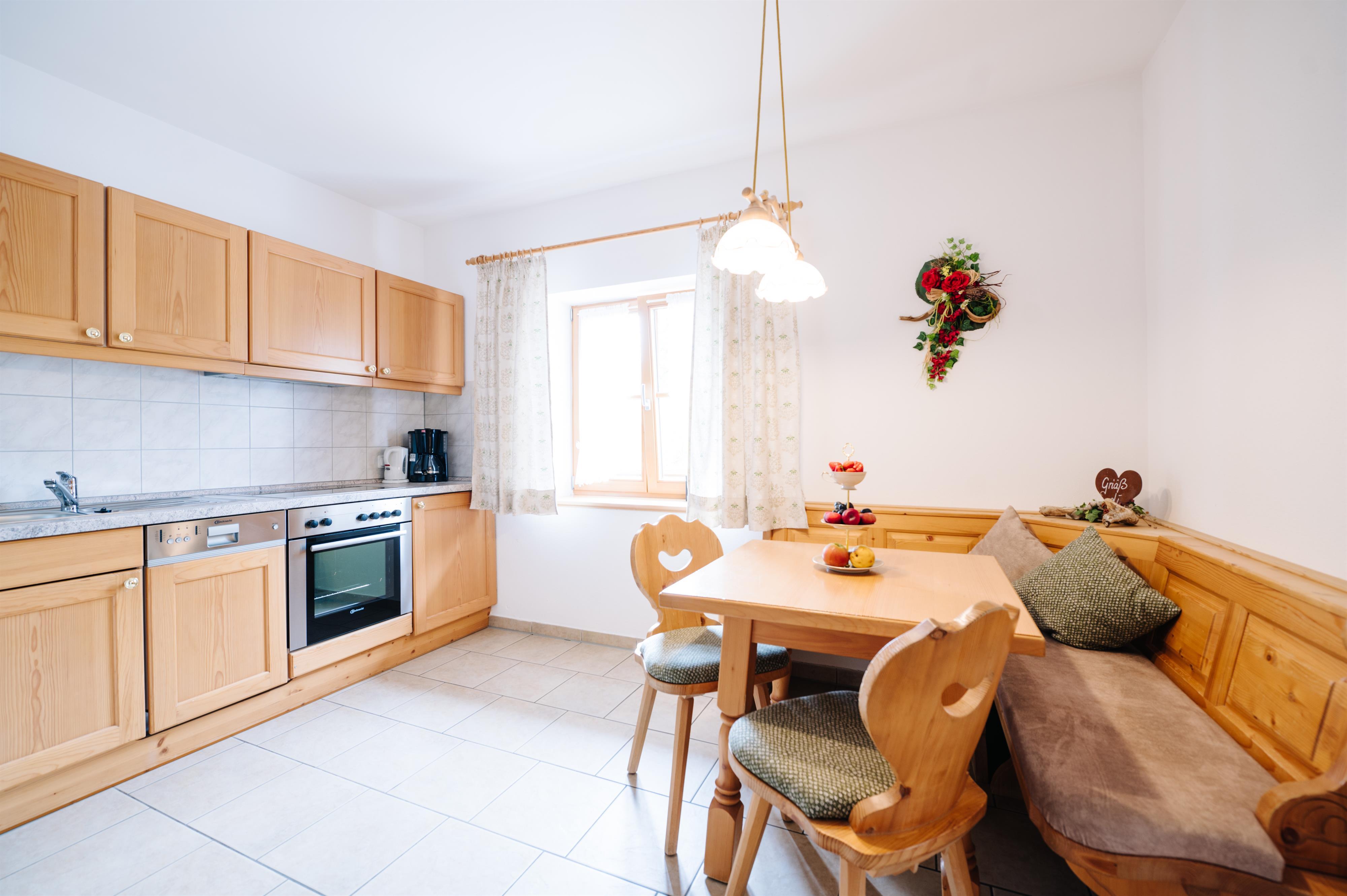 4-Sterne Fewo im bäuerlichem Landhausstil eingerichtet. Die Wohnung verfügt über eine Wohnküche mit gemütlicher Sitzecke, ein Schlafzimmer für zwei Personen und ein Bad mit Dusche/WC. Die Fewo ist ausgestattet mit Balkon, Sat-TV, Radio, Spülmaschine, E-Herd mit Backofen und einen Kühlschrank mit Gefrierfach.