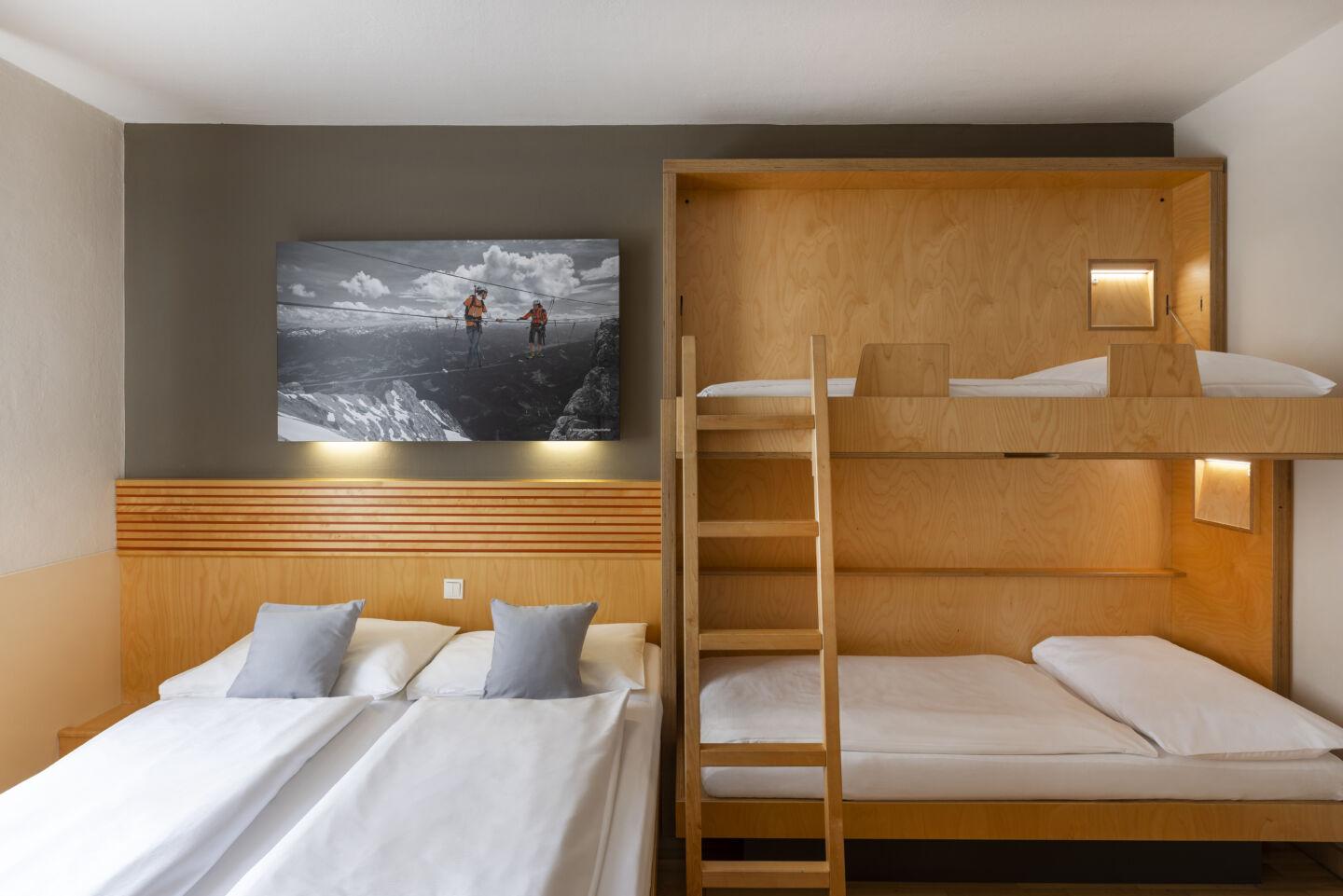 Helle und freundliche Zimmer mit flexiblen Bettensystemen (Doppel-, Einzel-, Sofa-, und Etagenbetten), funktionelle Einrichtung aus natürlichen und regionalen Rohstoffen. Badezimmer mit Dusche/WC