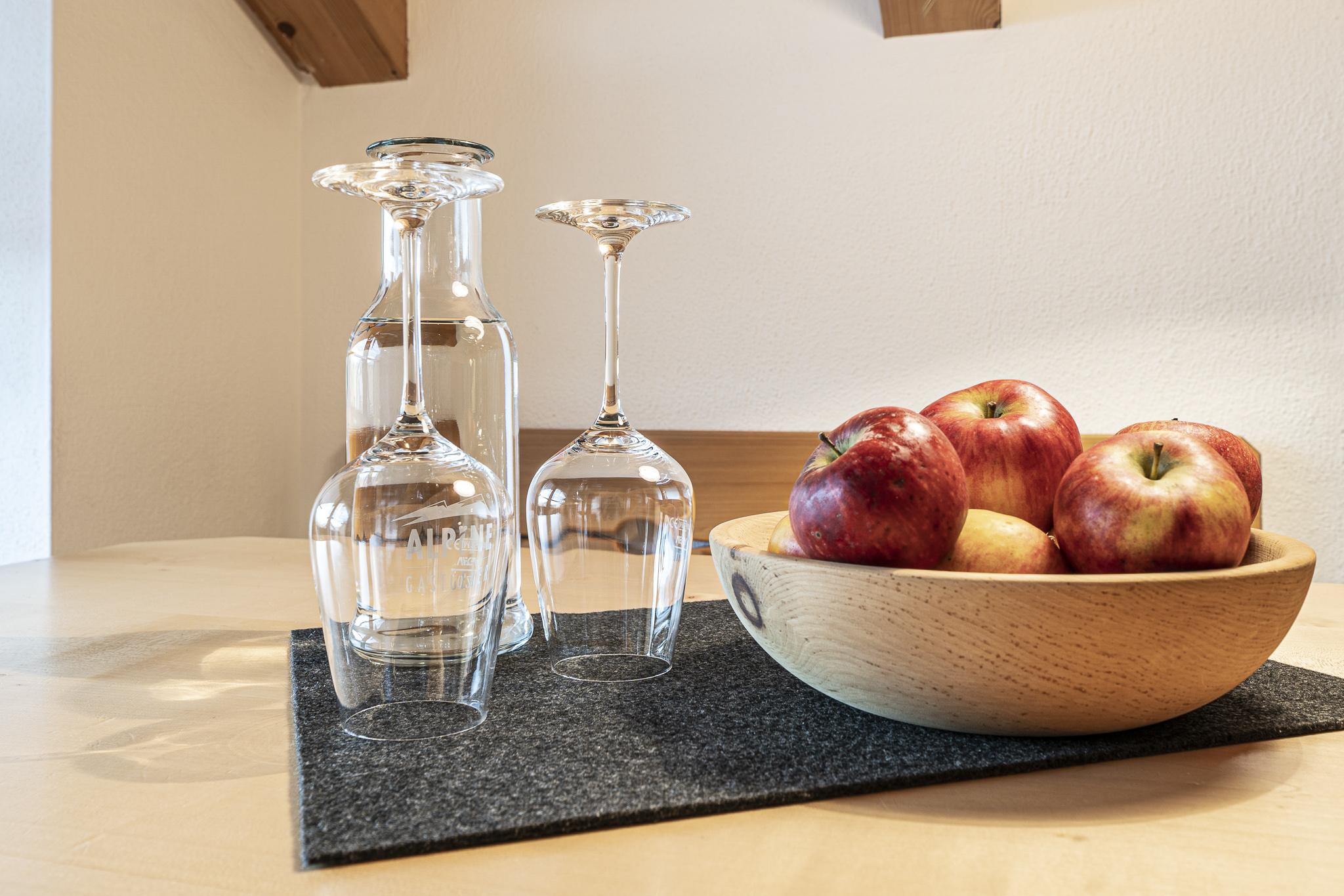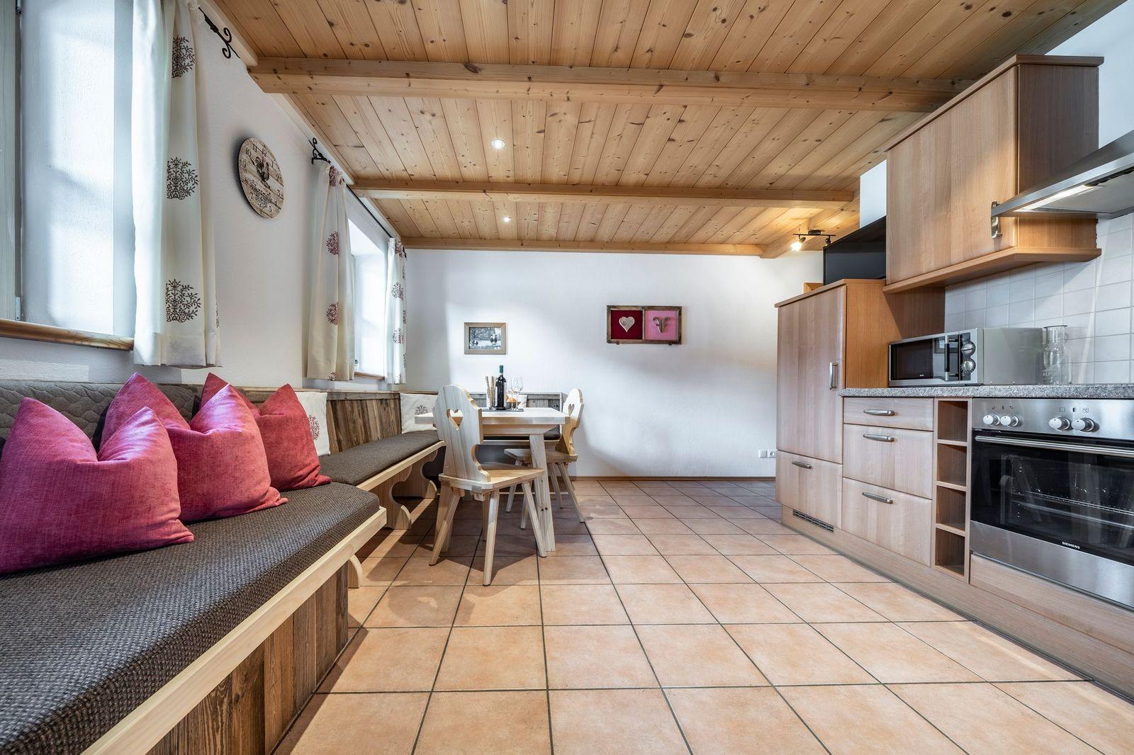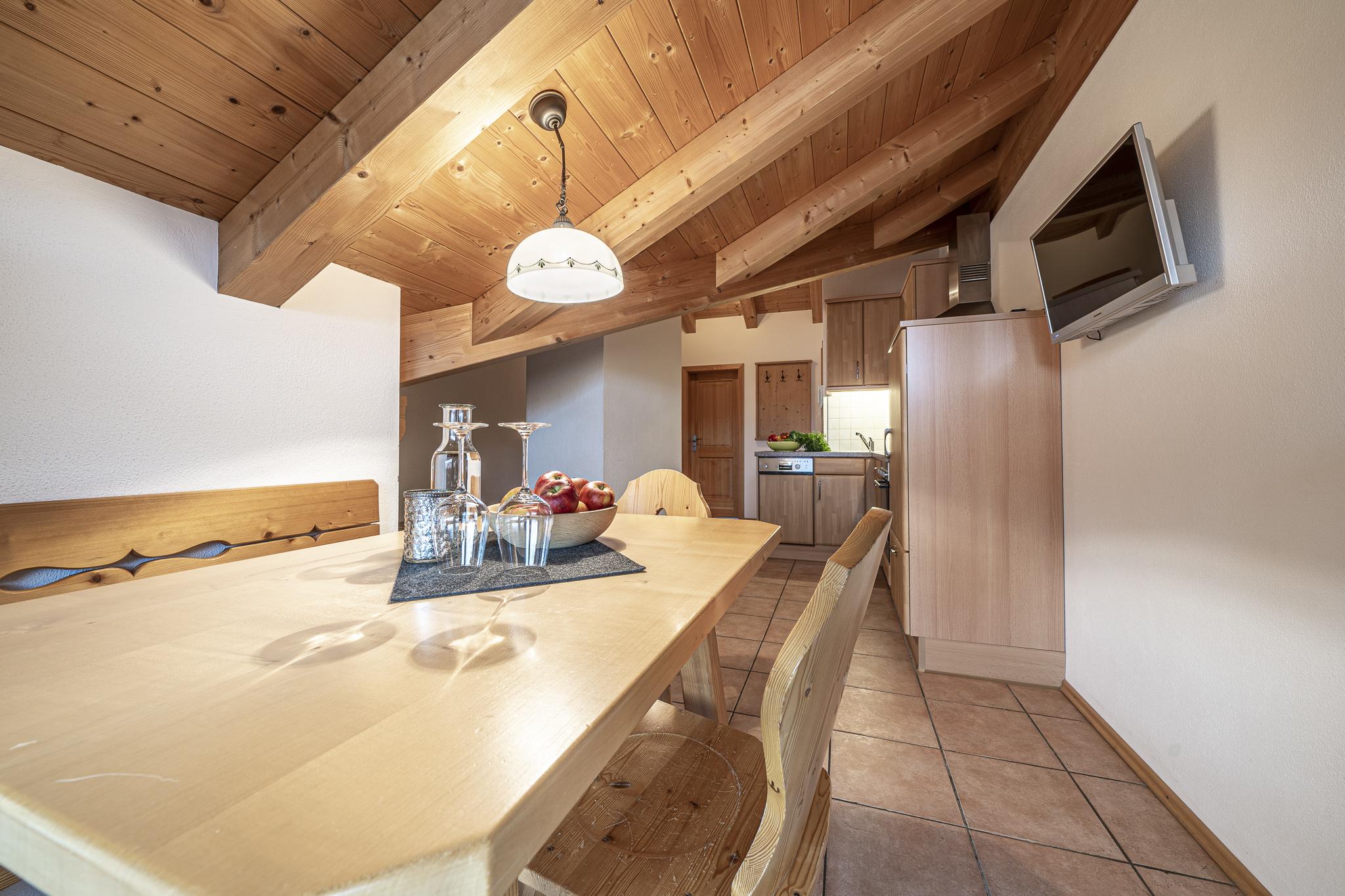 **** Wohnung im 1. Stock mit zwei handgefertigten Schlafzimmern aus Eichen- und Zirbenholz, einer komplett ausgestatteten Wohnküche mit Spülmaschine, Backofen, Mikrowelle, Kaffeemaschine und Fachbildfernseher. Bad mit Dusche/WC, Hand- und Badetücher, Handtuchtrockner, Kosmetikartikel und Fön. Großer möblierter Balkon mit unverbauter Bergsicht.