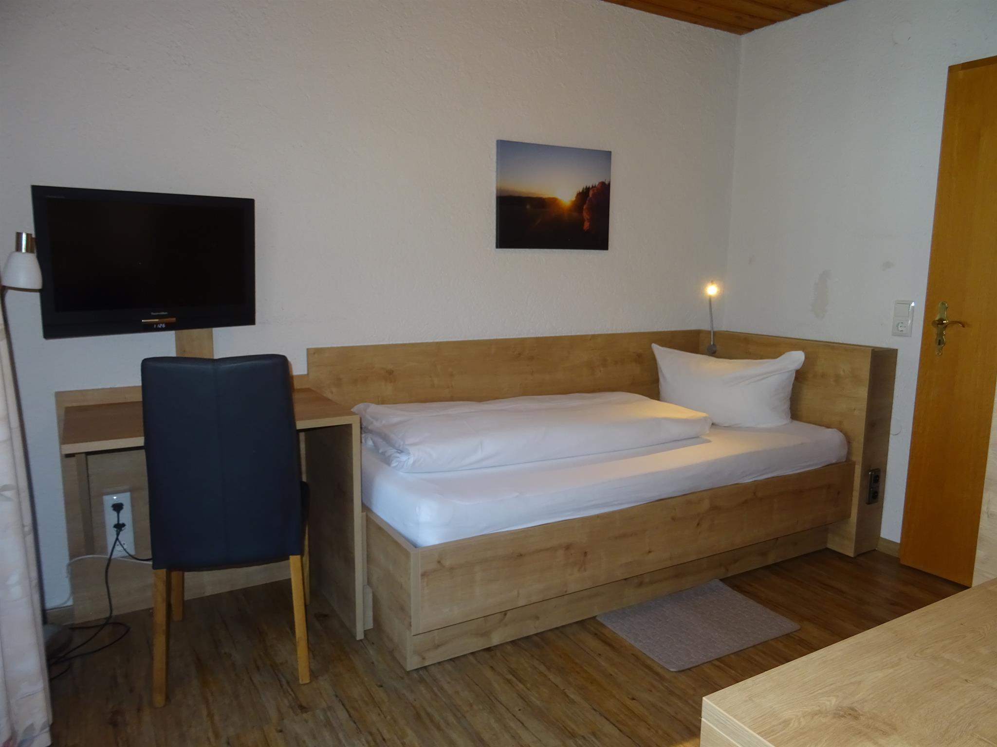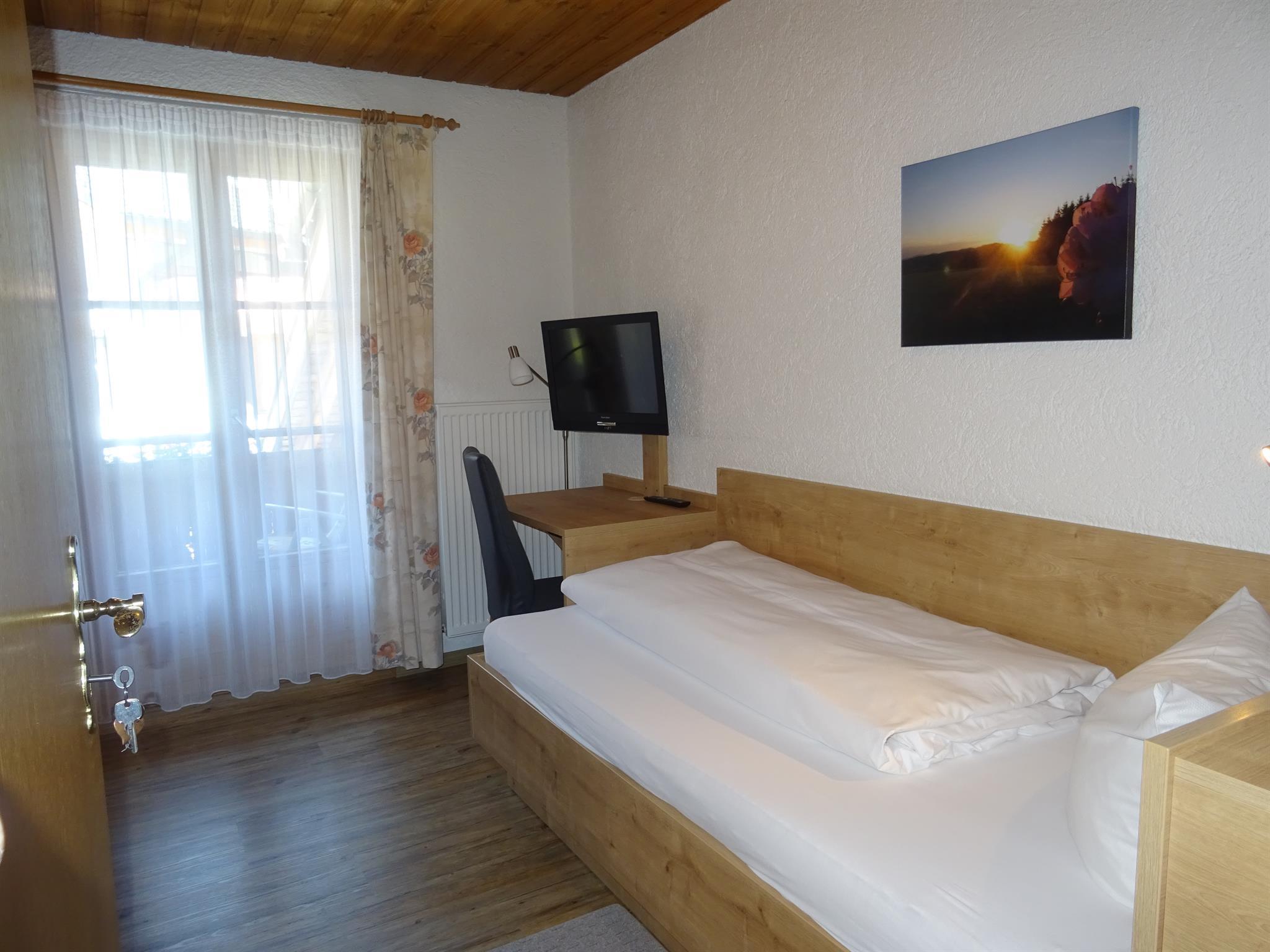 Komplett neu renoviertes Einzelzimmer mit Vinylboden, TV, DU,WC und Balkon. Wunderschöner Blick aufs Brauneck.