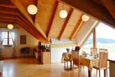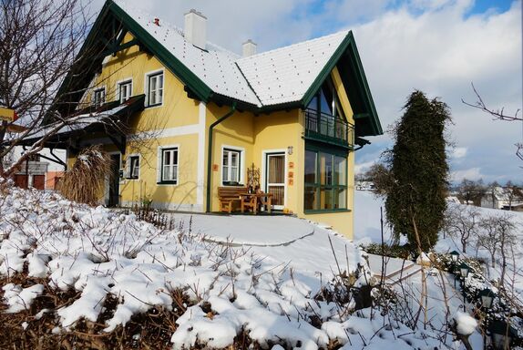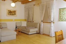 Unsere Ferienwohnung eignet sich bestens für Familien und Pärchen. Die gesamte Wohnung verfügt über einen eigenen Eingang. Sie wohnen im ersten Stock in einer ca. 70m² großen und lichtdurchflutenden Wohnung mit einem Schlafzimmer inkl. Doppelbett. Die Wohnung umfasst einen Wohnschlafraum mit Ausziehcouch für 2 Personen und Sitzgruppe sowie Bad/WC und Vorraum. Die Küche ist modern ausgestattet mit E-Herd und Holzherd, Kühlschrank und Kaffeemaschine sowie reichlich Geschirr und Tischwäsche. Für Ihre gemütlichen Stunden erwartet Sie ein lichtdurchflutetes, helles Wohnzimmer mit Sitzgruppe und großzügigem Essplatz.