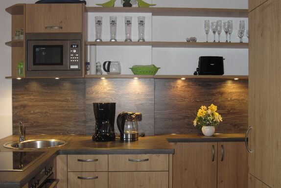 Die Ferienwohnung hat 45 qm² Wohnfläche und ist im Erdgeschoss des Gästehaus. Sie hat eine große Terrasse von der Sie eine traumhafte Aussicht auf die Berge und ins Tal haben.In der Wohnküche ist eine Essecke und die Küche mit Induktionsherd, Backofen, Spülmaschine, Mikrowelle, Kühlschrank, Kaffeemaschine, Wasserkocher, Toaster, Erstausstattung mit Spültuch, Tabs und Mülltüten. Außerdem steht hier auch noch eine Couch, der Fernseher und eine Stereoanlage. Im kleinen Bad ist eine Dusche, Waschbecken und WC, Handtücher, ein kleiner Schminkspiegel und ein Föhn. Die zwei Schlafzimmer haben jeweils Doppelbetten.