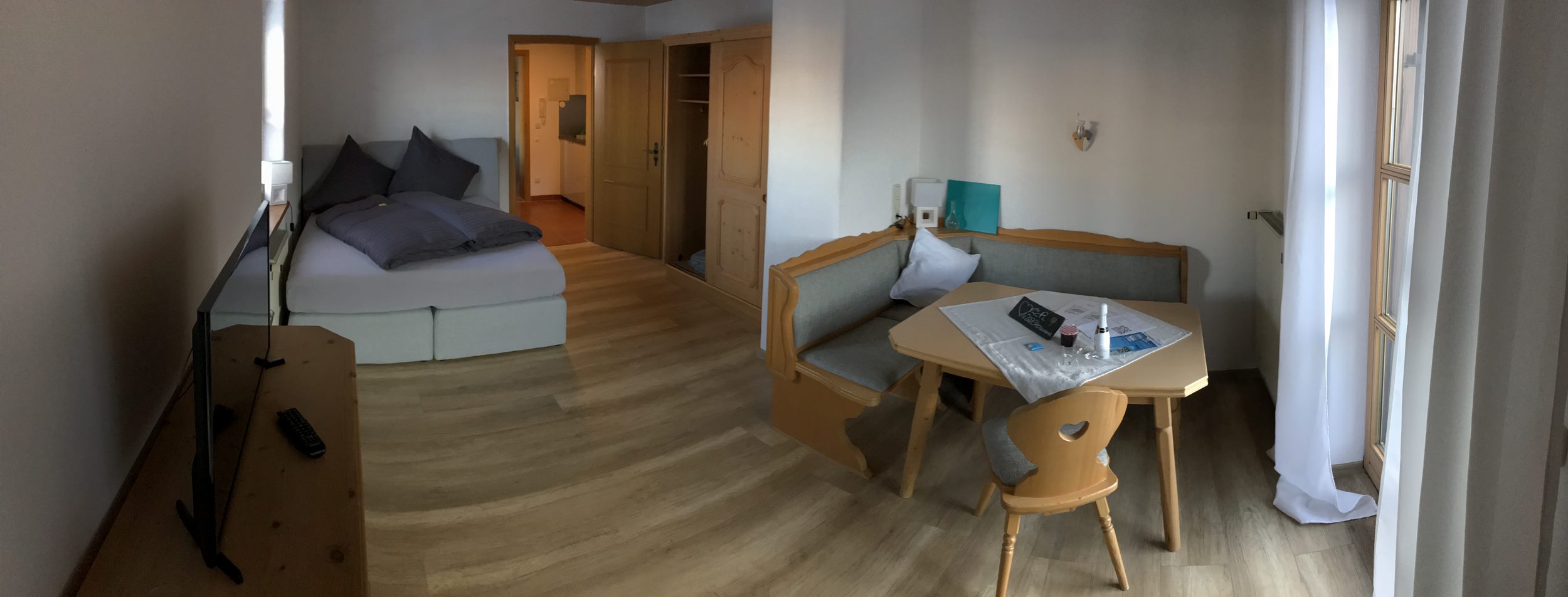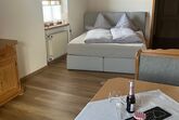 Gemütliche 1-Raum-Wohnung im 1. Obergeschoss mit ca. 30 m² Wohnfläche. Moderne neue Küchenzeile komplett ausgestattet was in eine Küche gehört, sowie eine Nespresso-Kapselmaschine. Integrierter Wohn- / Schlafraum mit Essecke + Boxspringbett (160x200cm) inkl. Bettwäsche. Bad mit Dusche/WC - Handtücher und Föhn sind vorhanden. Balkon mit Möbel zum Verweilen, um die herrliche Aussicht zu genießen.