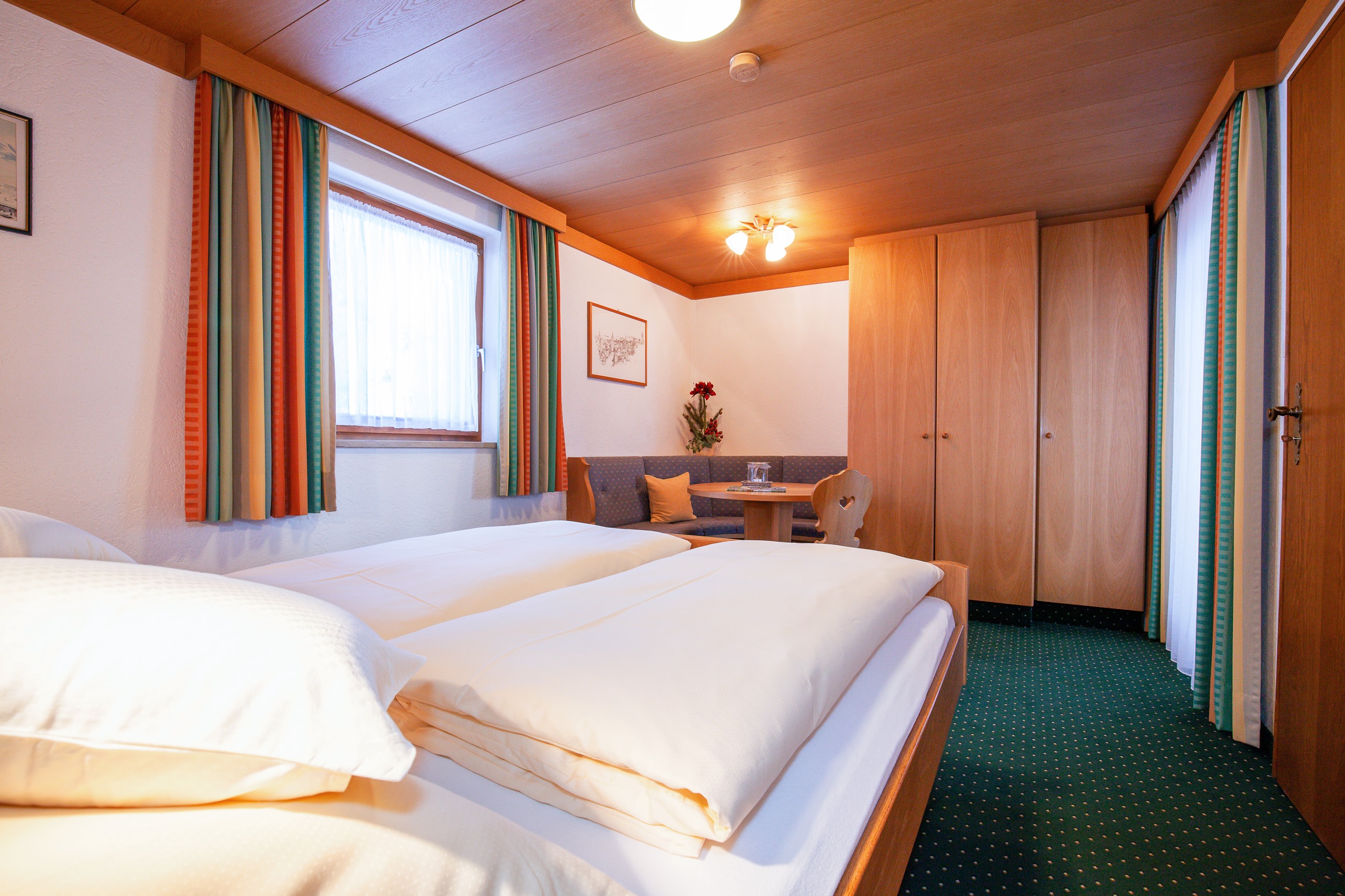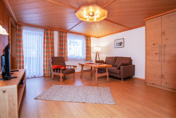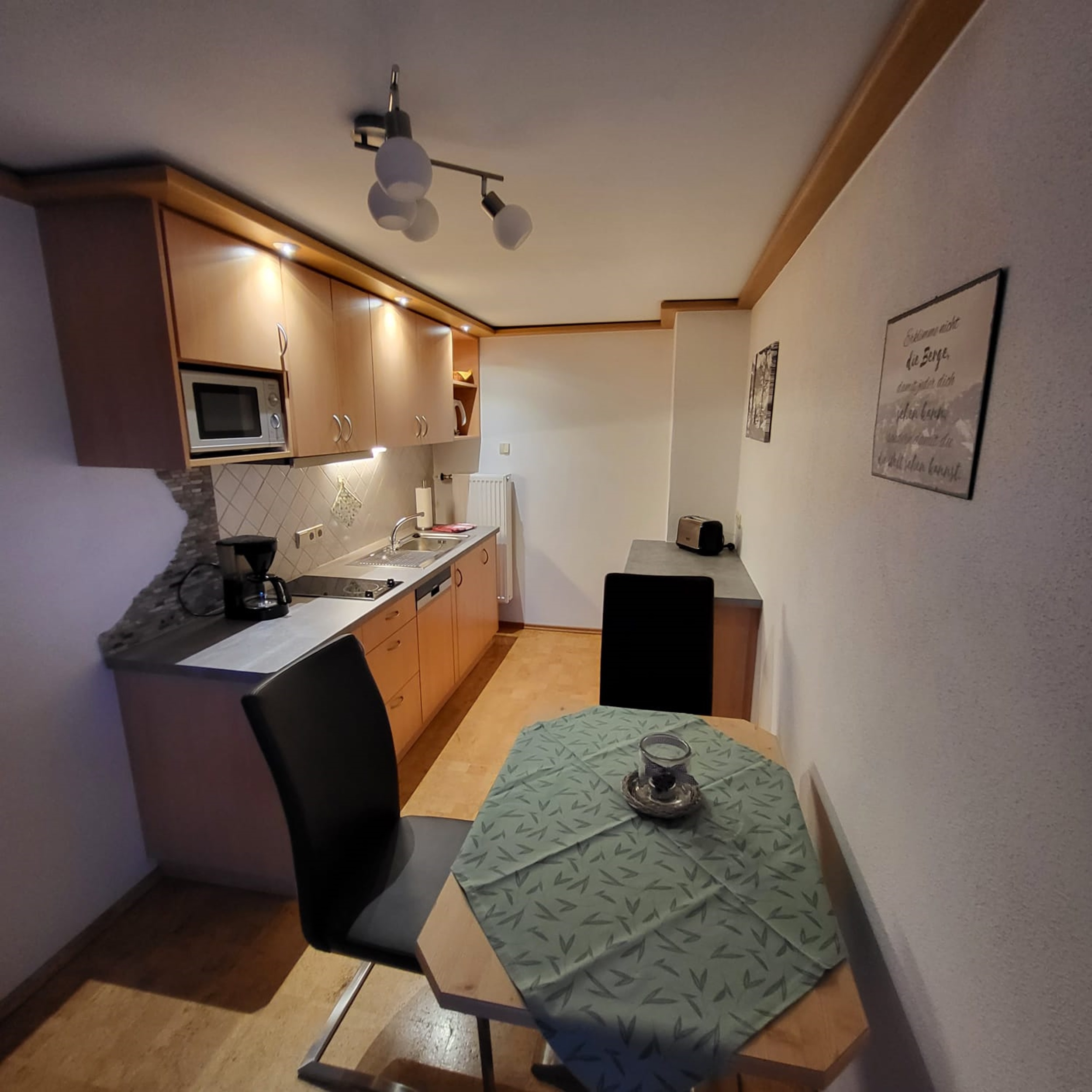 Die gemütliche und liebevoll eingerichtete Zweiraumwohnung wurde mit hochwertigen Einbaumöbeln ausgestattet und verfügt über einen großen möblierten Westbalkon mit Blick auf das Kaisergebirge. Wohnraum mit Sitzgruppe, komfortable Schlafcouch zum Ausziehen, Flachbild-TV, Radio und kostenloser Internetzugang. Für Ihre Wertgegenstände steht Ihnen ein Zimmersafe zur Verfügung. Schlafzimmer mit Doppelbett (verstellbare Lattenroste, Bandscheibenmatratzen), großer Kleiderschrank, ebenfalls mit Flachbild-TV und Ostbalkon mit Morgensonne. Das angrenzende Bad mit DU/WC wurde neu saniert und verfügt über ein Fenster. Die gemütliche Wohnküche mit Essecke ist komplett eingerichtet mit Mikrowelle, Kaffeemaschine, Toaster, Wasserkocher u. Spülmaschine etc. Die Betten sind bereits bezogen, Handtücher werden gestellt und auf Wunsch gewechselt.