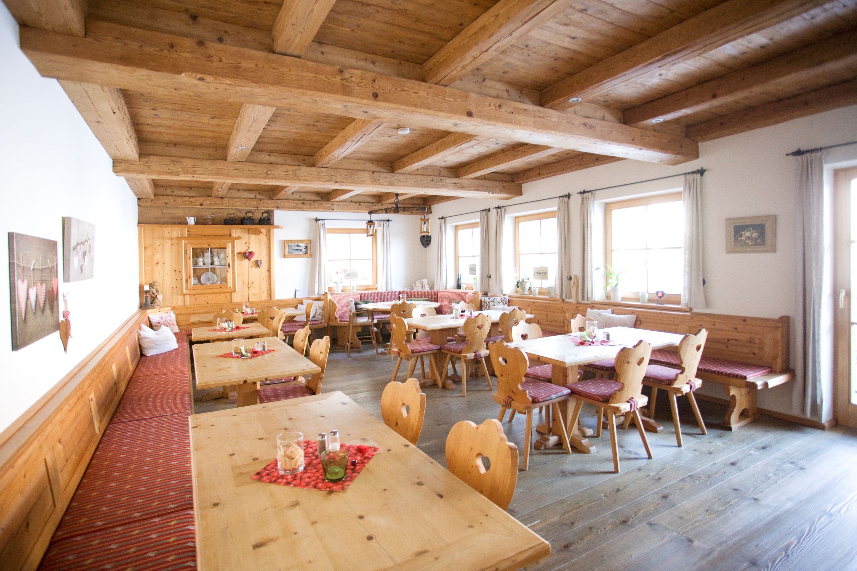 Der urig – rustikale Frühstücksraum bietet eine angenehme Atmosphäre für einen guten Start in den neuen Urlaubstag. Unser vitales Frühstücksbuffet ist reichhaltig und abwechslungsreich gestaltet. Bei schönem Wetter kann das Frühstück auch auf der Sonnenterasse eingenommen werden. Von dort aus hat man einen schönen Ausblick in die Bergwelt von Reit im Winkl und Umgebung.