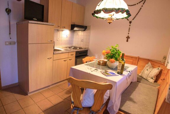 Die komfortable, sonnige 4-Sterne Ferienwohnung liegt ebenerdig und verfügt über ein separates Schlafzimmer mit Doppelbett, Wohnküche und Dusche/WC sowie über eine überdachte Terrasse. Die Liegewiese steht zur gemeinsamen Nutzung zur Verfügung sowie Gartenmöbel und eine Grillmöglichkeit. Die Wäsche (Erstausstattung) wird gestellt. Auf Wunsch kann ein Babyhochstuhl und -bettchen gestellt werden sowie Waschmaschinen- und Trocknerbenutzung angeboten werden. In dieser Wohnung können auf Anfrage Haustiere mitgebracht werden (5,-- Euro/Tag). Haustiere müssen jedoch brav und stubenrein sein und können nicht alleine in der Wohnung zurückgelassen werden.