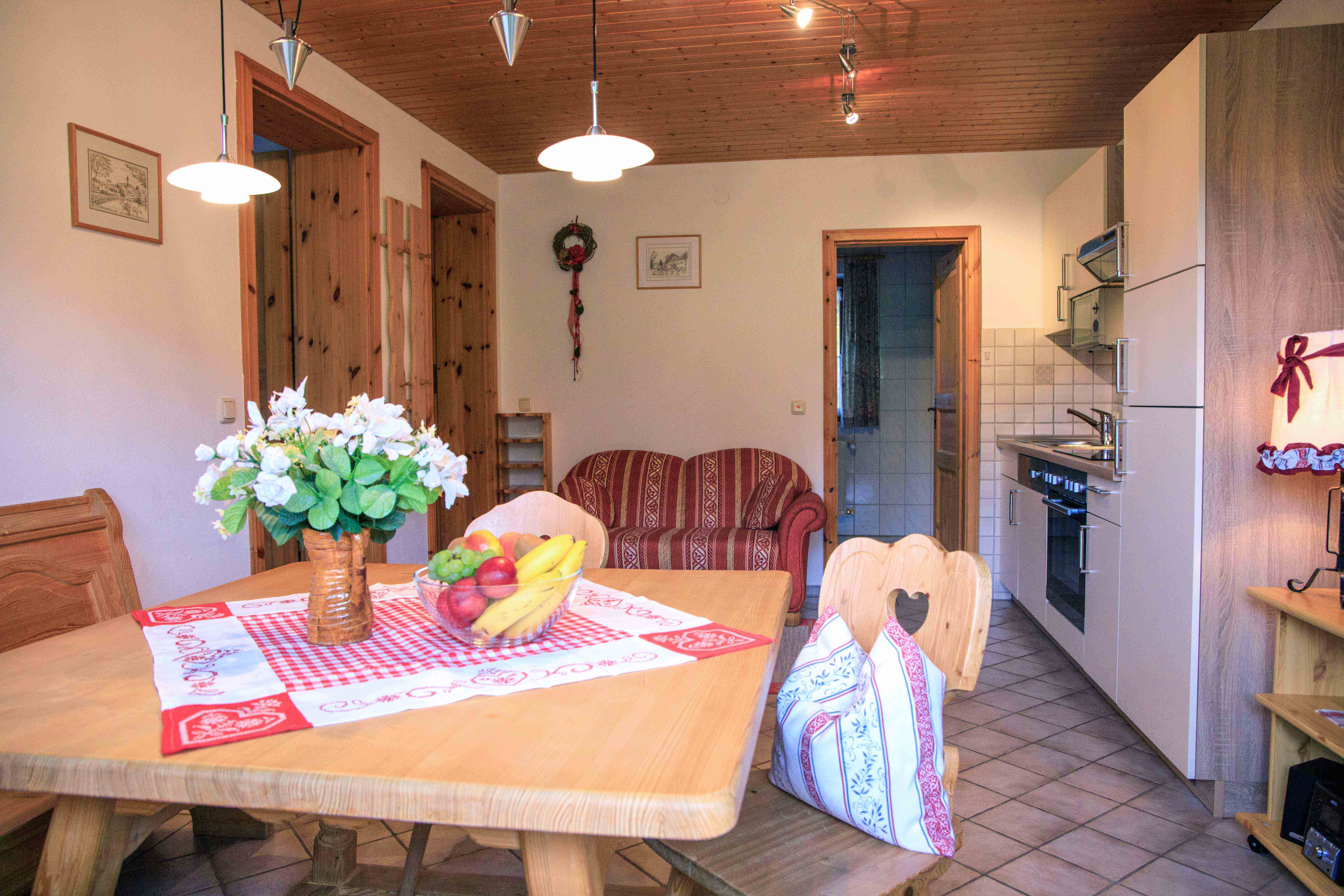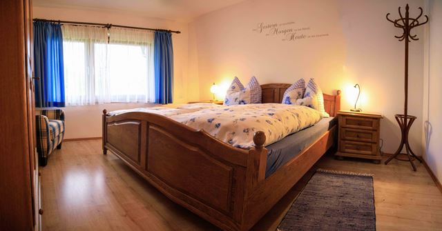 Die komfortable, sonnige 4-Sterne Ferienwohnung verfügt über zwei separate Schlafzimmer mit jeweils einem Doppelbett, großer Wohnküche, Bad und WC sowie über einen Balkon mit herrlichem Bergblick. Die Liegewiese steht zur gemeinsamen Nutzung zur Verfügung sowie Gartenmöbel und eine Grillmöglichkeit. Die Wäsche (Erstausstattung) wird gestellt. Auf Wunsch kann ein Babyhochstuhl und -bettchen gestellt werden sowie Waschmaschinen- und Trocknerbenutzung angeboten werden. In dieser Wohnung können leider keine Haustiere aufgenommen werden.