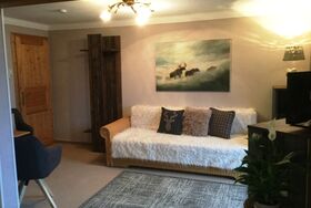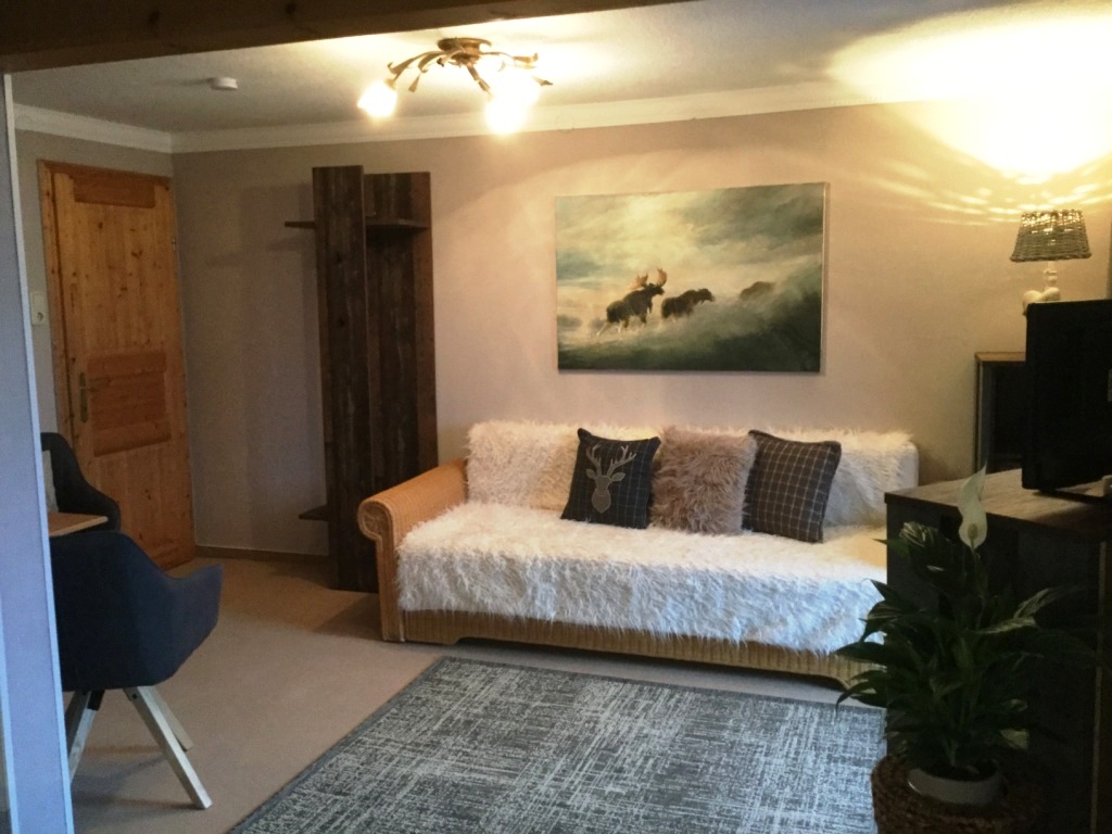Familienzimmer mit Du/WC, TV und Balkon und Schlafcouch. Herrliche Aussicht auf Wiesen, Loipen, Dorfzentrum und den Wilden Kaiser.