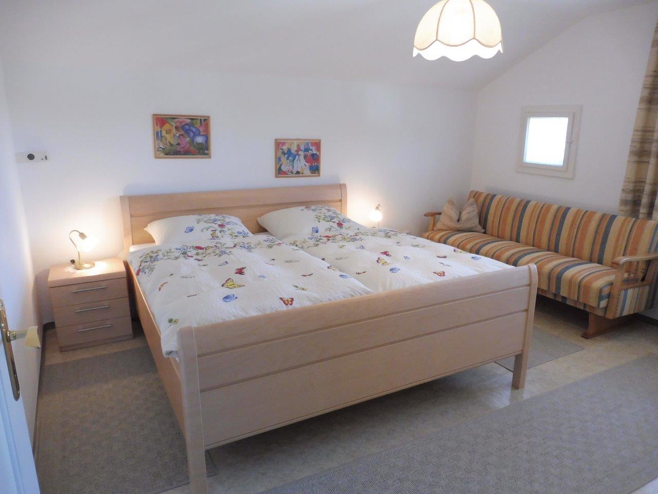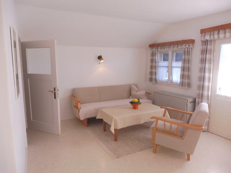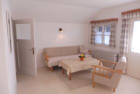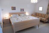 Über ein separates Treppenhaus erreicht man die großzügige Ferienwohnung mit 2 Schlafzimmern und großem Wohnraum mit Küchenzeile mit Geschirrspülmaschine sowie Südbalkon. Zusätzlich zu Dusche/WC befinden sich in jedem Schlafzimmer ein Waschbecken. Sie können bei uns bei offenem Fenster schlafen, Fliegengitter halten die lästigen Insekten fern. Stühle und ein Wäscheständer befinden sich auf dem Balkon.