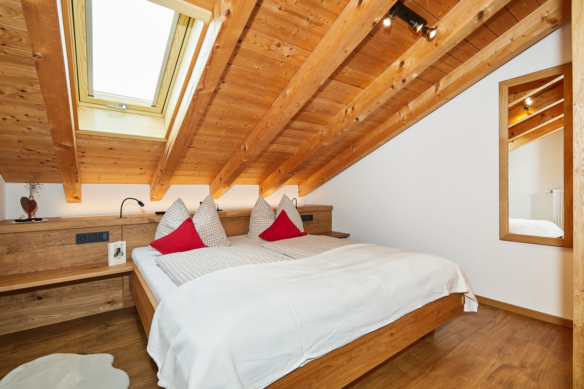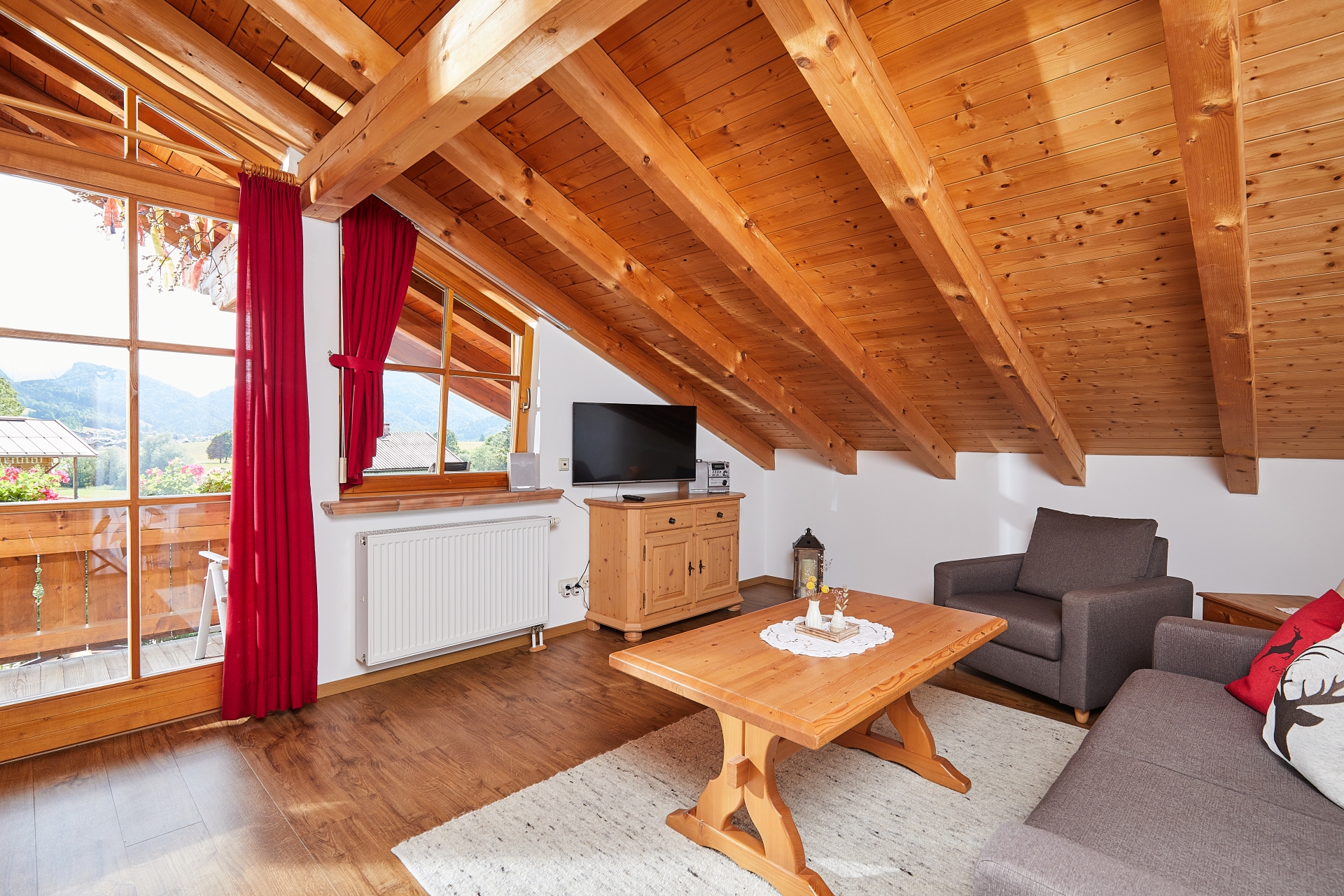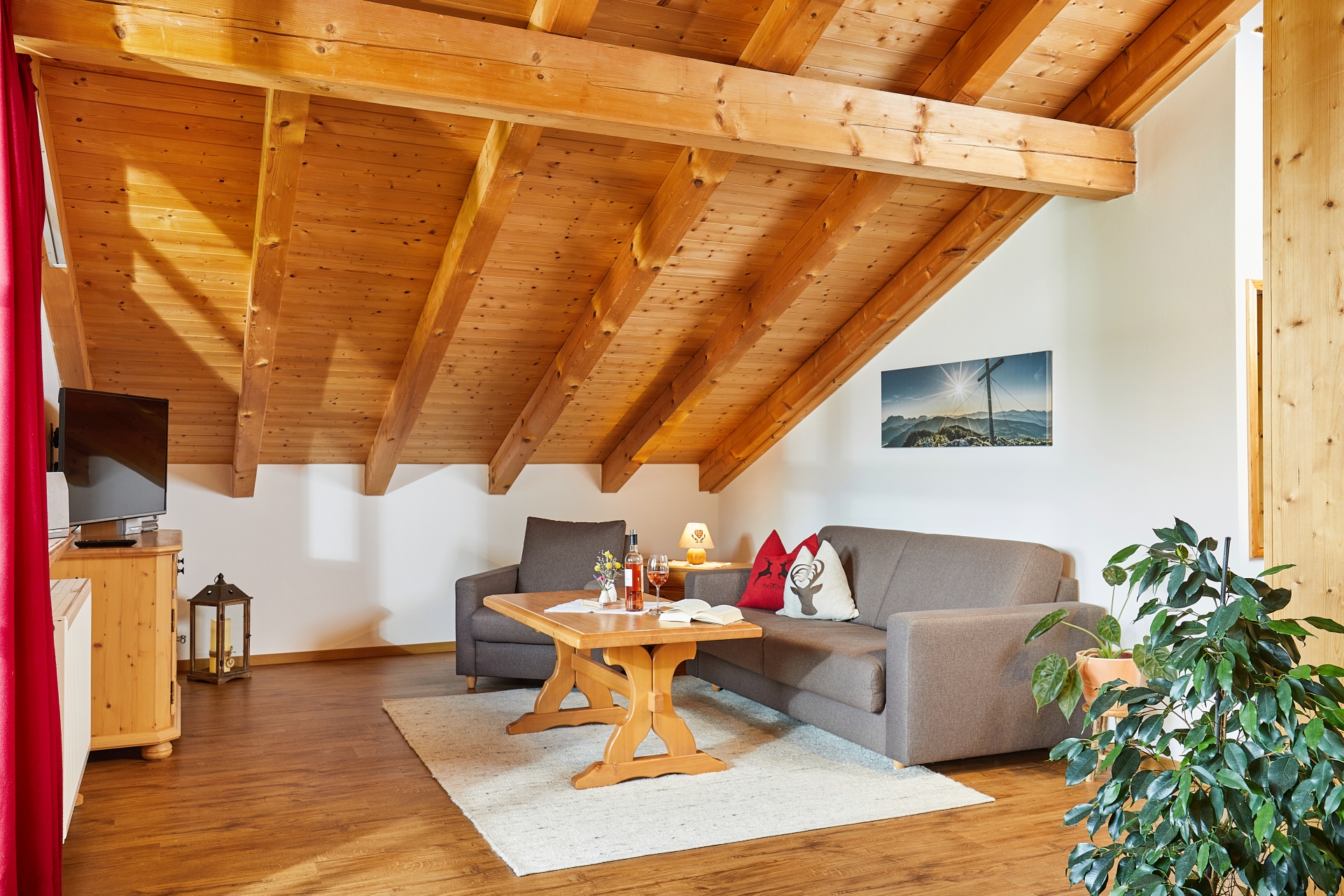 Bei der geräumigen Zwei-Zimmer-Mansardenwohnung (2. Obergeschoß) haben wir vor allem auf Komfort und Gemütlichkeit geachtet. Mit 67 m² bietet die Wohnung für 2-4 Personen ausreichend Platz. Die abgestimmte Einrichtung im Landhausstil, sowie die liebevolle Dekoration und der Sichtdachstuhl mit Giebelverglasung machen die Wohnung besonders behaglich und laden zum entspannen ein. Vom Balkon aus blicken Sie in Richtung Osten zum Walmberg in den Ort. Er bietet Platz zum Frühstücken oder ein Gläschen Wein zu genießen.