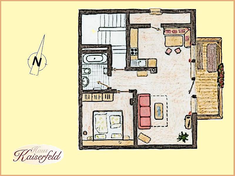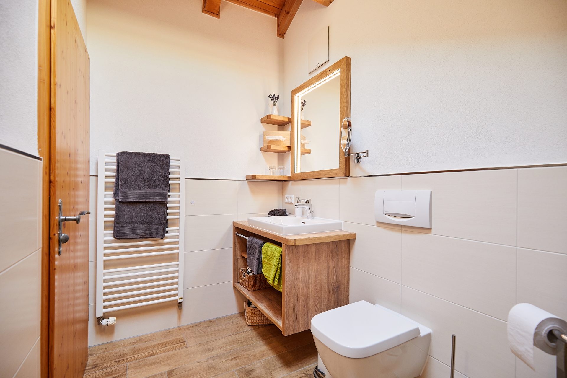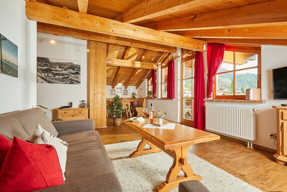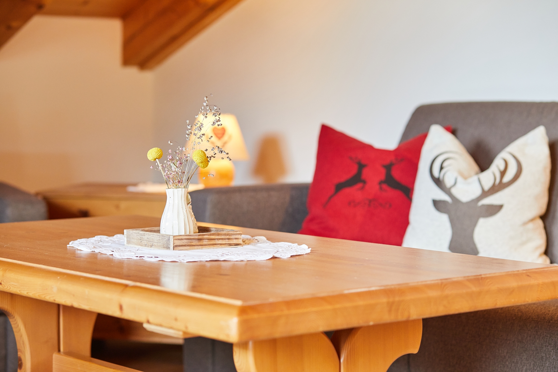 Bei der geräumigen Zwei-Zimmer-Mansardenwohnung (2. Obergeschoß) haben wir vor allem auf Komfort und Gemütlichkeit geachtet. Mit 67 m² bietet die Wohnung für 2-4 Personen ausreichend Platz. Die abgestimmte Einrichtung im Landhausstil, sowie die liebevolle Dekoration und der Sichtdachstuhl mit Giebelverglasung machen die Wohnung besonders behaglich und laden zum entspannen ein. Vom Balkon aus blicken Sie in Richtung Osten zum Walmberg in den Ort. Er bietet Platz zum Frühstücken oder ein Gläschen Wein zu genießen.