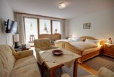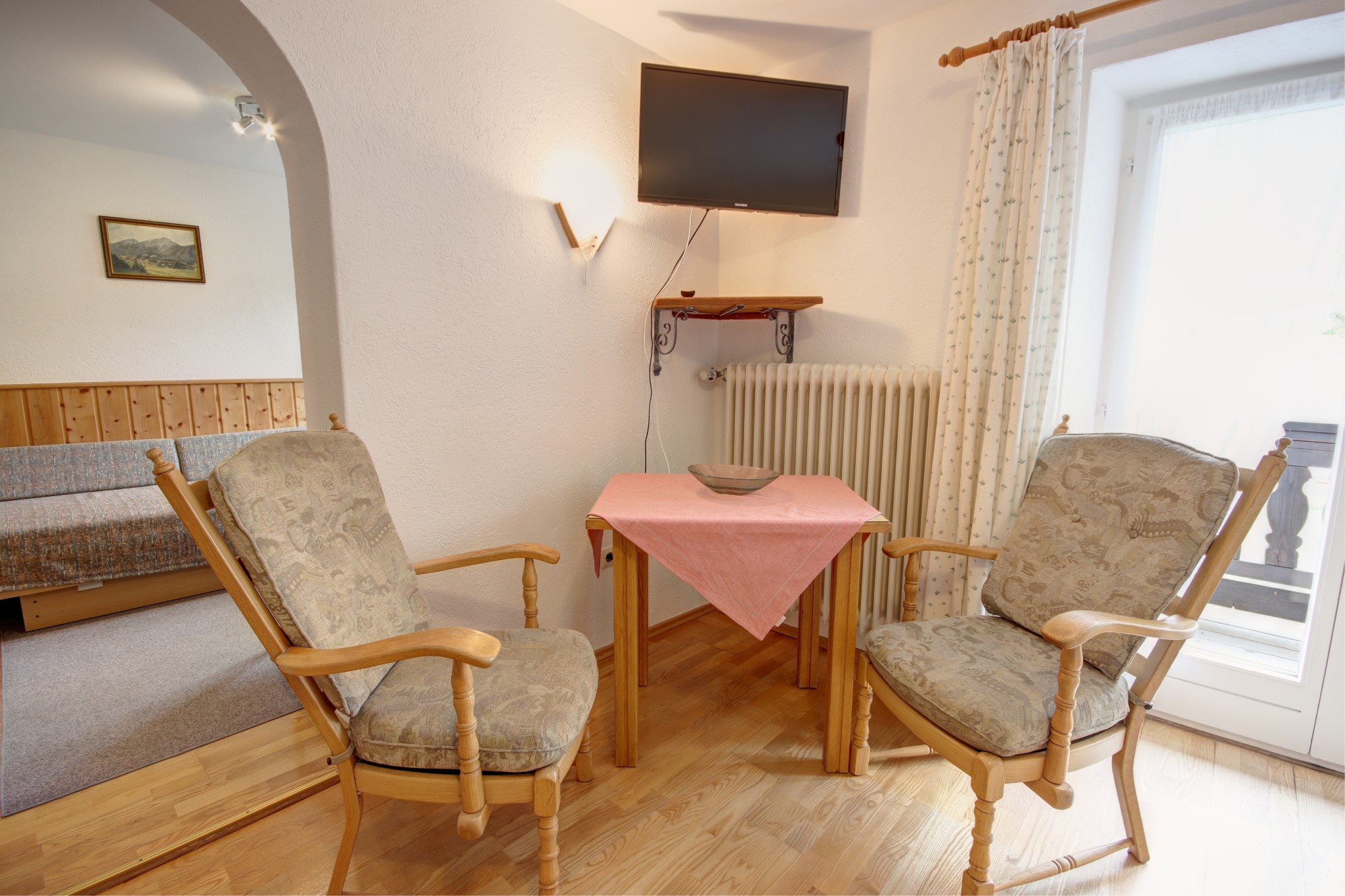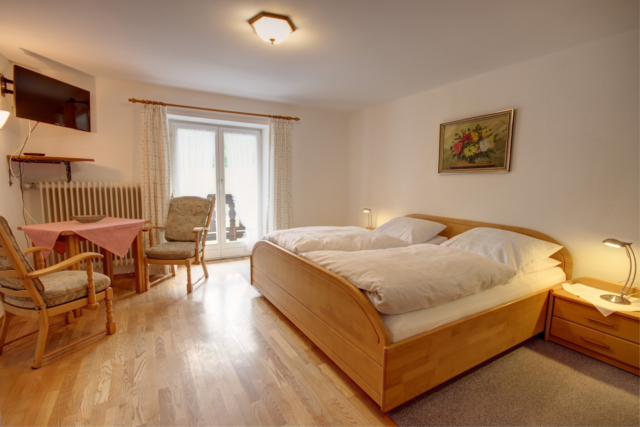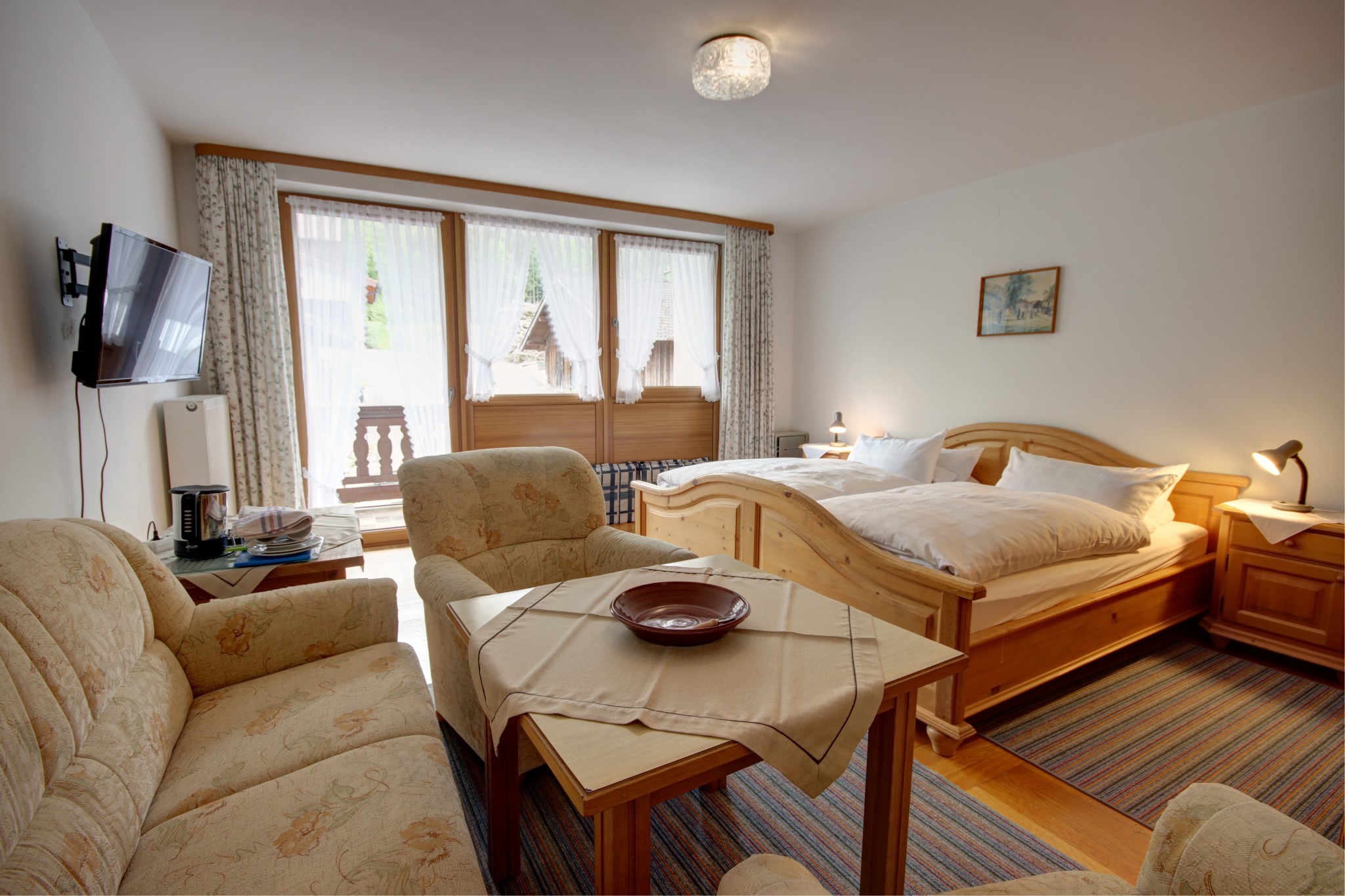 Der Wohnraum ist behaglich eingerichtet und beinhaltet eine gemütliche Sitzgruppe, TV, Safe und einen Wasserkocher . Auf dem Balkon mit Tisch und Stühlen genießen Sie die herrliche Aussicht. In der Dusche mit WC finden Sie einen fest installiertem Fön. Das Bett besitzt verstellbare Lattenroste. WLAN vorhanden.