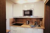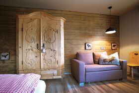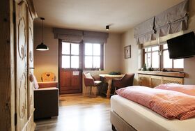 Das kleine Apartment im modernen Landhausstil besteht aus einem kombinierten Wohn-Schlafraum mit Doppelbett (160x200), Flat-Screen-TV, einem alten Bauernschrank und Holztisch sowie einem Schlaf-Sofa (120x200), einer gut ausgestatteten Küchenzeile und einem modernen Bad mit Dusche, großem Spiegel und Steinwaschbecken.