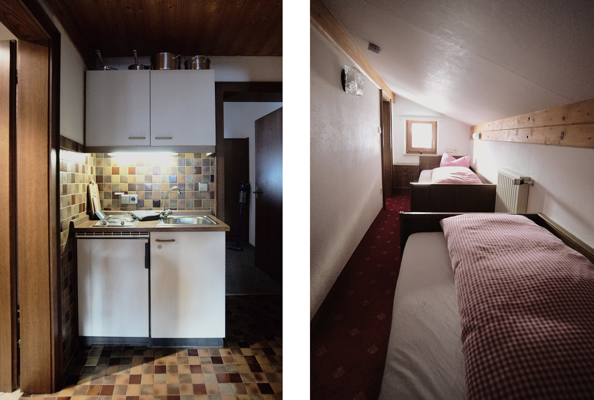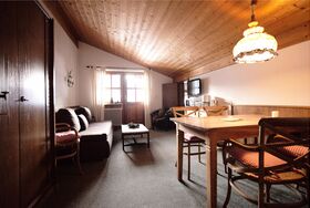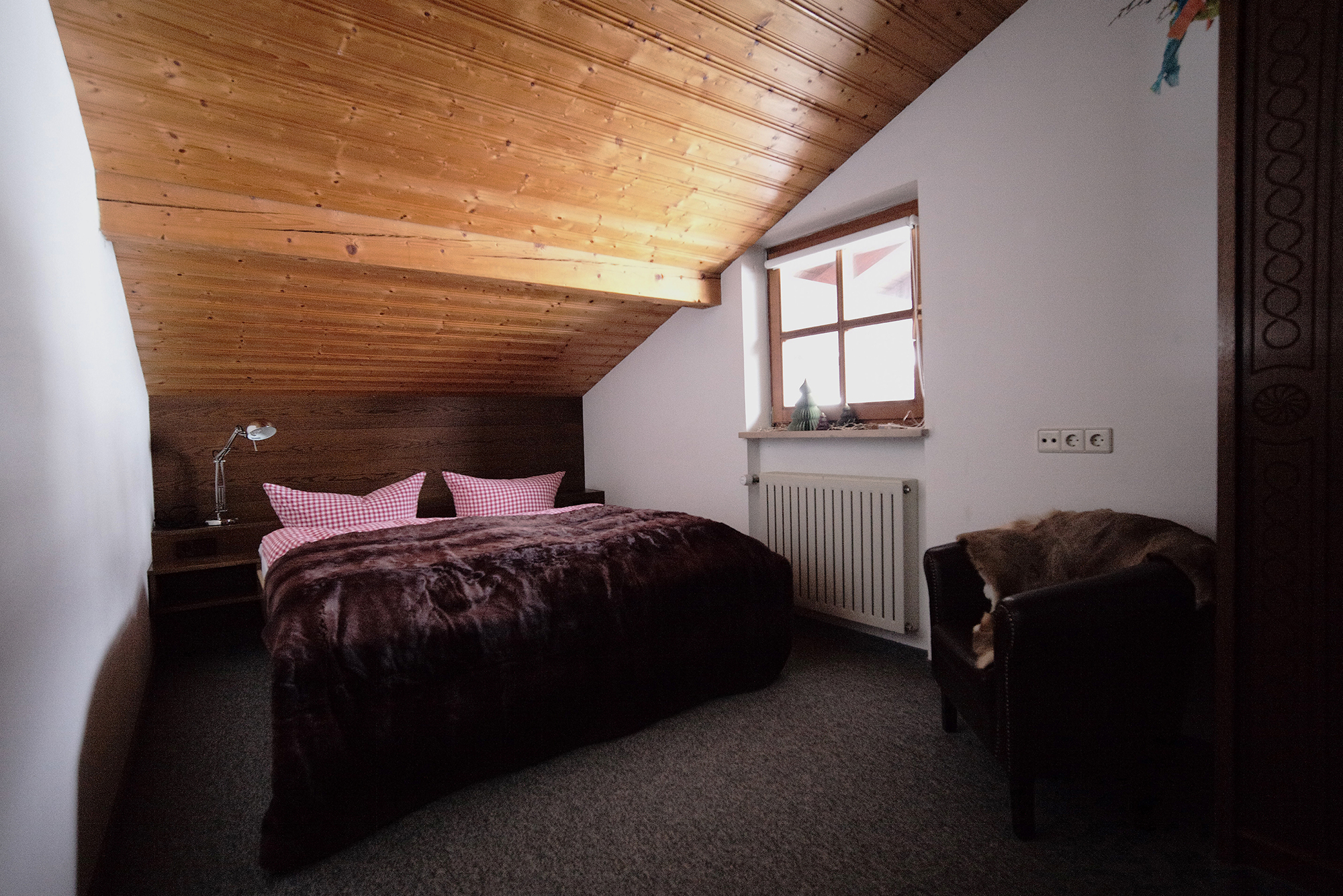 Das Quality-Apartment liegt im zweiten Stock und verfügt über einen möblierten Balkon mit Bergblick auf Fellhorn und Zahmer Kaiser. Es ist ausgelegt für eine Familie mit zwei Kindern oder für vier Personen, die sich nicht an der Dachschräge der Mansarde stören.