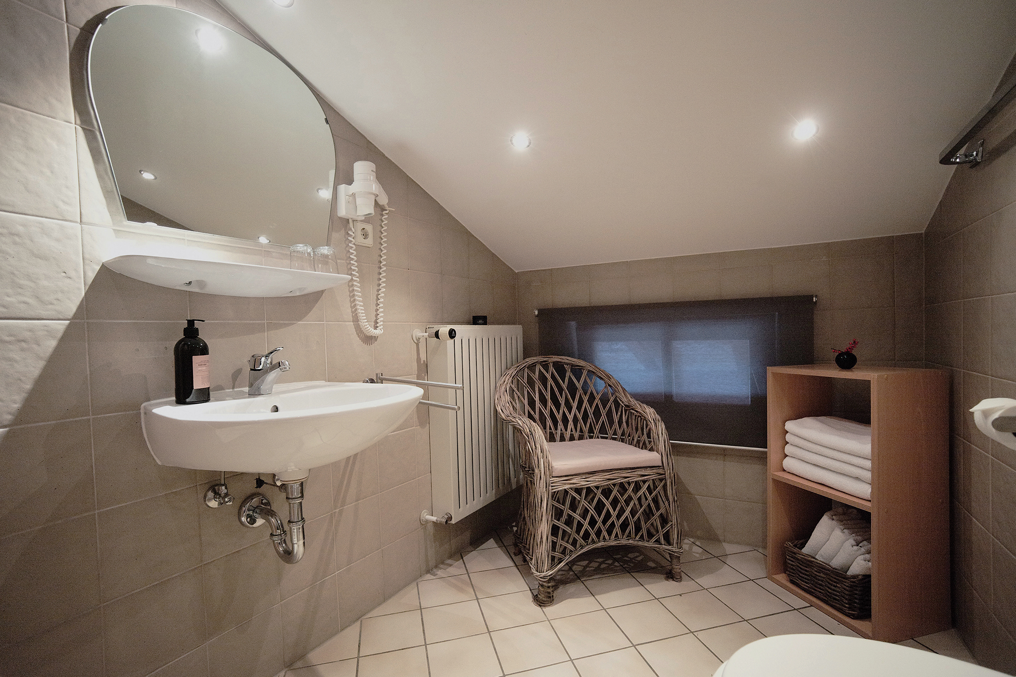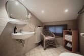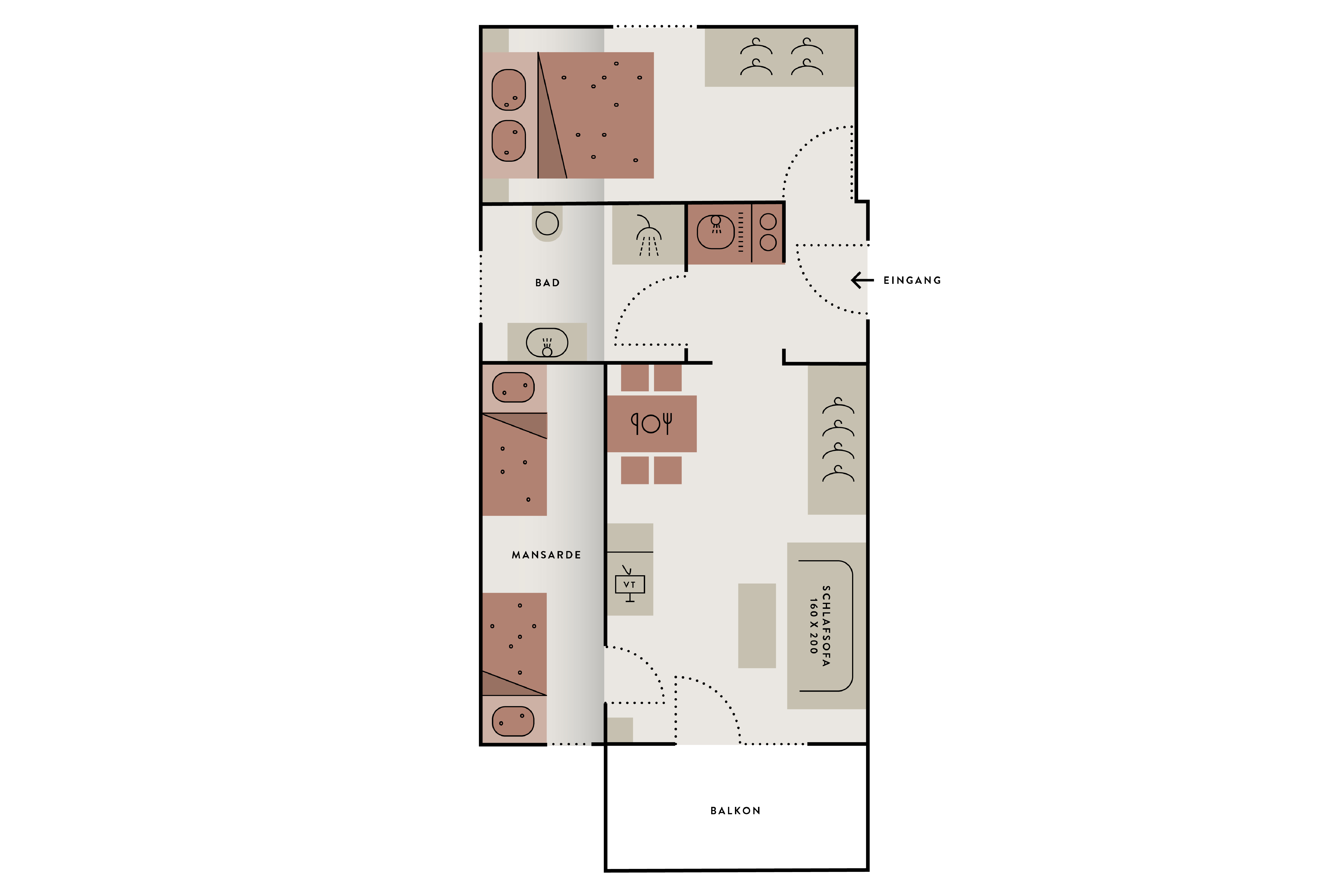 Das nach Süden ausgerichtete Dachgeschoß-Apartment besteht aus einem Wohn-Essraum mit Flat-Screen-TV, Schrank, gemütlicher Sitzecke und Schlaf-Sofa (160x200), einem separatem Schlafraum mit Doppelbett (180x200), Schrank und einem separaten Mansardenraum mit zwei Einzelbetten (90x200), einer kleinen Mini-Küchenzeile sowie Bad mit Dusche.