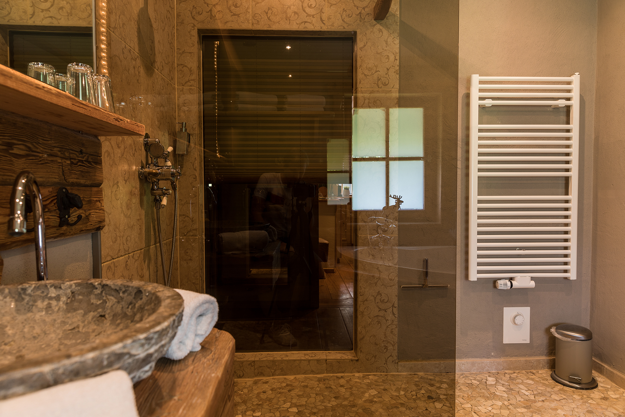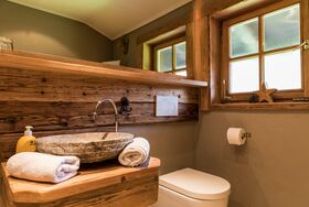 Das großzügige, stilvolle Apartment im modernen Landhausstil besteht aus einer einladenden Diele, einem großen Wohn-Essraum mit voll ausgestatteter Küche, Kachelofen, zwei Flat-Screen-TVs und großer Sitzecke, zwei separaten Schlafzimmern mit Doppelbetten (180x200/160x200), einem urigen, über eine Holztreppe zu erreichenden Schlafboden (Dachschräge) mit vier nebeneinander liegenden Einzel-Betten (4x90x200) sowie zwei modernen Bädern mit großen Spiegeln, Steinwaschbecken, bodenebenen Duschen, Eckbadewanne, Handtuch-Heizkörpern und Fußbodenheizung.