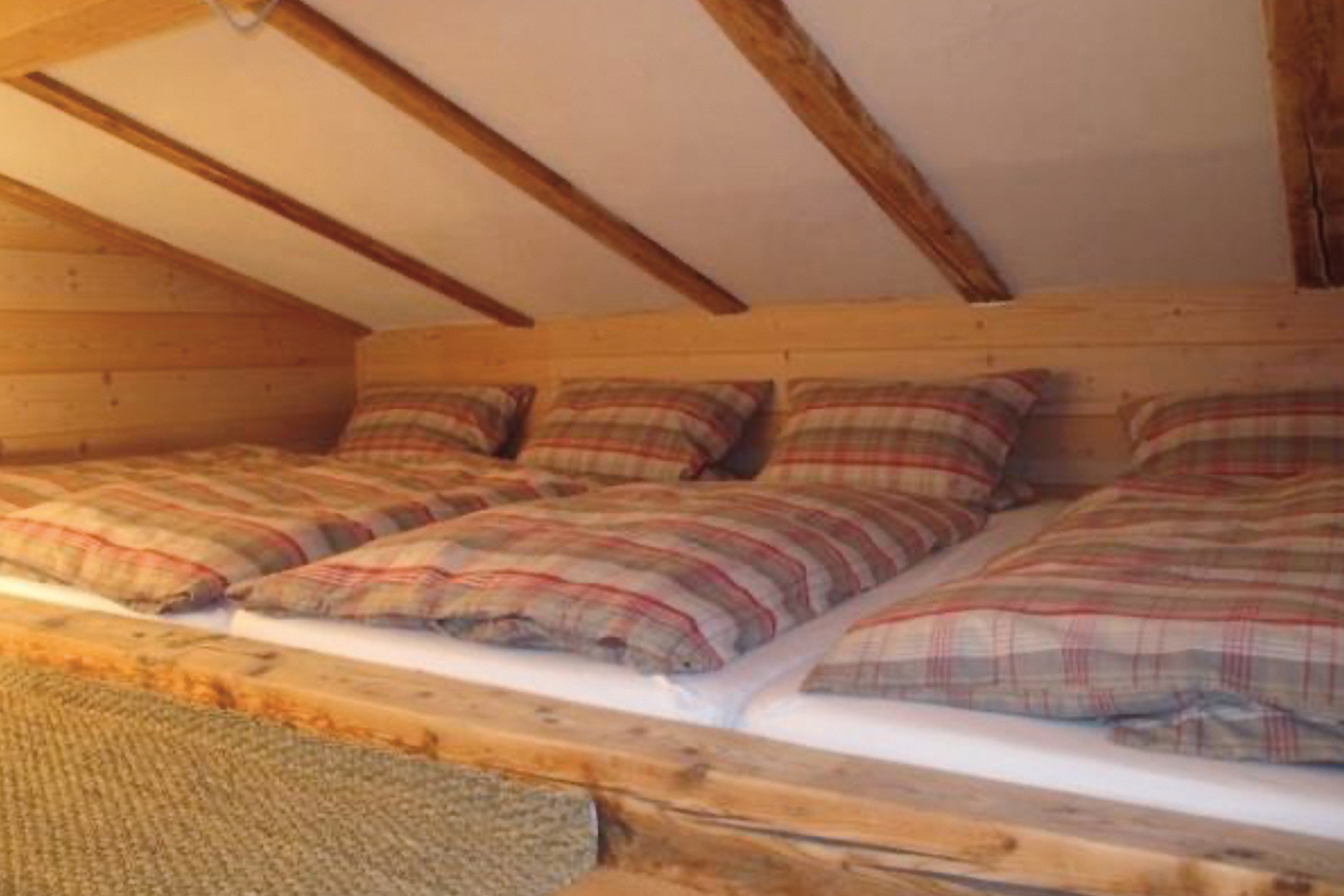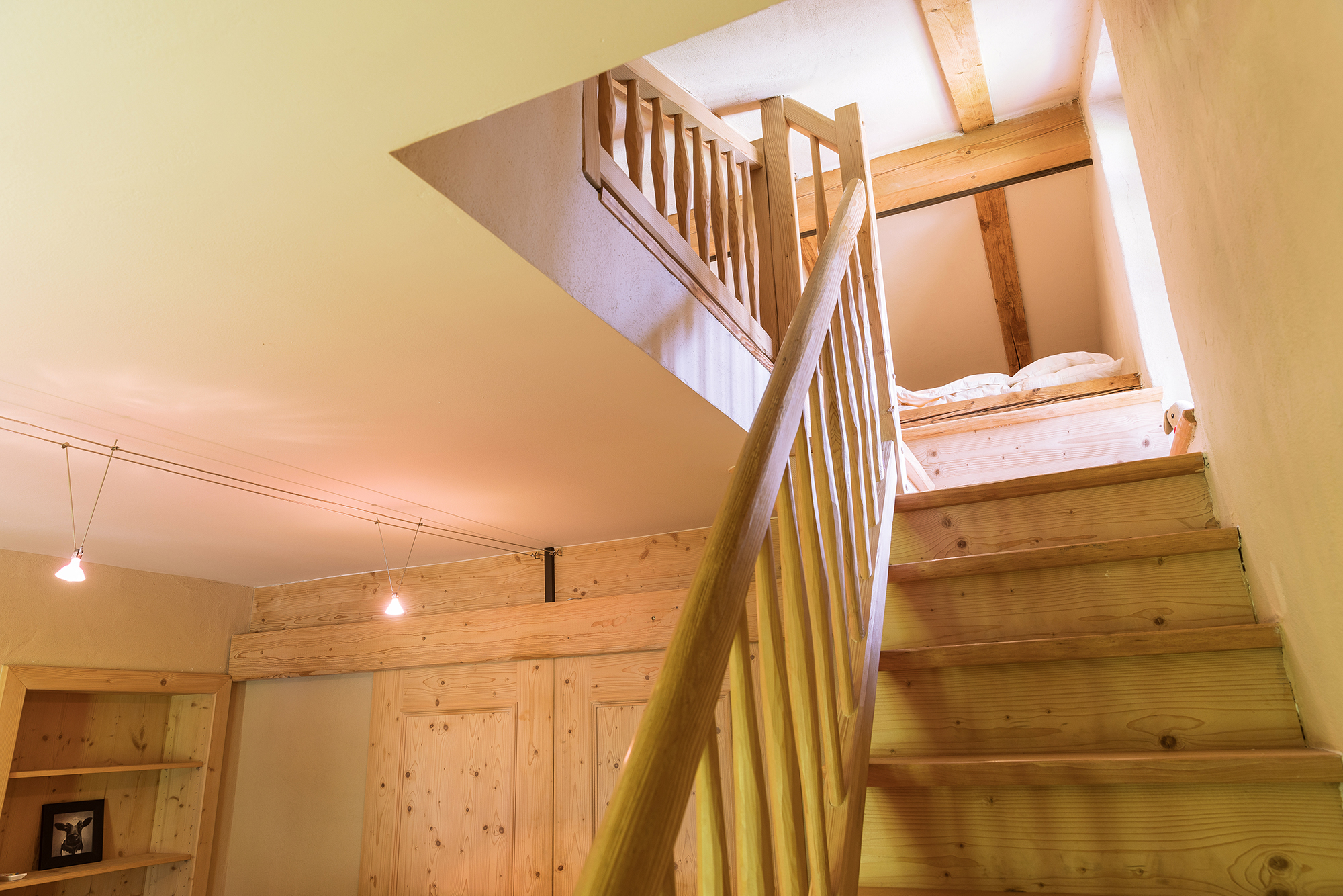 Das Apartment liegt im ersten Stock und verfügt über einen nach Westen ausgerichteten möblierten Balkon. Es ist ausgelegt für zwei mal zwei Erwachsene mit vier Kindern oder für acht Personen, die sich nicht an der Dachschräge des Schlafbodens stören.