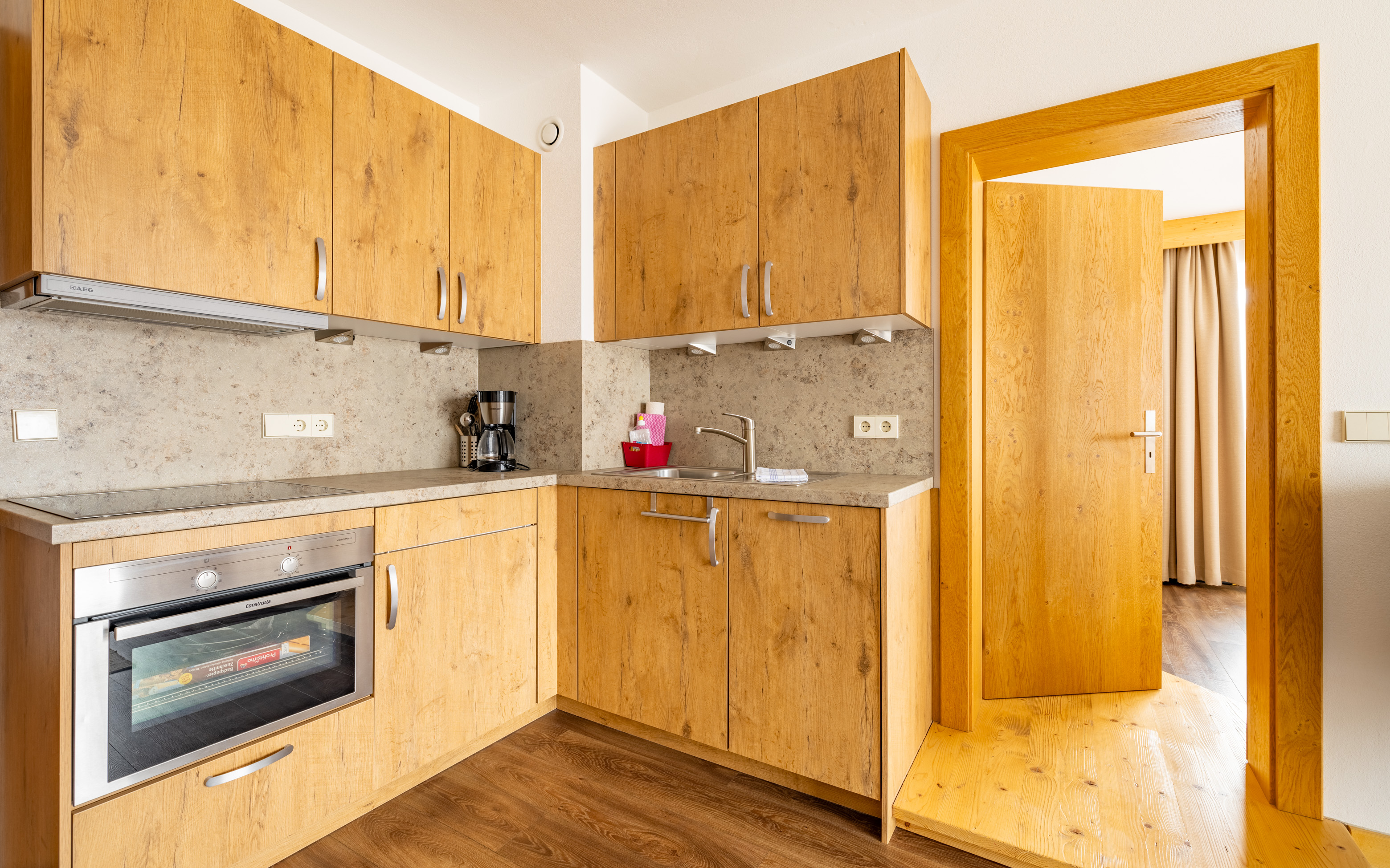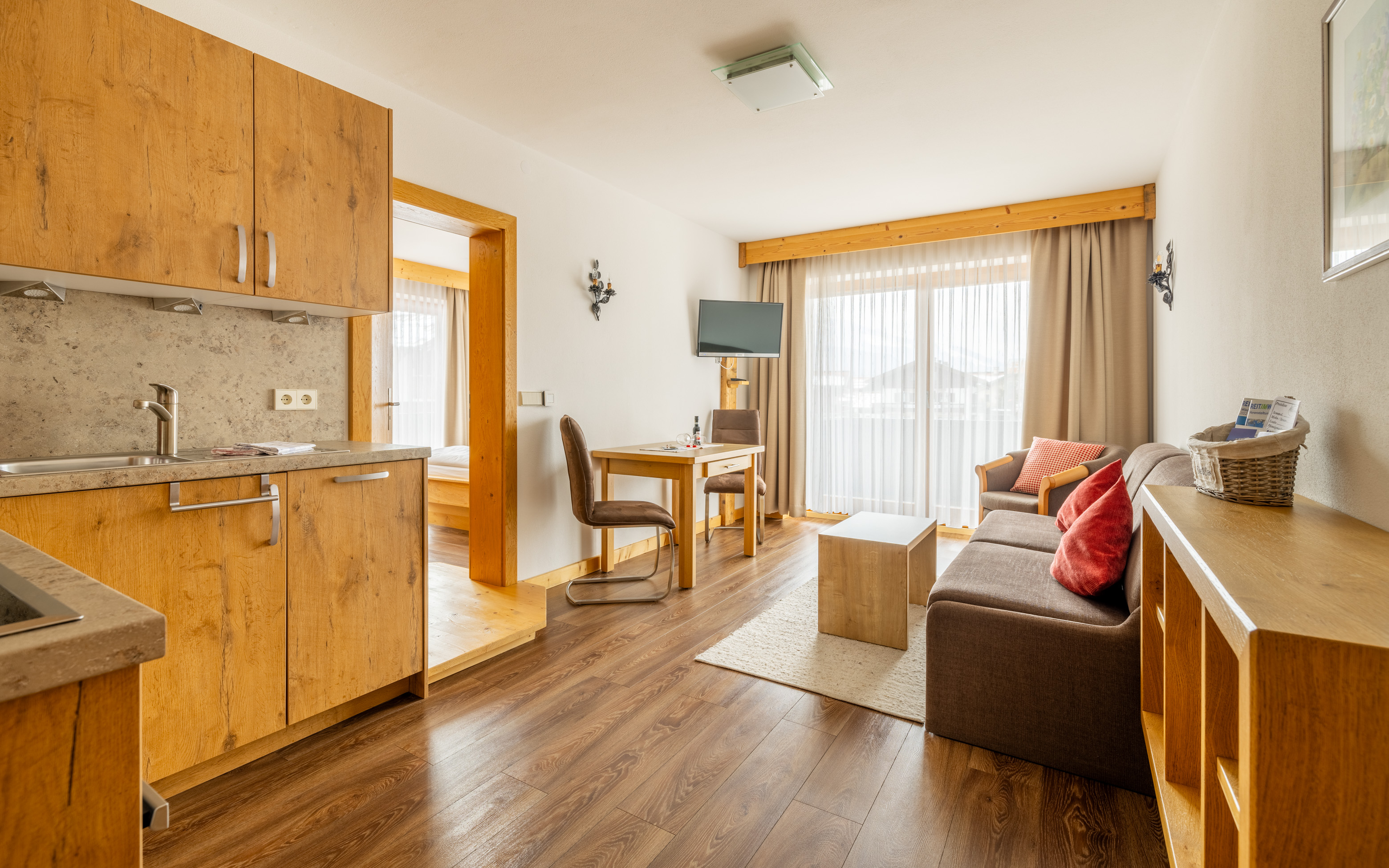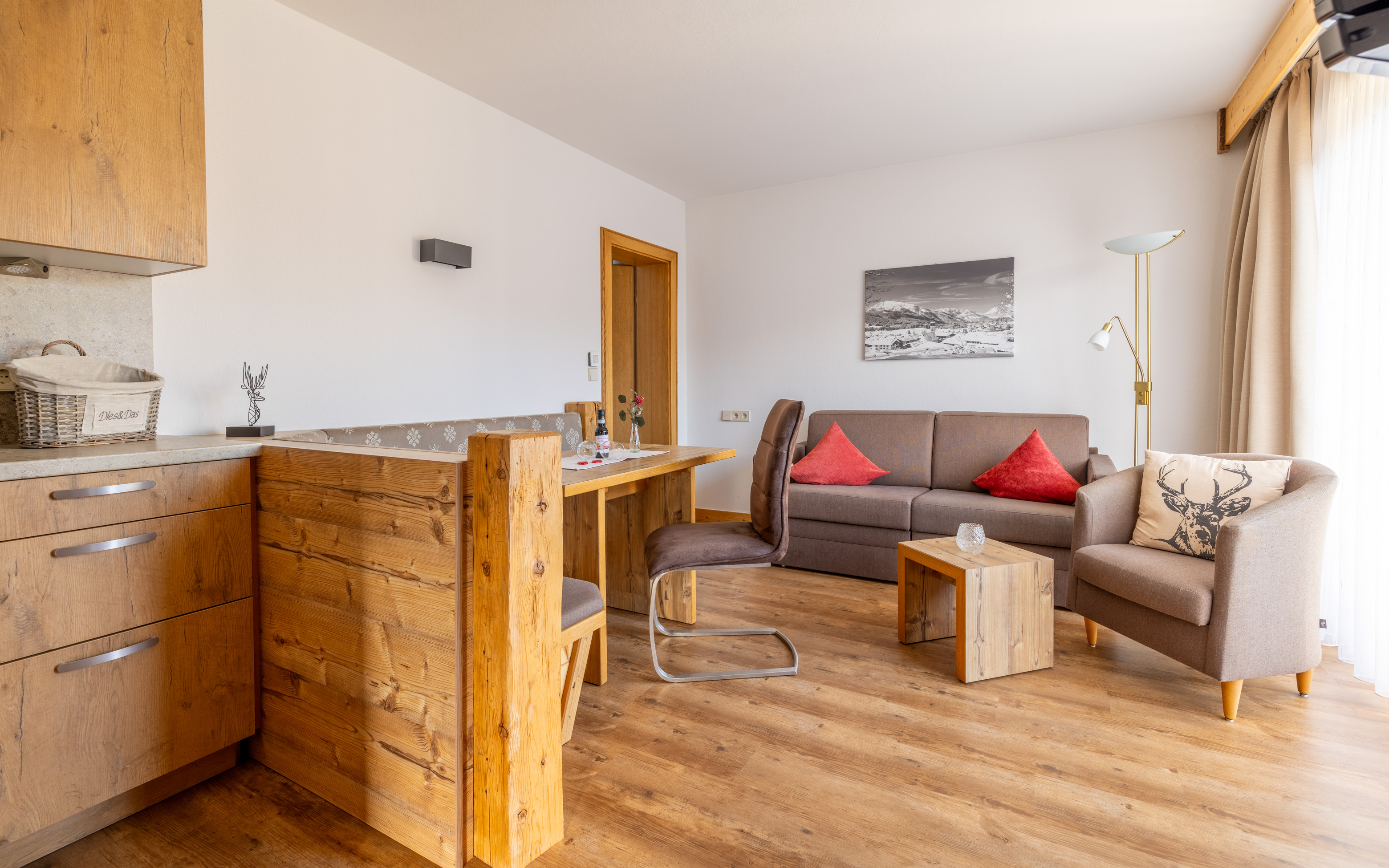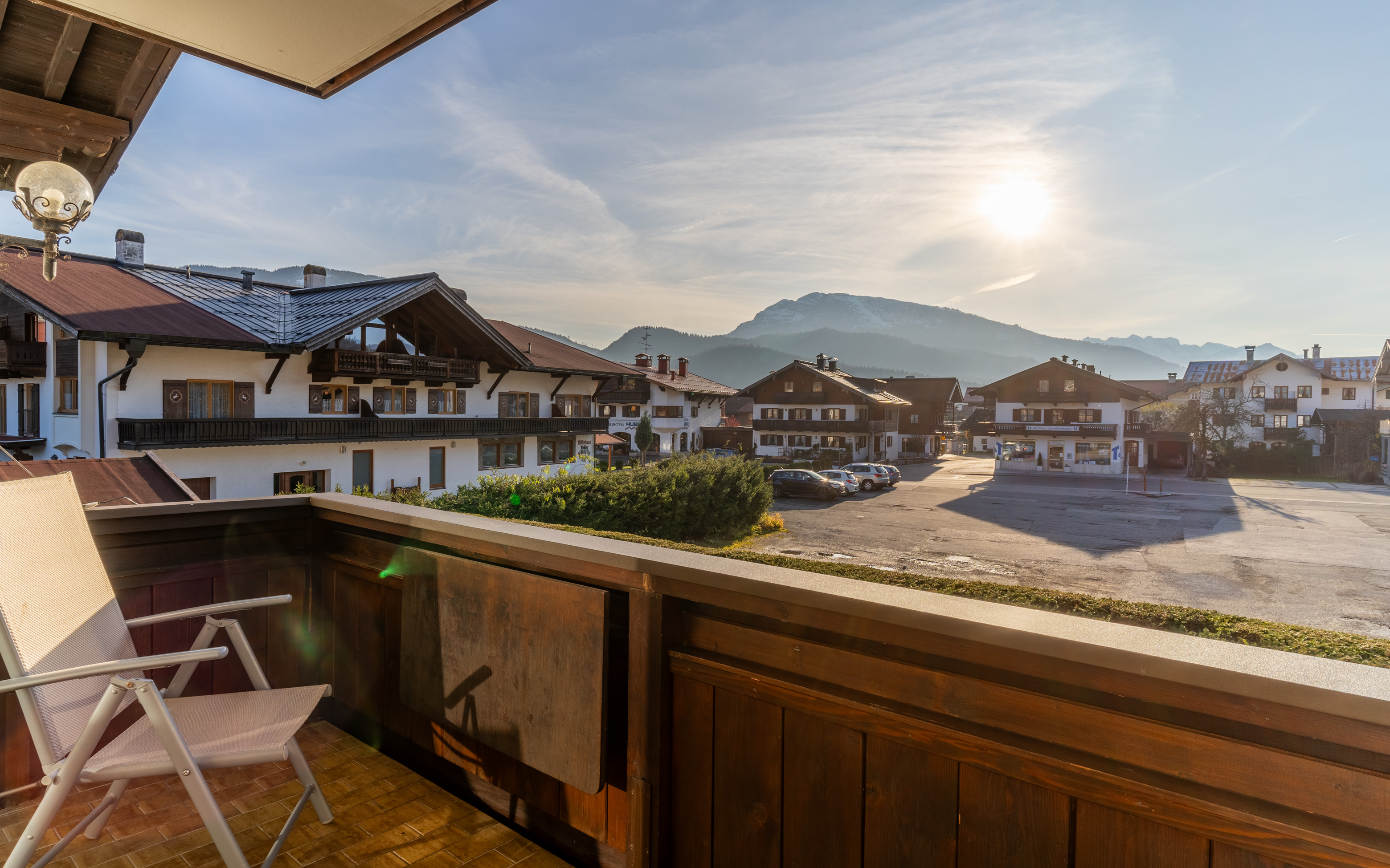 Die neu renovierte, großzügige 2-Raumwohnung im 1. OG hat eine Größe von ca. 41 qm. Die exklusive Wohnung verfügt über ein Schlafzimmer mit DU/WC (Fußbodenheizung) und großem Süd-Balkon (Blick auf den Garten), eine hochwertige moderne Küchenzeile (mit Geschirrspüler, Backofen, 4-Platten-Ceranfeld, Kaffeemaschine, Toaster, uvm.) und ein schönes helles Wohn/Esszimmer mit Panoramafenster, gemütlicher Essecke und einer hochwertigen Ausziehcouch. Vom West-Balkon hat man einen wunderbaren Blick auf das Kaisergebirge und den Unterberg.
