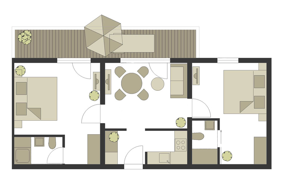 Wir verfügen über sonnige, große, mit viel Liebe zum Detail und Komfort komplett neu renovierte Ferienwohnungen mit Bergblick, die Sie einladen, sich zu entspannen und ein paar erholsame Tage in dieser herrlichen Gegend zu verbringen. Unsere Zweiraumwohnungen verfügen über Schlafzimmer mit Dusche/WC, die Dreiraumwohnungen über zwei separate Schlafzimmer mit Dusche/WC, nahezu alle zusätzlich mit Flat-TV im den Schlafzimmern. Alle neu renovierten Wohnungen haben moderne Einbauküchen mit Geschirrspüler, Backofen und 4-Platten-Cerankochfeld, gemütliche und sonnige Wohn-/Esszimmer, Flat-TV, große Balkone und vieles mehr.