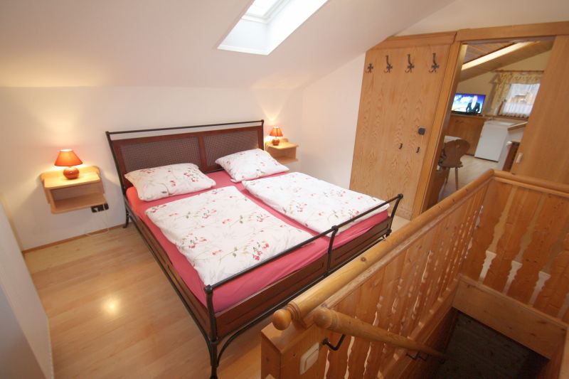 Von den Schafzimmern im Erdgeschoss führt eine Treppe nach oben in ein Durchgangszimmer mit einem weiterem Doppelbett. Das Badezimmer mit Dusche und WC und die Küche mit Sitzecke und Fernseher runden das Raumangebot im Obergeschoss ab.