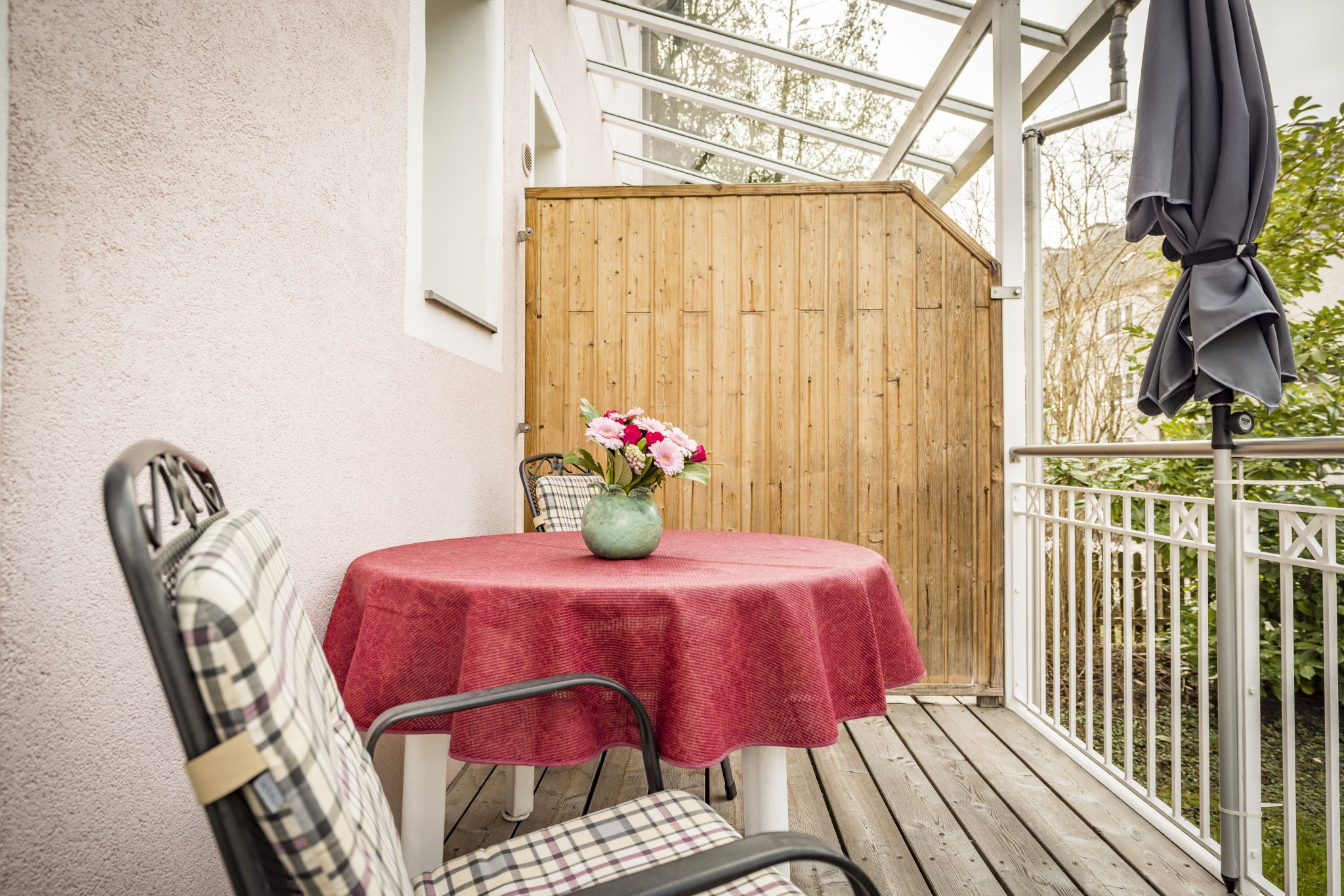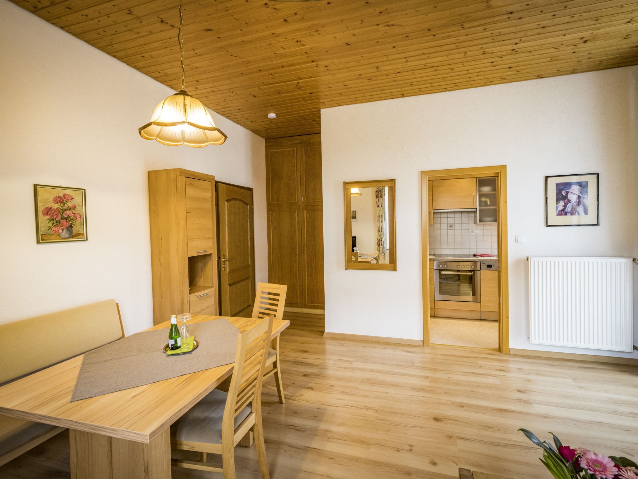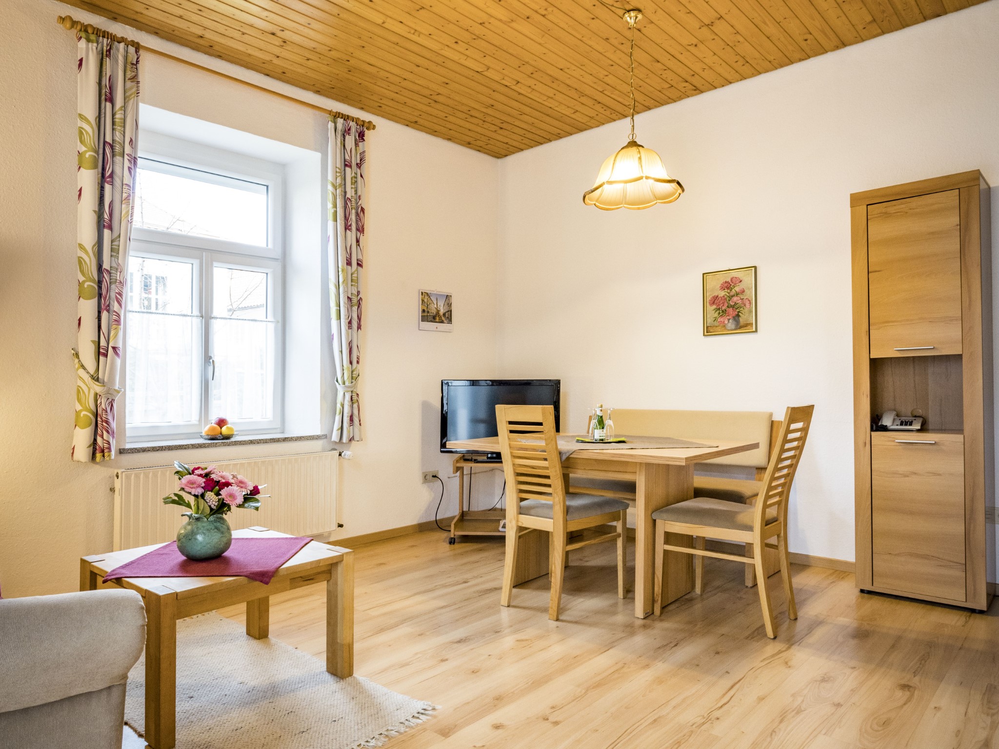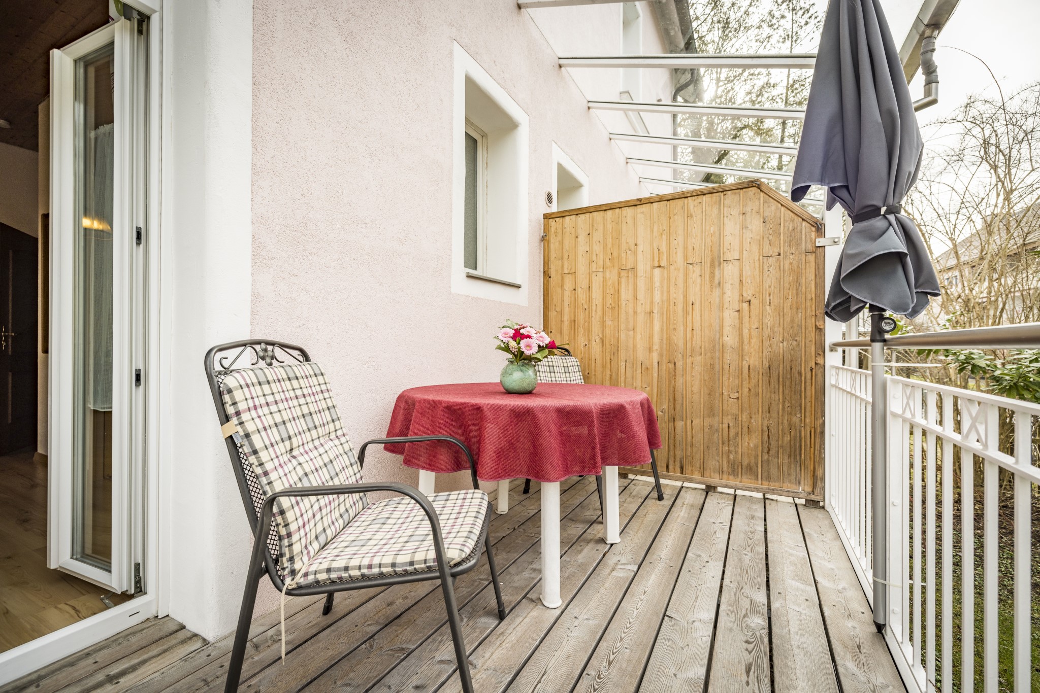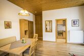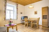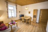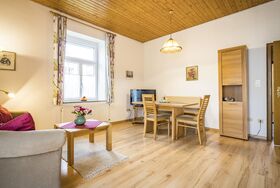 Zwei-Zimmer-Nichtraucher-Wohnung für 1 - 2 Personen mit großem, glasüberdachtem Balkon. Die Wohnung mit 47qm verfügt über ein Wohnzimmer mit Essplatz (Tisch mit Bank und 2 Stühlen), eine Couch mit Couchtisch (ausziehbar als Schlafplatz falls 2 Personen getrennt schlafen wollen), großem Einbauschrank, Balkon, TV, Radio, W-Lan, eine abgeschlossene Küche mit Spülmaschine, Backofen, 4-Platten-Ceran-Kochfeld, Kühlschrank mit Gefrierfach, Kaffeemaschine, Wasserkocher und Toaster. Das Schlafzimmer ist mit einem Doppelbett (Lattenroste höhenverstellbar) ausgestattet. Das Badezimmer hat Dusche/WC, Fön und Fenster, die Garderobe finden Sie im Flur. Lage: Hochparterre (5 Stufen). Das Rauchen am Balkon ist erlaubt. Wir bieten Ihnen kostenlosen wöchentlichen Hand-, Dusch- und Küchentücherwechsel.