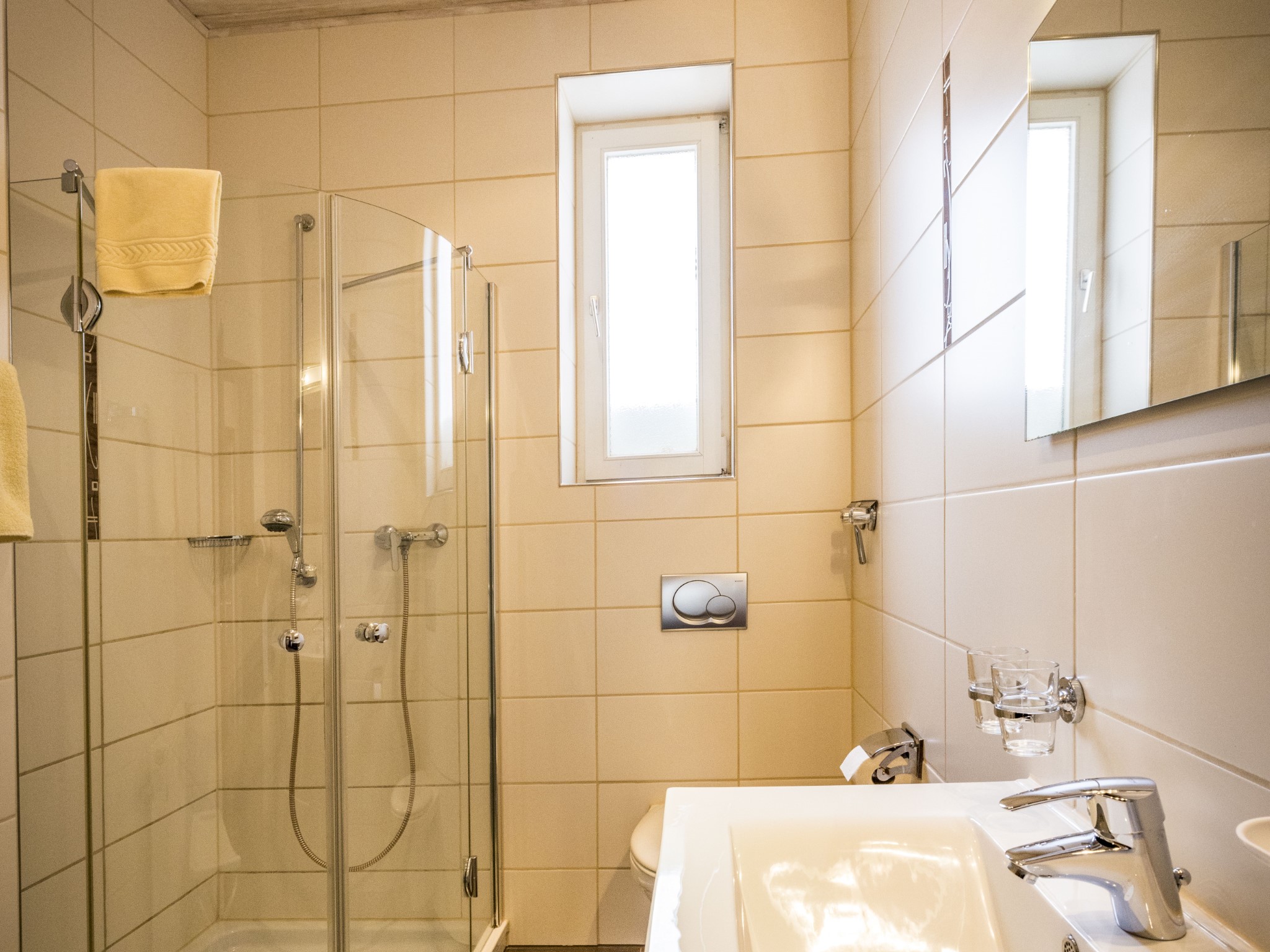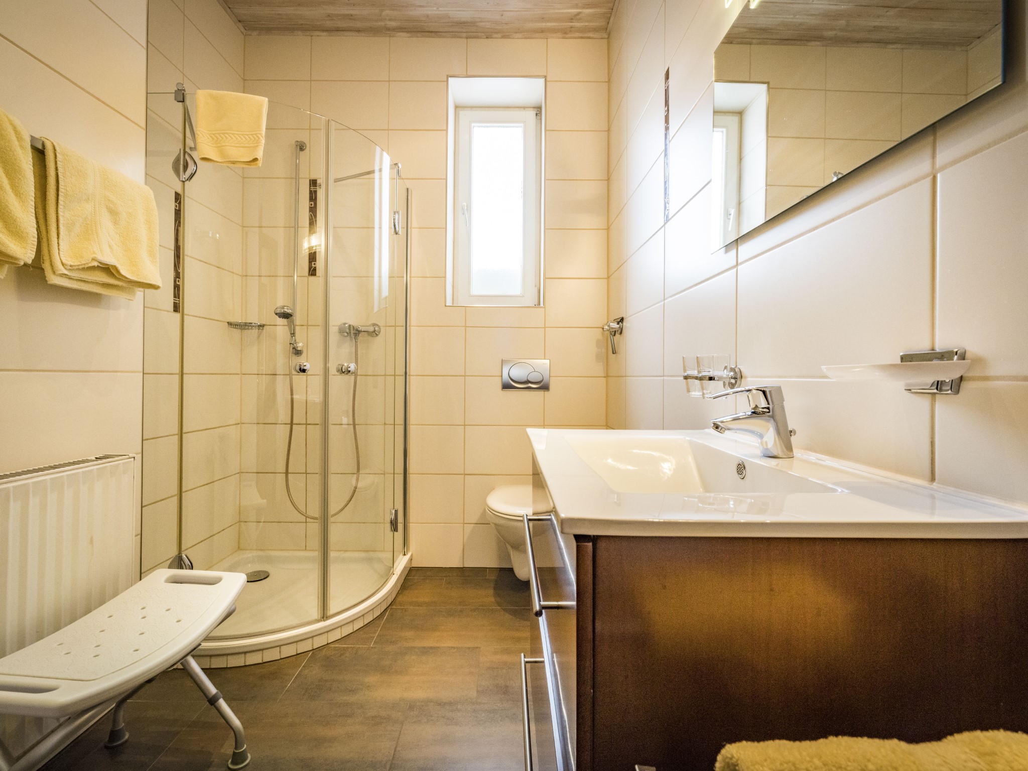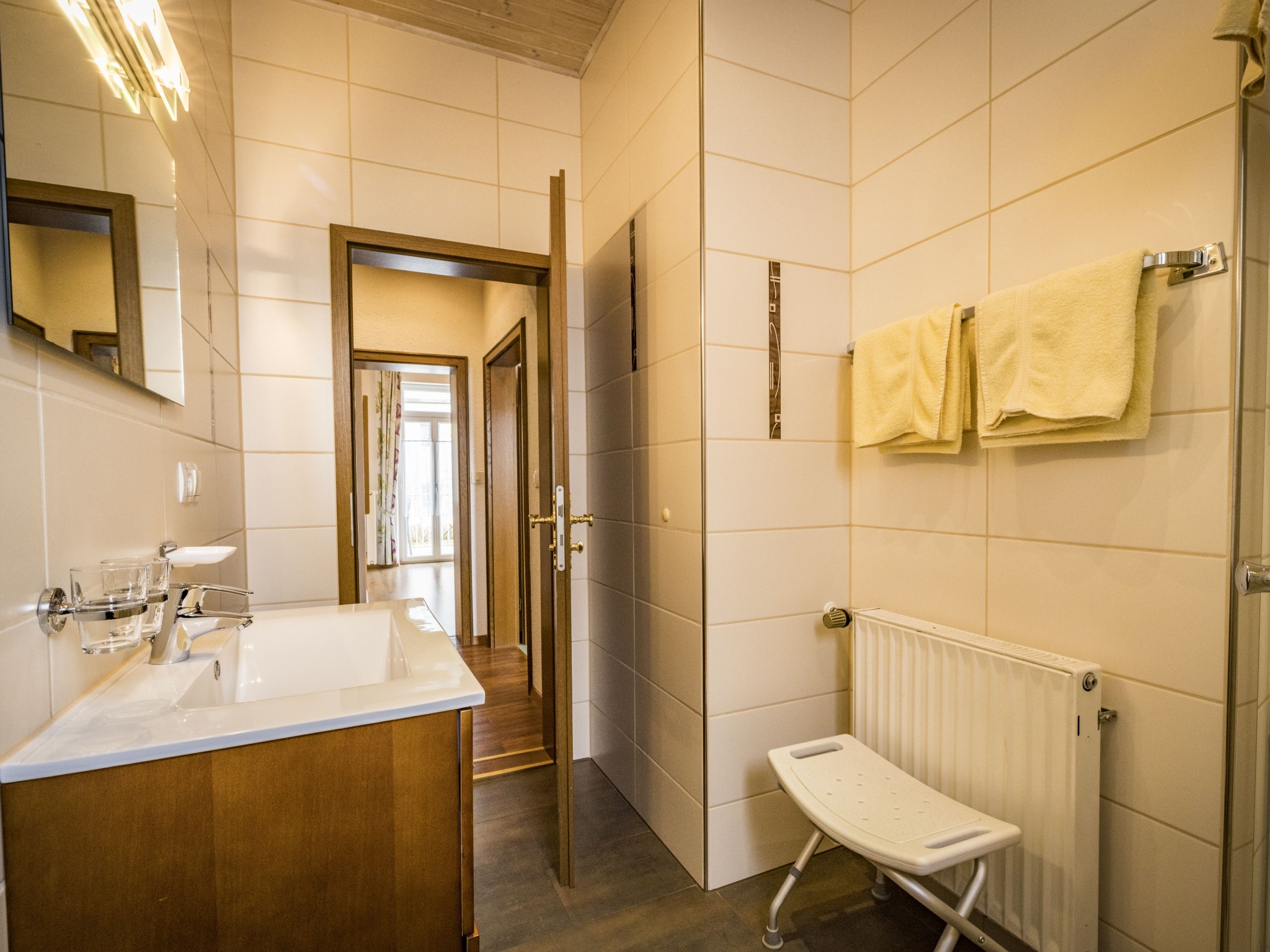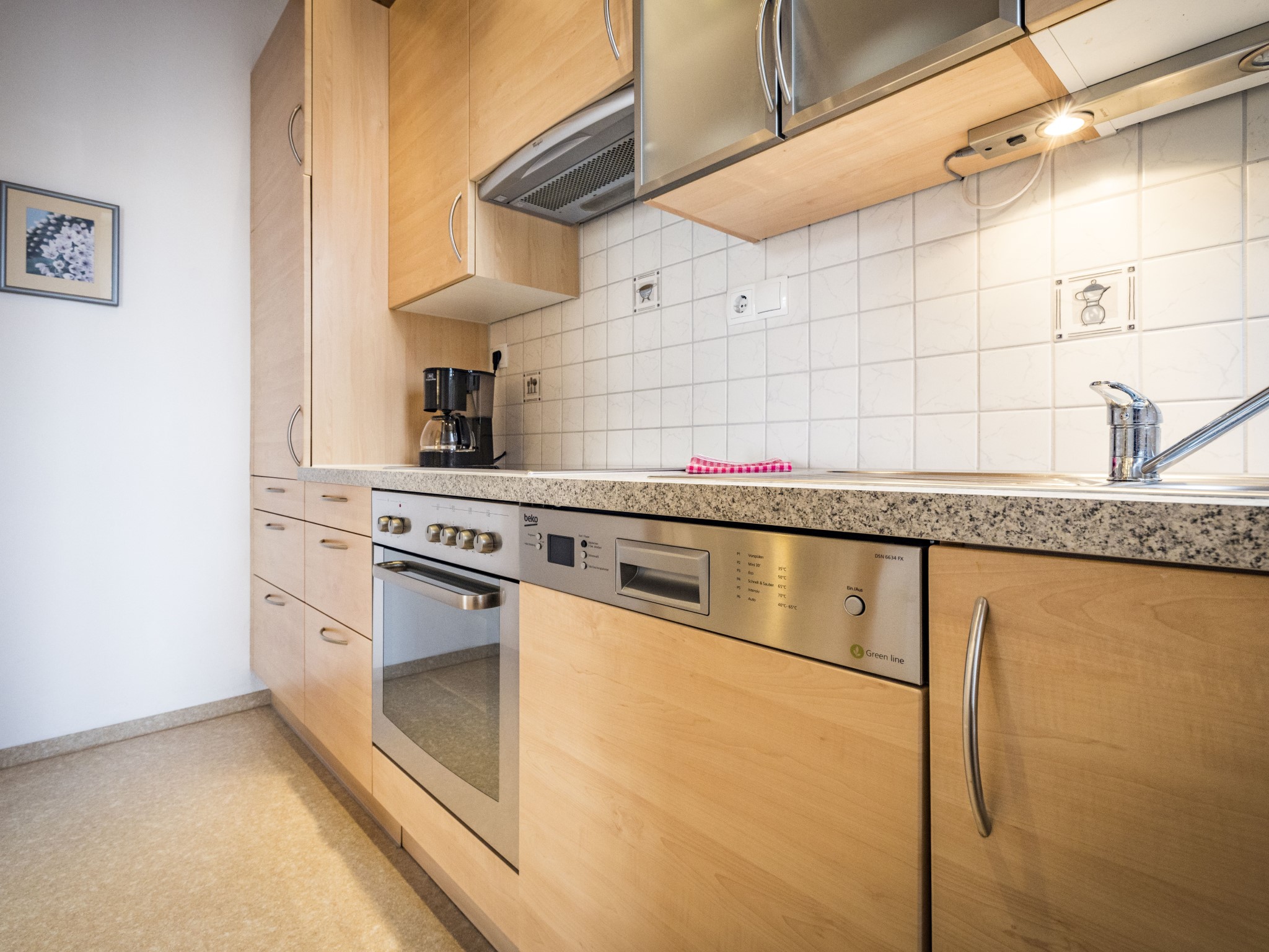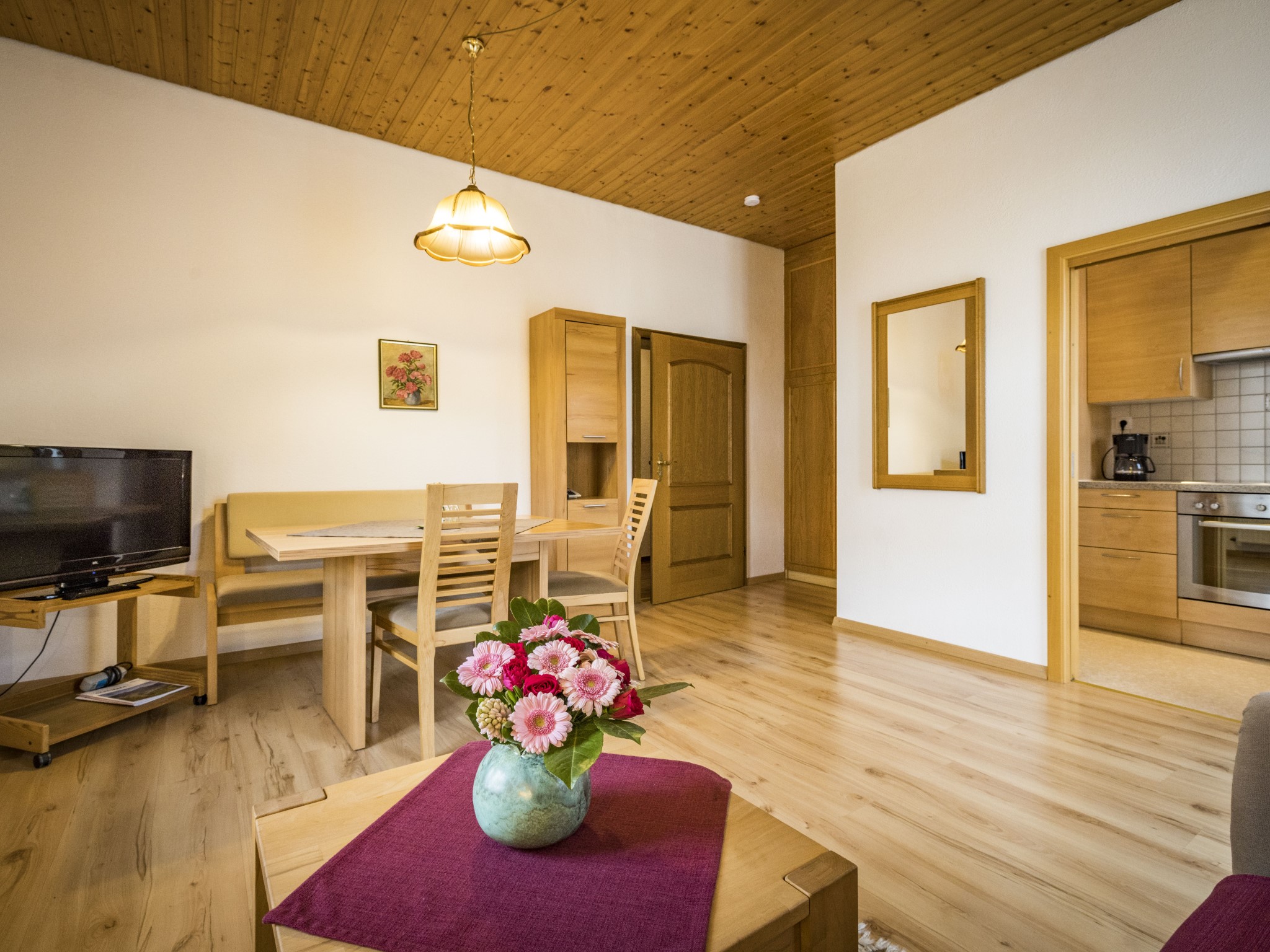 Zwei-Zimmer-Nichtraucher-Wohnung für 1 - 2 Personen mit großem, glasüberdachtem Balkon. Die Wohnung mit 47qm verfügt über ein Wohnzimmer mit Essplatz (Tisch mit Bank und 2 Stühlen), eine Couch mit Couchtisch (ausziehbar als Schlafplatz falls 2 Personen getrennt schlafen wollen), großem Einbauschrank, Balkon, TV, Radio, W-Lan, eine abgeschlossene Küche mit Spülmaschine, Backofen, 4-Platten-Ceran-Kochfeld, Kühlschrank mit Gefrierfach, Kaffeemaschine, Wasserkocher und Toaster. Das Schlafzimmer ist mit einem Doppelbett (Lattenroste höhenverstellbar) ausgestattet. Das Badezimmer hat Dusche/WC, Fön und Fenster, die Garderobe finden Sie im Flur. Lage: Hochparterre (5 Stufen). Das Rauchen am Balkon ist erlaubt. Wir bieten Ihnen kostenlosen wöchentlichen Hand-, Dusch- und Küchentücherwechsel.