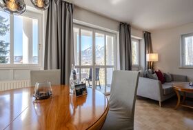 In absoluter Ruhe, aber dennoch nur wenige Schritte von der Fußgängerzone entfernt, genießen Sie in einem architektonisch anspruchsvollen Haus von Ihrem Balkon oder der Sonnenterrasse den Blick auf ein faszinierendes Bergpanorama. Die Appartements sind im klassisch-eleganten Stil eingerichtet und haben eine Größe zwischen 45 und 98 qm. Sie bieten bis zu vier Personen Platz und verfügen alle über getrennte Wohn- und Schlafräume, Bad und Balkon. Unsere Ferienwohnungsanlage ist mit Panoramaaufzug, Innenlift, Waschküche, Fahrradraum, sowie einer Tiefgarage ausgestattet. Außerdem verfügen wir über eine Lounge mit Getränkekühlschrank (Selbstbedienung). Hunde sind in unserem Haus willkommen.