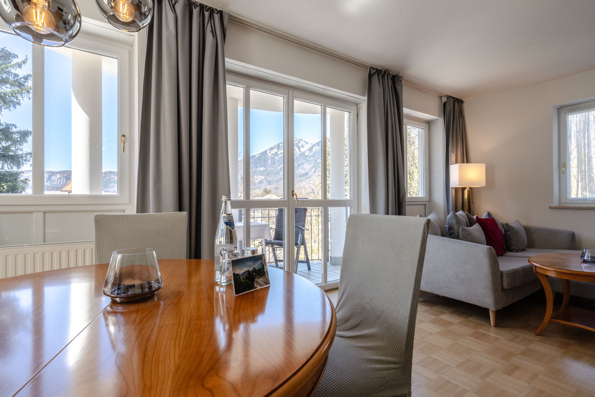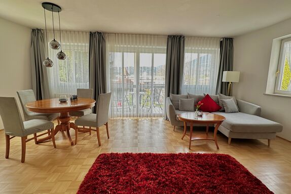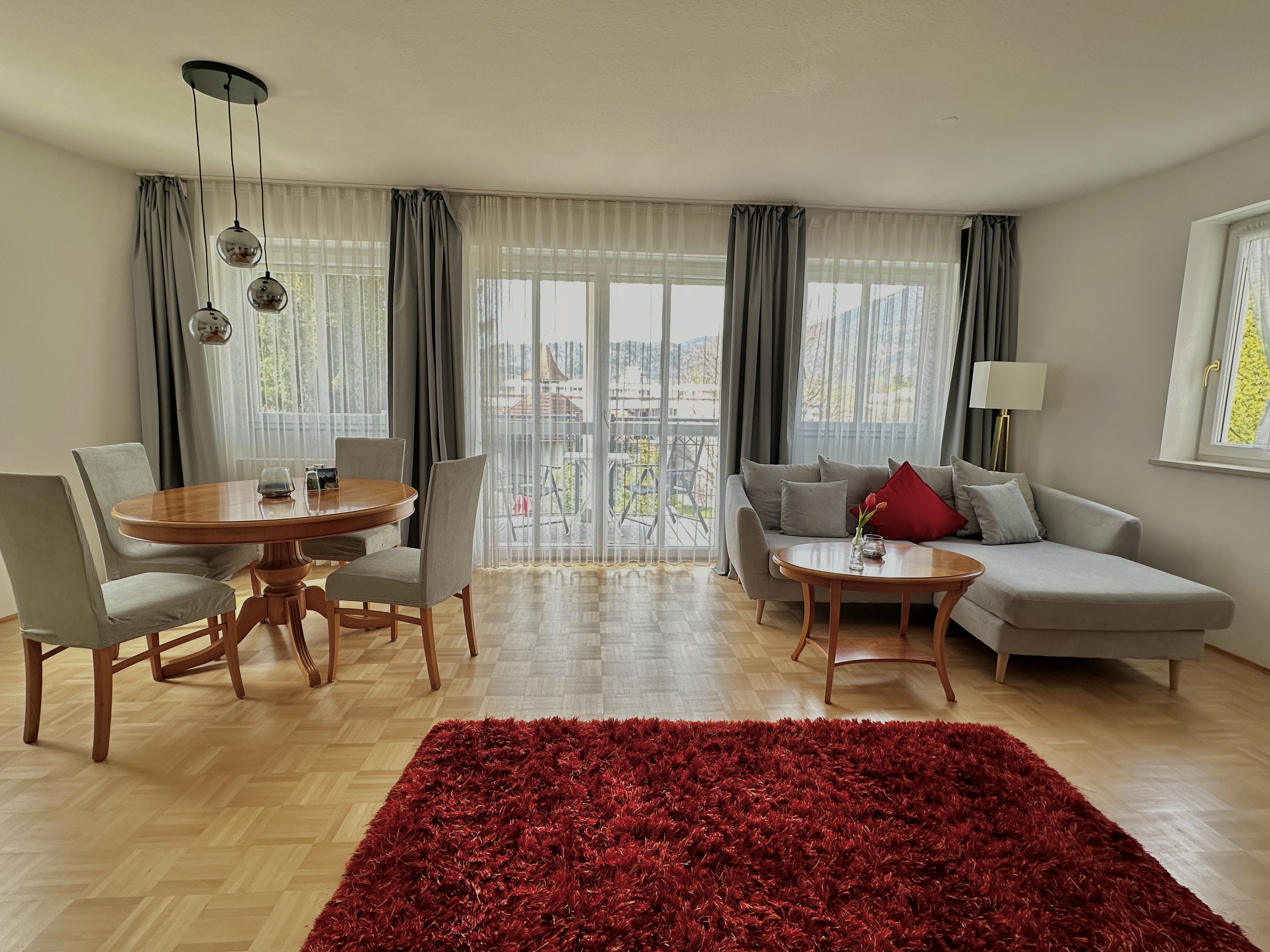 Unser schönes, gemütliches Appartement ist im klassisch- eleganten Stil eingerichtet. Die Wohnung befindet sich im 1. OG und verfügt über ein separates Schlafzimmer mit einem Doppelbett (Boxspringmatratzen - 1,80 x 2,00), ein Wohnzimmer mit Essecke, eine gut ausgestattete Küche mit Geschirrspüler, sowie ein Bad mit Dusche/WC. Auf dem Balkon können Sie das herrliche Bergpanorama der Alpenstadt genießen!