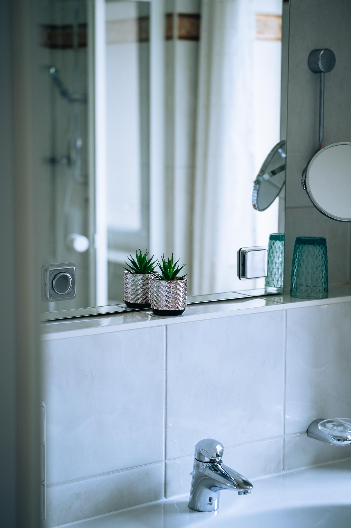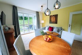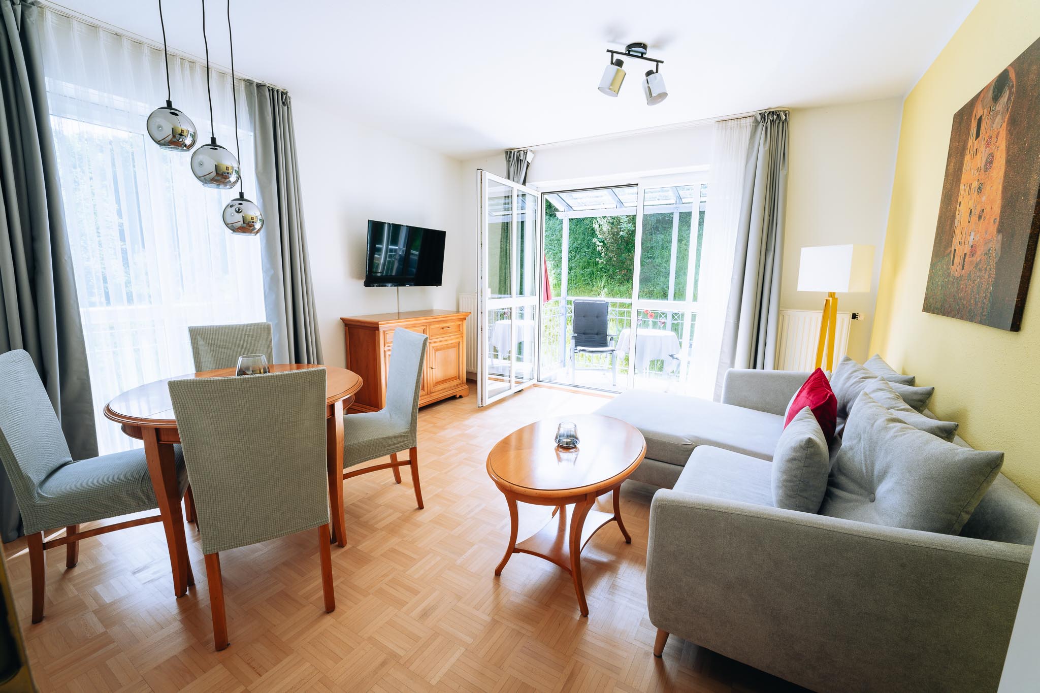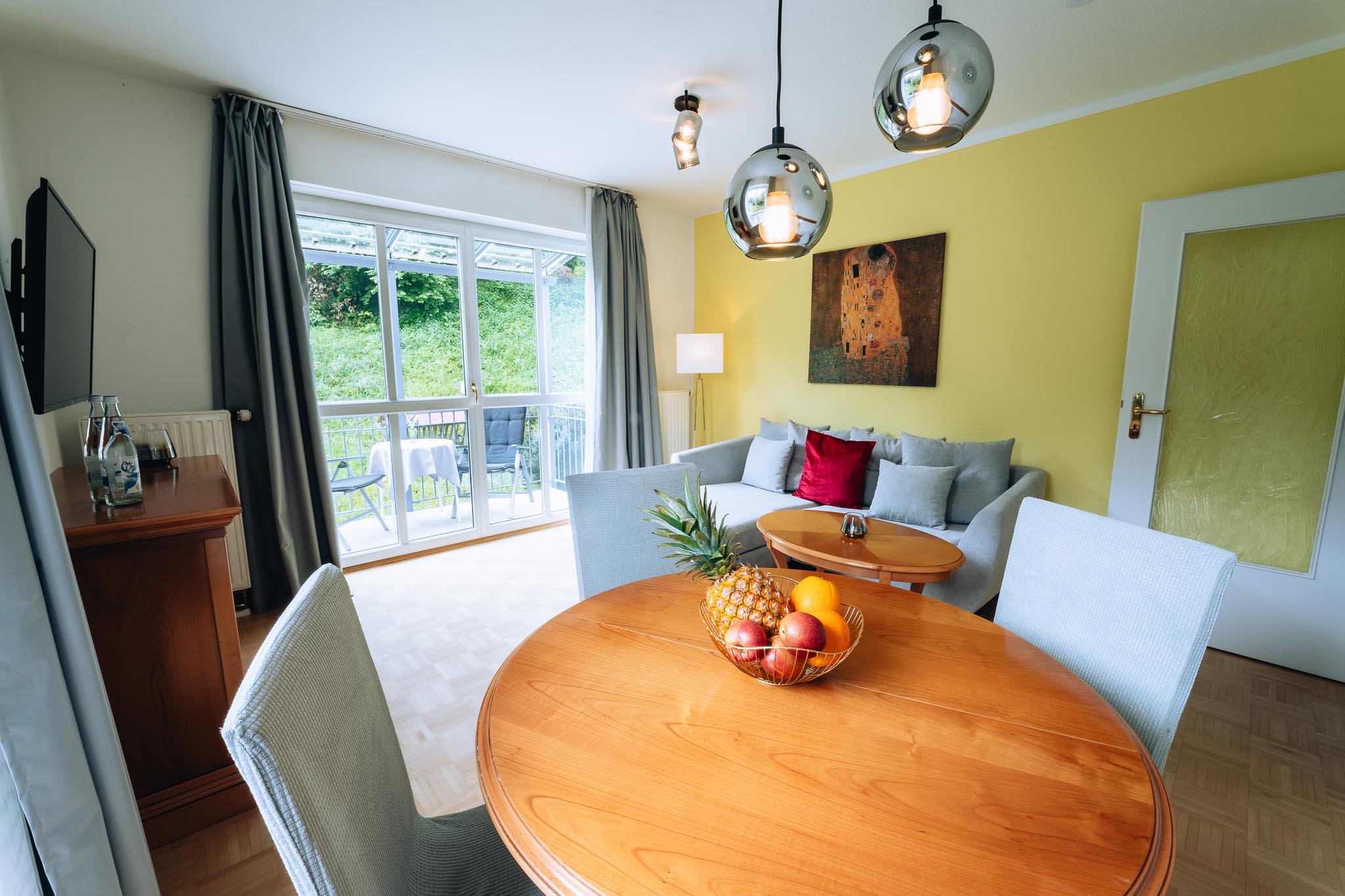 Unser schönes, gemütliches Appartement ist im klassisch- eleganten Stil eingerichtet. Die Wohnung befindet sich im 1. OG und verfügt über ein separates Schlafzimmer mit einem Doppelbett (1,80 x 2,00 - Boxspringmatratzen), ein Wohnzimmer mit Essecke, eine voll ausgestattete Küche mit Geschirrspüler, sowie ein Bad mit Dusche/WC. Von Ihrem Balkon (Ostseite) aus können Sie den Blick in die Natur genießen, wo sie mit etwas Glück manchmal Rehe oder Hasen beobachten können.